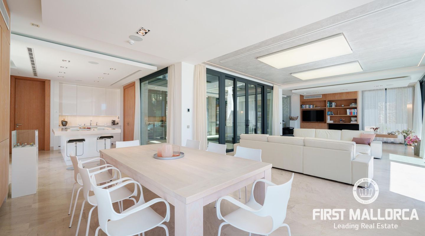 На втором этаже расположена кухня открытой концепции с первоклассной техникой, интегрированная со столовой и гостиной, с выходом на большую террасу с бассейном 48 м2.