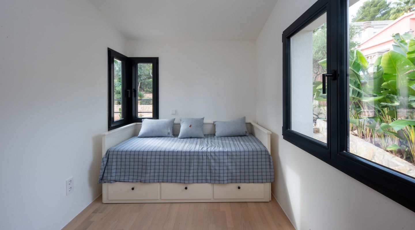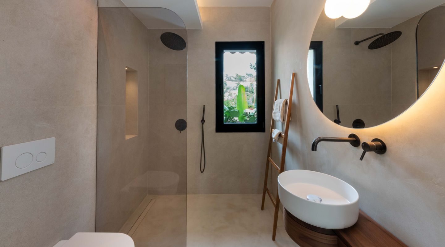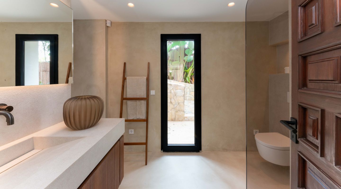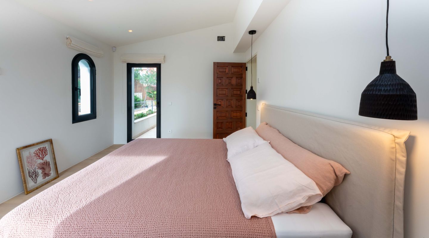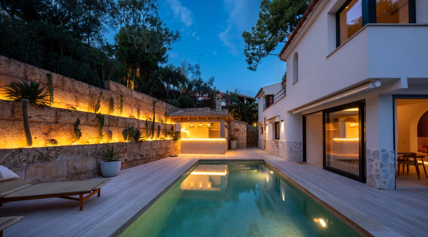Среди преимуществ — частный бассейн, летняя кухня с барбекю, частный сад, высокие потолки, полы из микроцемента и частичный вид на море.