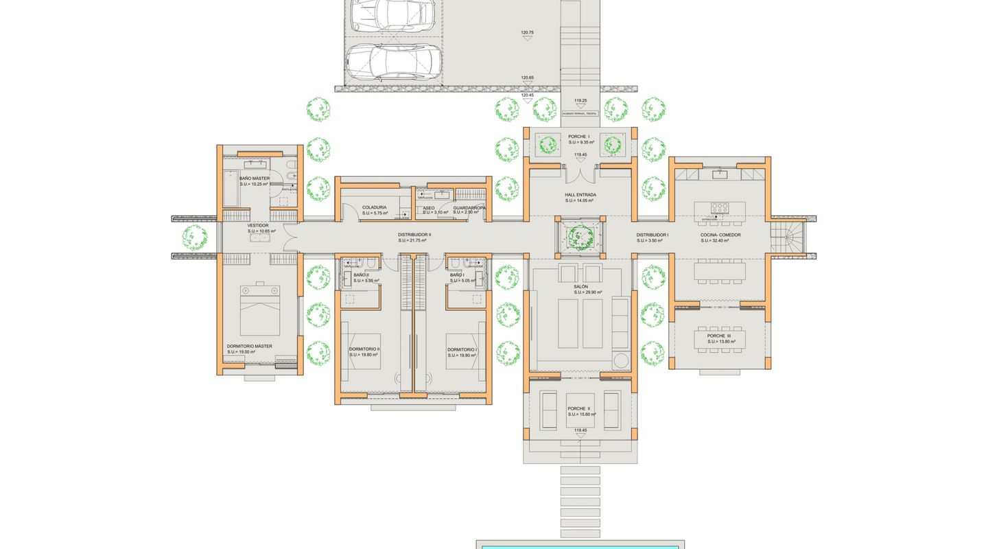 Projektet omfattar en bostad med 3 sovrum och 5 badrum (3 fulla badrum och 2 gästtoaletter), med 346 m² användbar yta och 371 m² byggd yta, utformad för att intelligent separera sociala och privata områden, maximera naturligt ljus, fri utsikt och daglig bekvämlighet. Höjdpunkter inkluderar:
