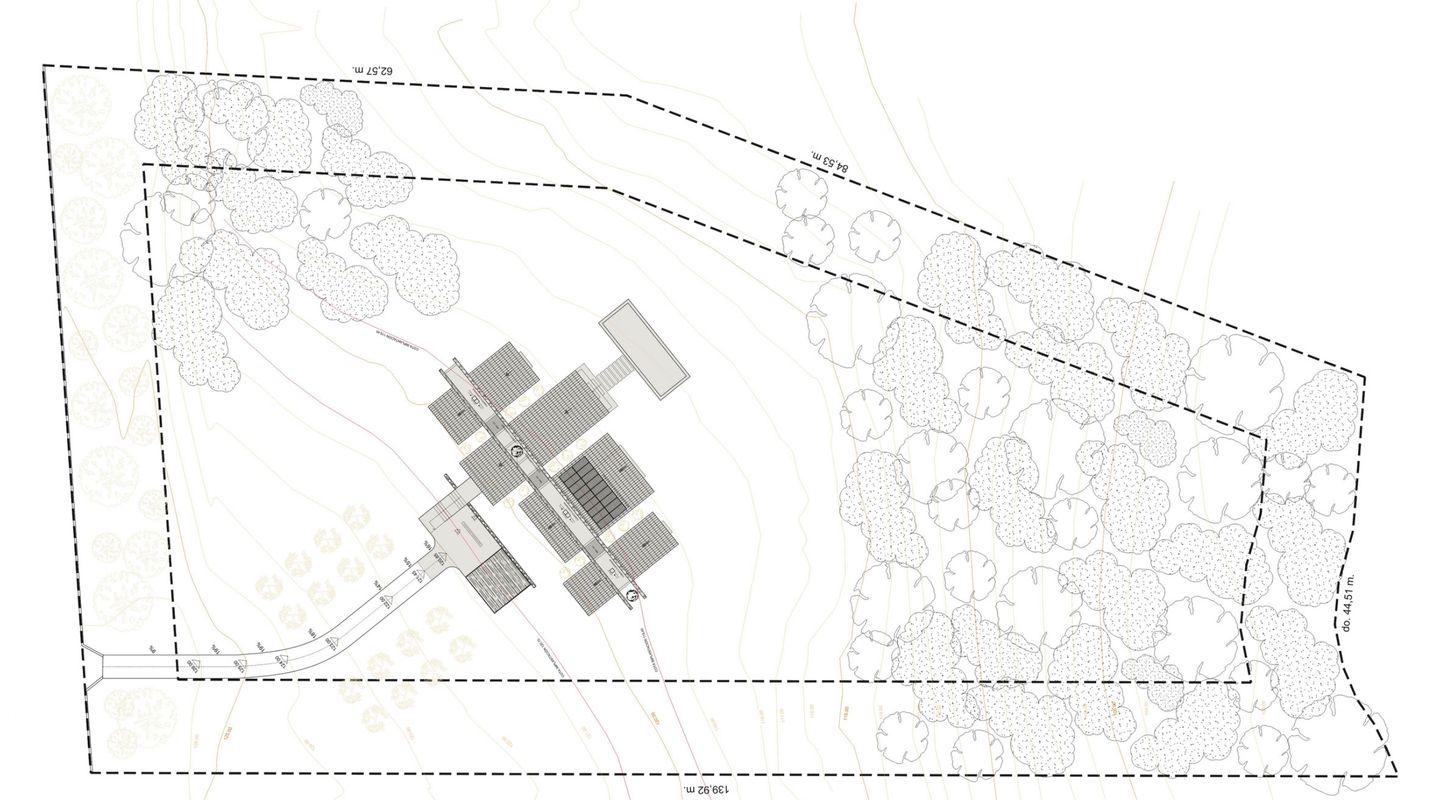Utomhus finns en 50 m² stor swimmingpool, två täckta verandor för utomhusliv, parkering för två bilar och en naturmiljö omgiven av träd, vilket säkerställer privatliv och lugn. Tomtens lätt sluttande terräng används för panoramautsikt och harmonisk integration i landskapet.