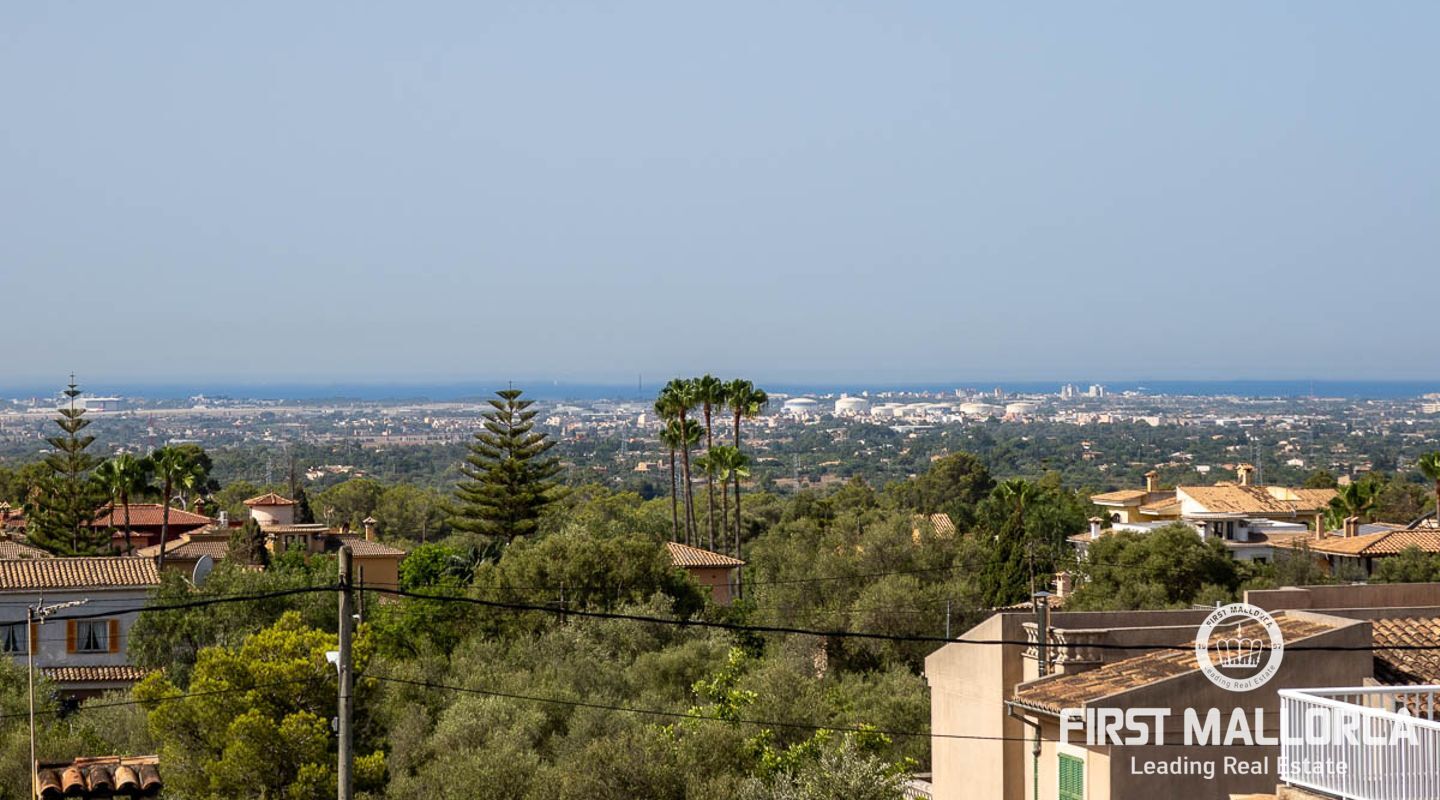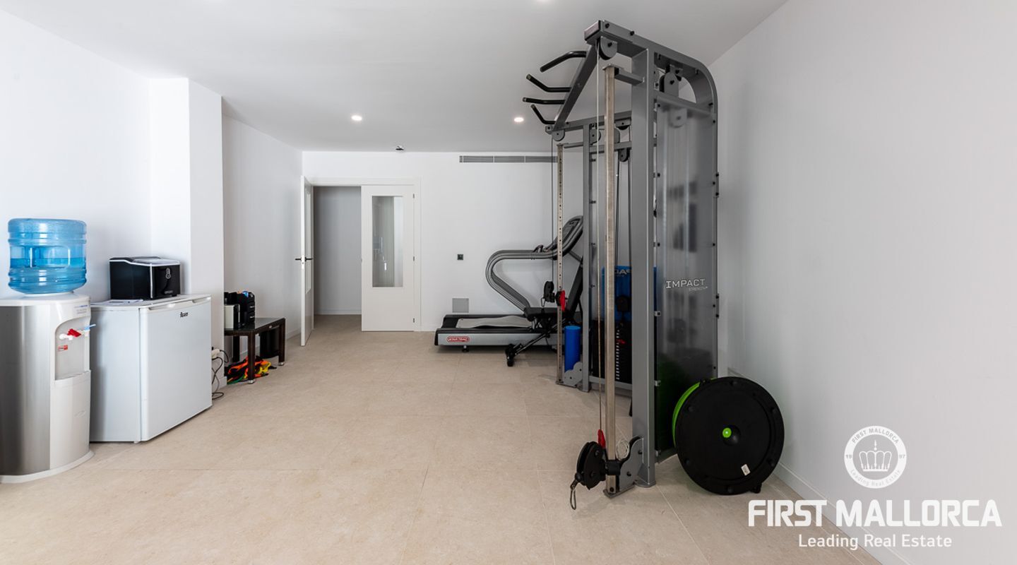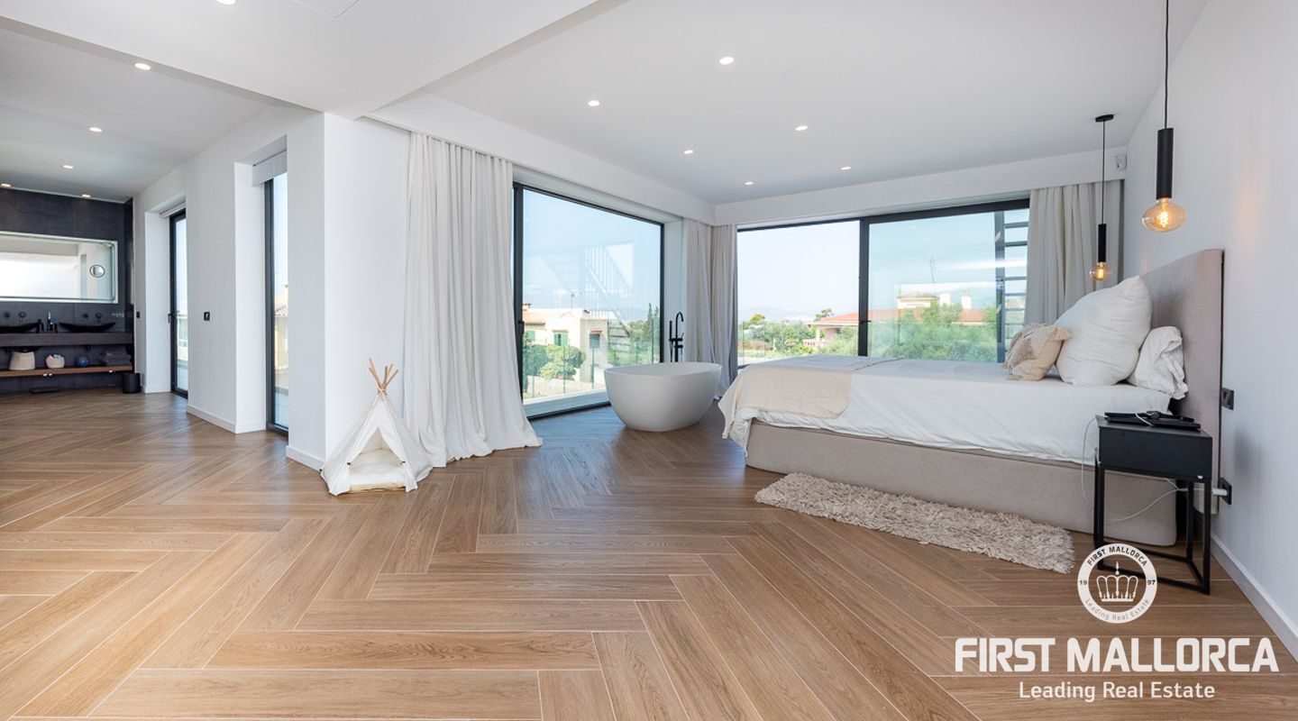 Trappan i entréhallen med 8 m höga glaselement leder till master-sviten på första våningen. Ett helt avskalat utrymme som kombinerar master bedroom med delvis utsikt över Palmas kust och ett fristående badrum med omklädningsrum, turkiskt bad, toalett och dusch med bänk. Ett fjärde sovrum kan skapas i detta område om det behövs. Från denna våning finns tillgång till en balkong på framsidan av fastigheten samt till den stora terrassen med utsikt över poolen och trädgården och en trappa som leder till en takterrass med vatten- och elförsörjning.