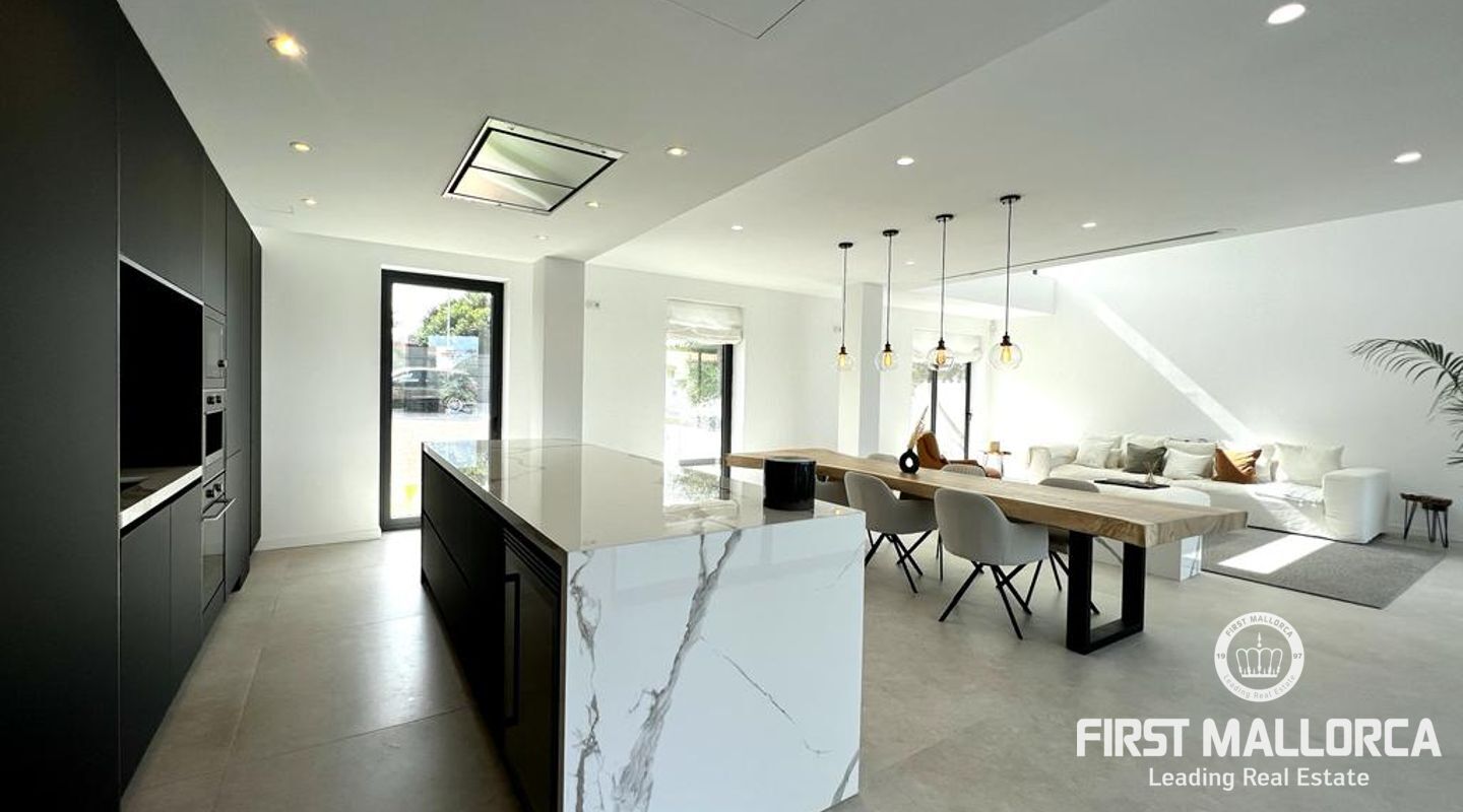 Denna ljusa villa på cirka 401 m2 nära Palma färdigställdes 2022. På bottenvåningen finns ett rymligt vardagsrum/matsal med öppen planlösning och elektrisk bioetanolspis, ett fullt utrustat kök med köksö och integrerad osynlig induktionshäll i toppmoderna "Cooking Surface" porslinskakel med marmorutseende. Stora fönster från golv till tak på båda sidor och dubbel höjd säkerställer maximalt naturligt ljus och en generös känsla av utrymme. Två sovrum med utgång till terrassen delar på ett badrum med dusch.