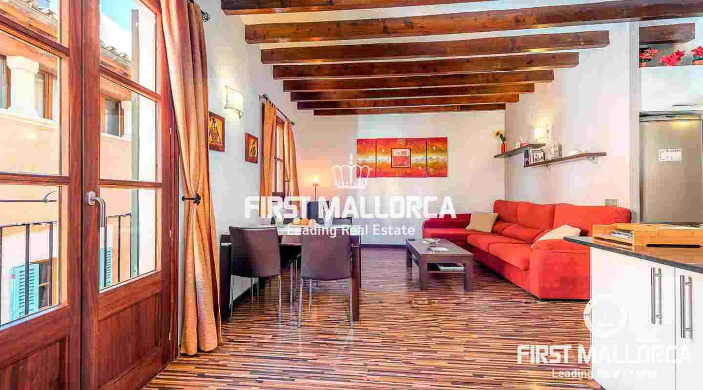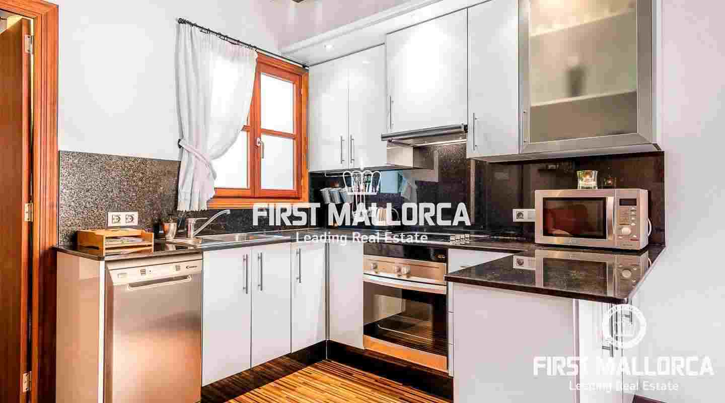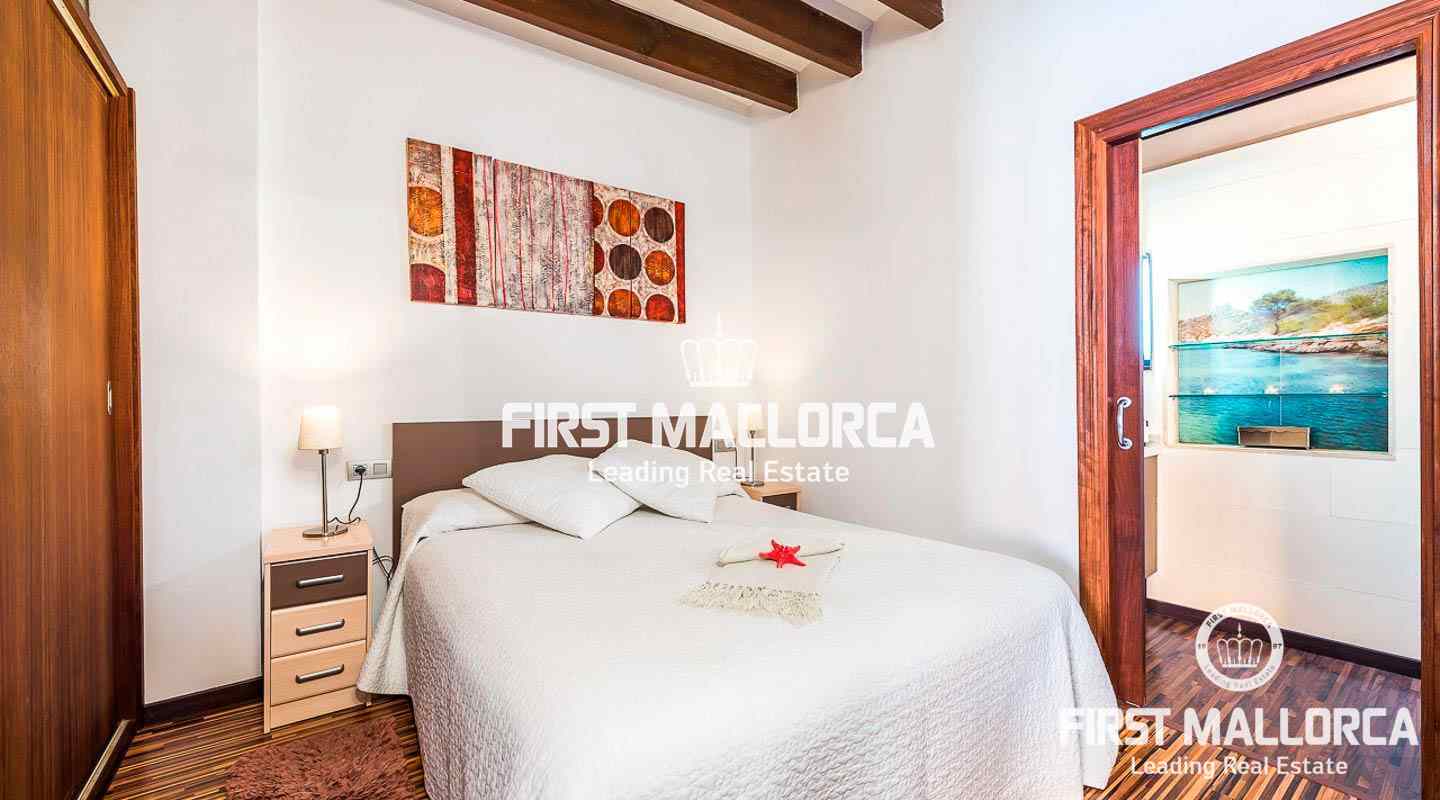 Det har högt i tak och karakteristiska synliga träbjälkar. Denna vackra lägenhet är totalrenoverad och fullt möblerad. Den har ett generöst stort sovrum med eget badrum. Vardagsrummet är söderorienterat och erbjuder havsutsikt från balkongen.