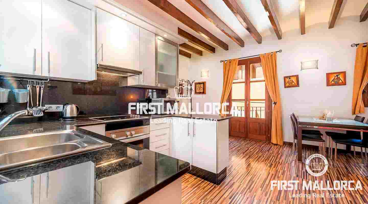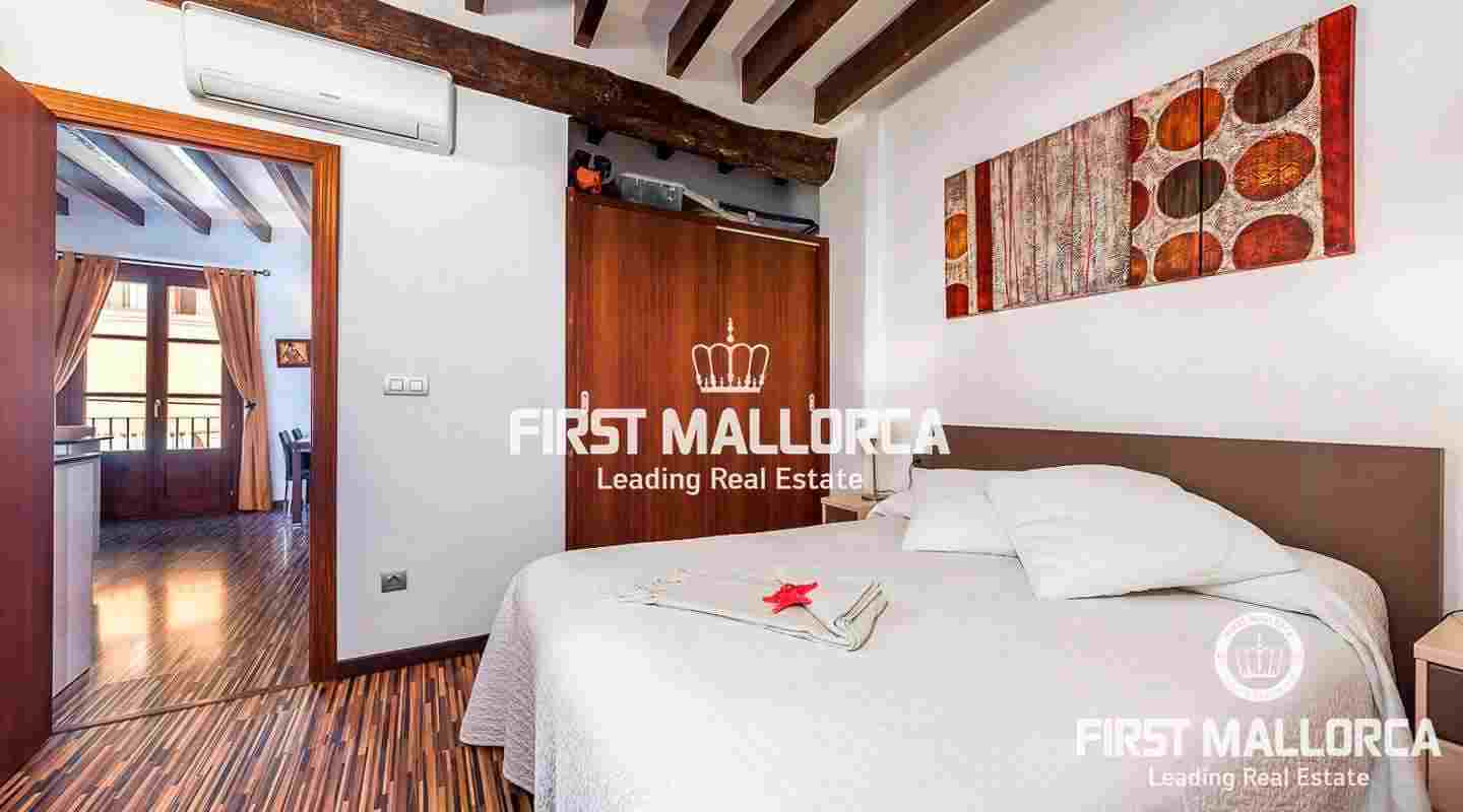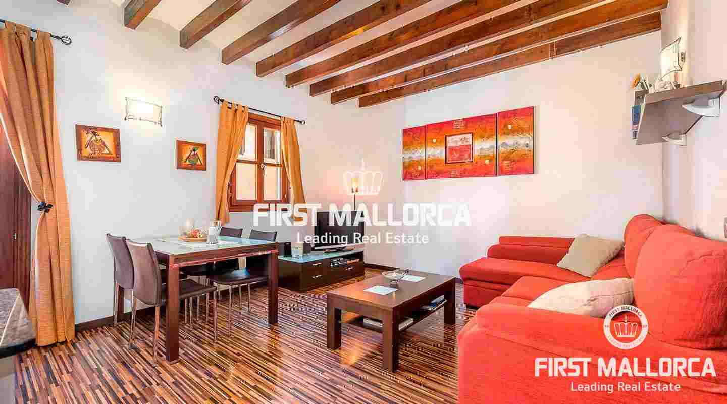 Det har högt i tak och karakteristiska synliga träbjälkar. Denna vackra lägenhet är totalrenoverad och fullt möblerad. Den har ett generöst stort sovrum med eget badrum. Vardagsrummet är söderorienterat och erbjuder havsutsikt från balkongen.