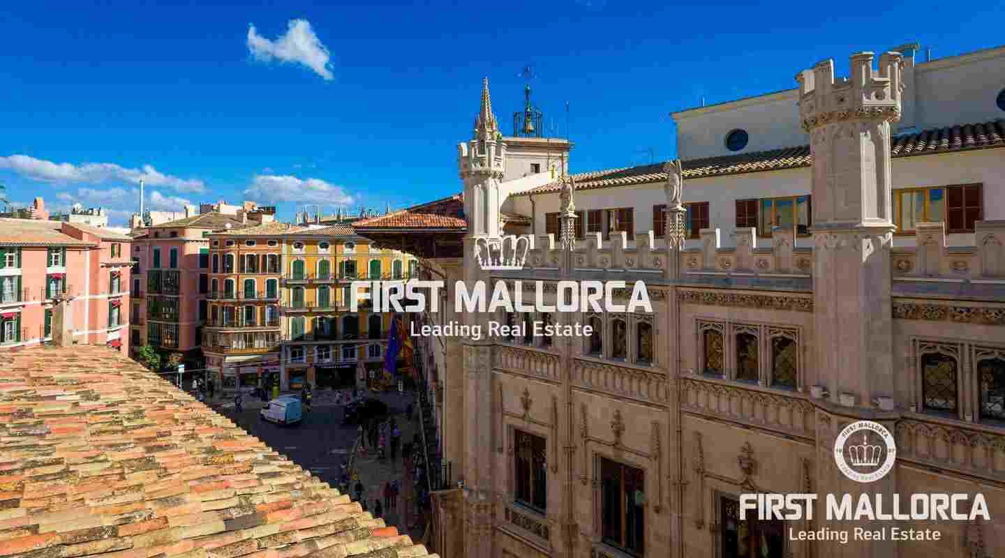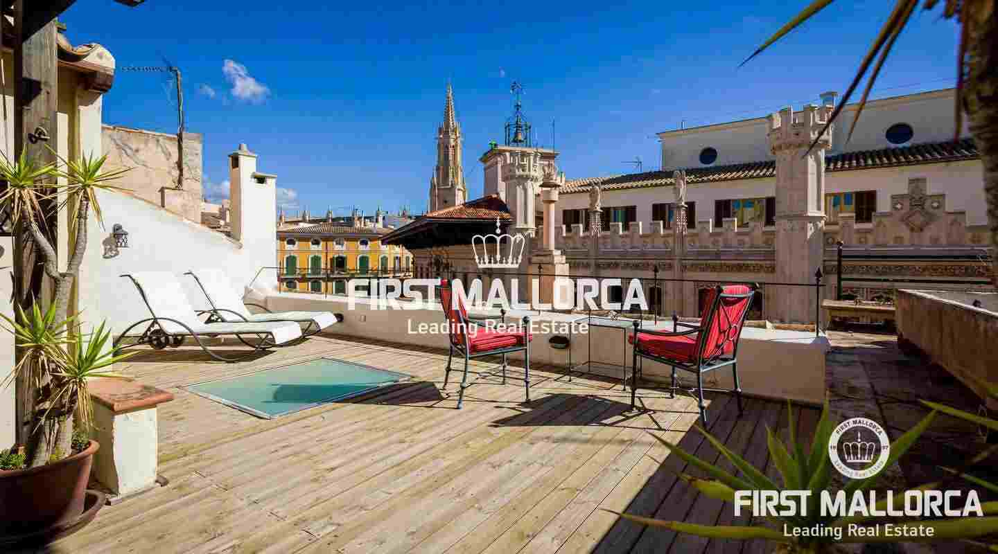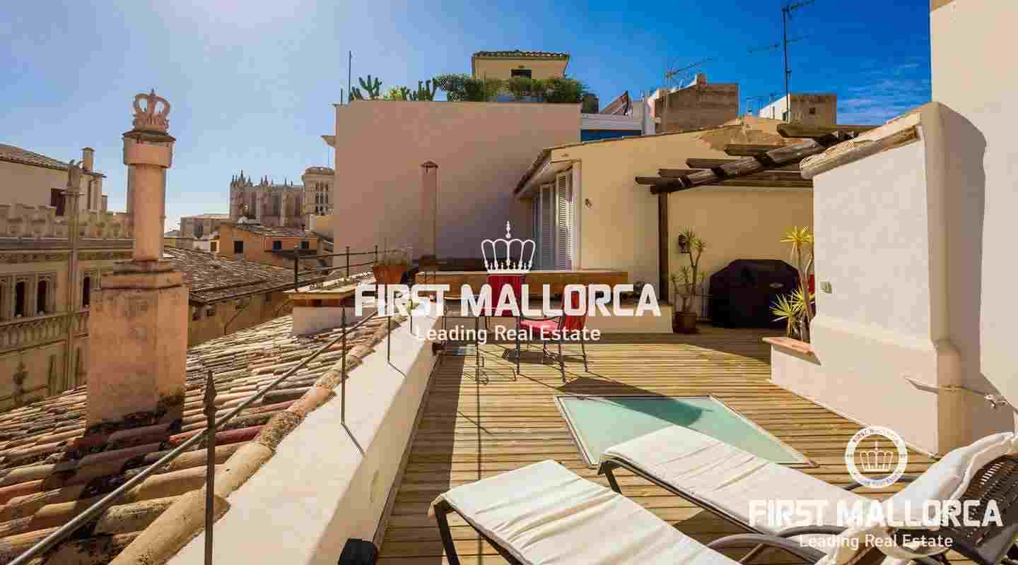 Denna lägenhet med ett utmärkt och privilegierat läge i hjärtat av Palma de Mallorca har en fantastisk stor terrass på 55 m² med magnifik utsikt över den gamla stadens takåsar.
