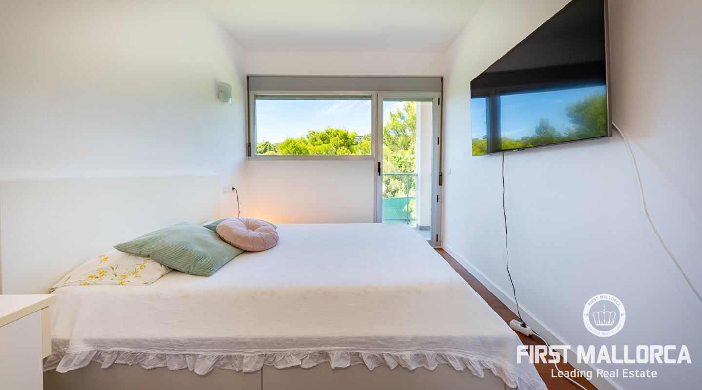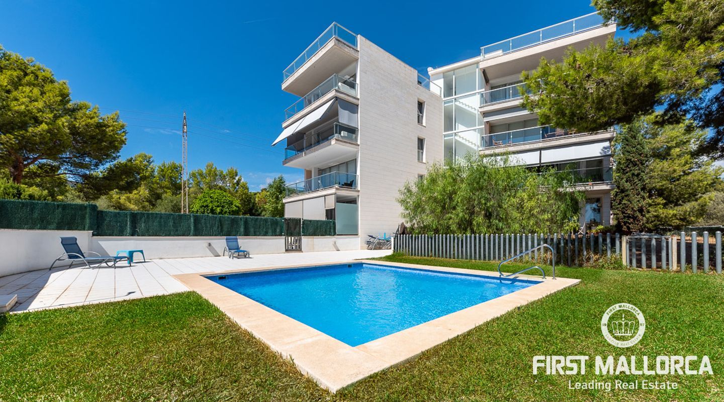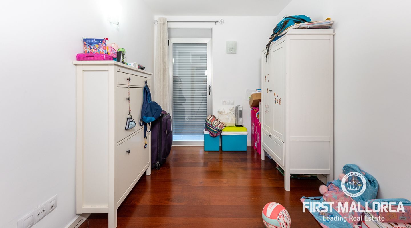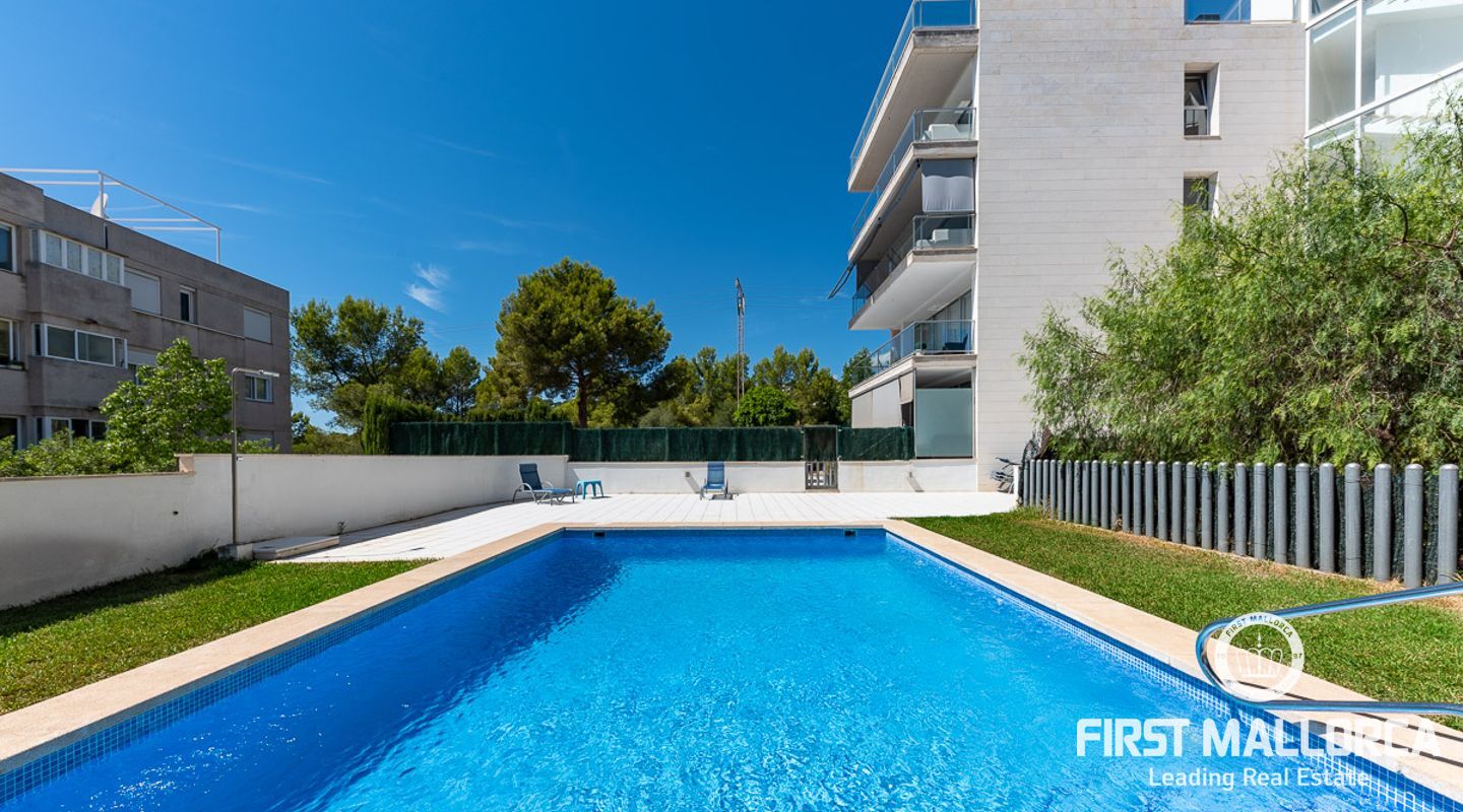 Denna välskötta lägenhet med 4 sovrum, på gångavstånd till Puerto Portals, ligger i ett litet samhälle med endast 8 ägare. Som gemensamhetsutrymmen finns en utomhuspool omgiven av en plan gräsmatta med solstolar, ett garage och en hiss. Lägenheten erbjuder ett spikat och ljusinsläppt vardagsrum/matsal med en 18 kvm stor terrass i söderläge med utsikt över den gemensamma poolen. Köket har förnyats 2021 och det finns två badrum, ett med badkar och det egna stora badrummet med en walk-in-dusch. I hela lägenheten har du trägolv och ett genomfört luftkonditioneringssystem varmt och kallt. Platsen har en mycket bra infrastruktur med shoppingmöjligheter, restauranger och internationella skolor inom gångavstånd.
