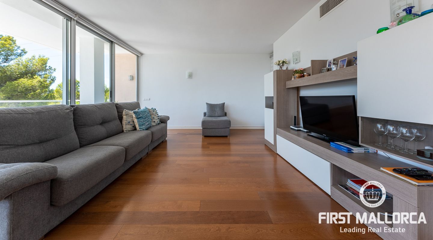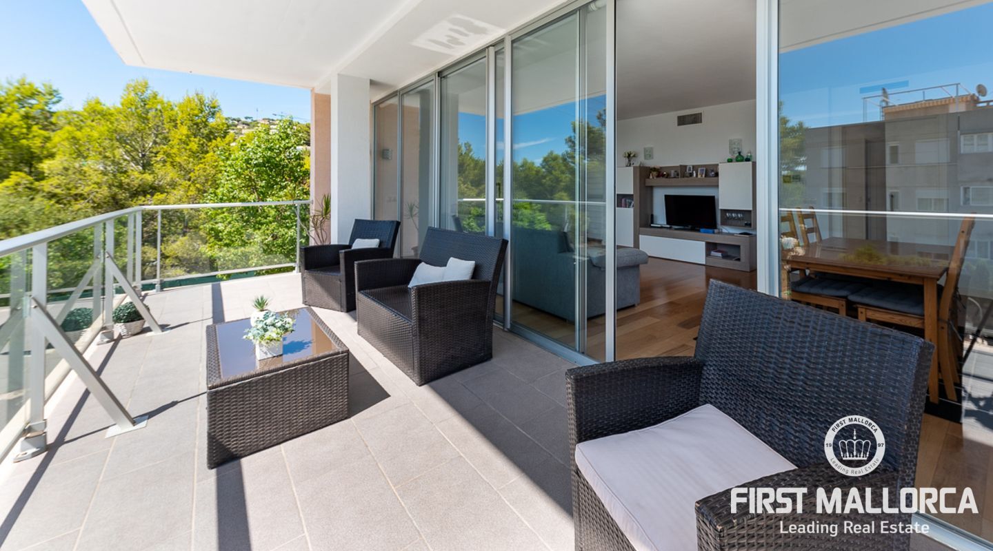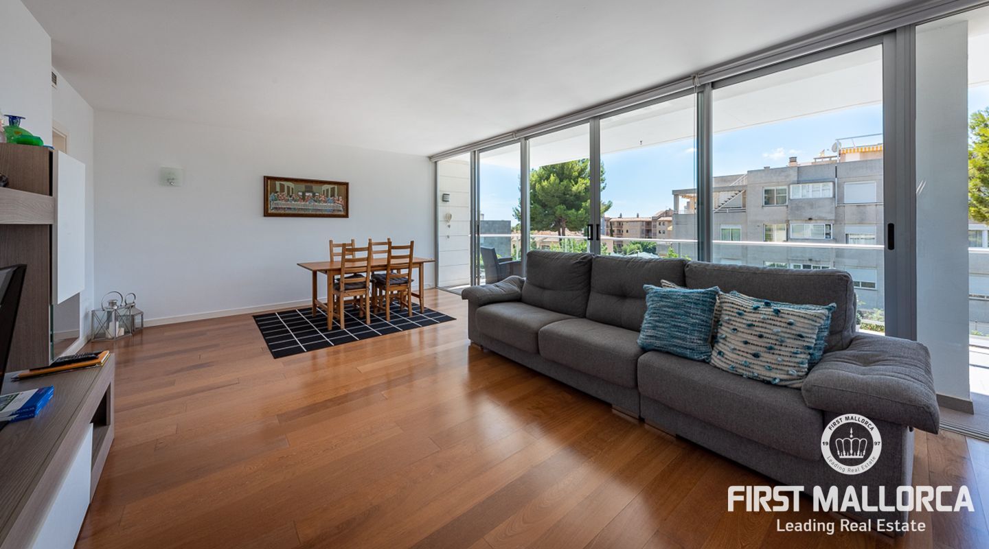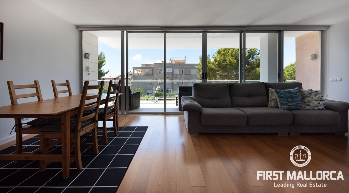Denna välskötta lägenhet med 4 sovrum, på gångavstånd till Puerto Portals, ligger i ett litet samhälle med endast 8 ägare. Som gemensamhetsutrymmen finns en utomhuspool omgiven av en plan gräsmatta med solstolar, ett garage och en hiss. Lägenheten erbjuder ett spikat och ljusinsläppt vardagsrum/matsal med en 18 kvm stor terrass i söderläge med utsikt över den gemensamma poolen. Köket har förnyats 2021 och det finns två badrum, ett med badkar och det egna stora badrummet med en walk-in-dusch. I hela lägenheten har du trägolv och ett genomfört luftkonditioneringssystem varmt och kallt. Platsen har en mycket bra infrastruktur med shoppingmöjligheter, restauranger och internationella skolor inom gångavstånd.