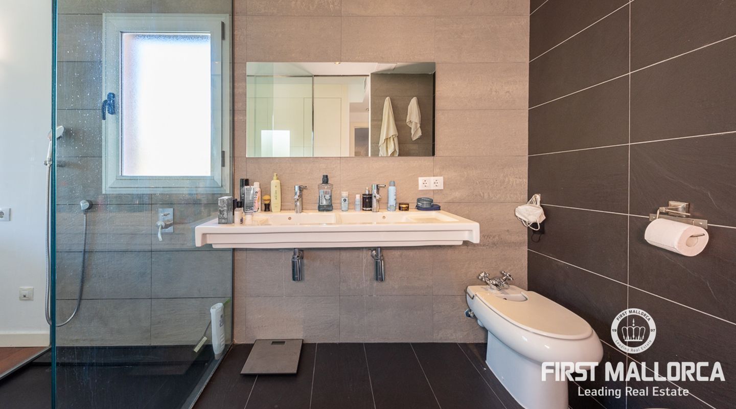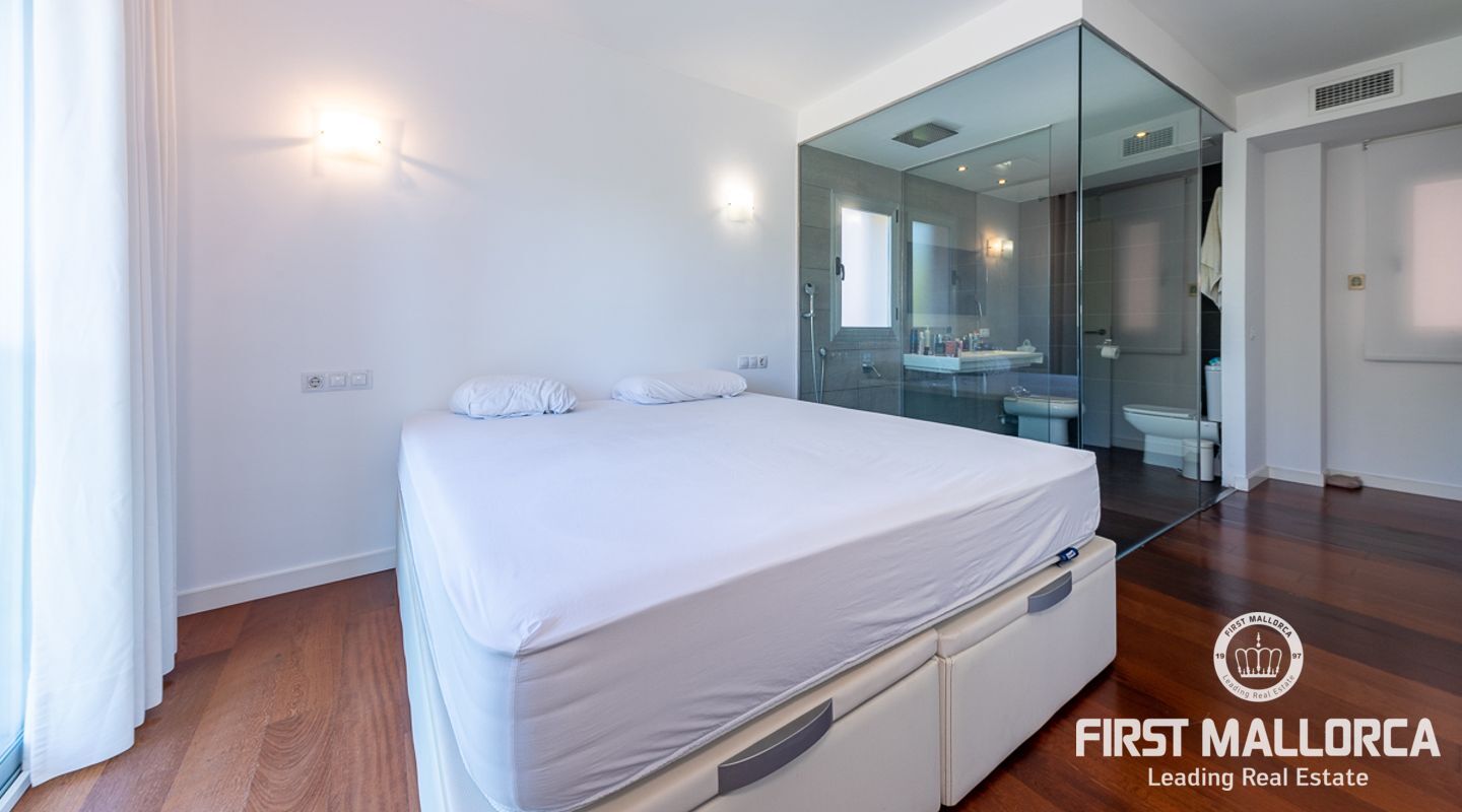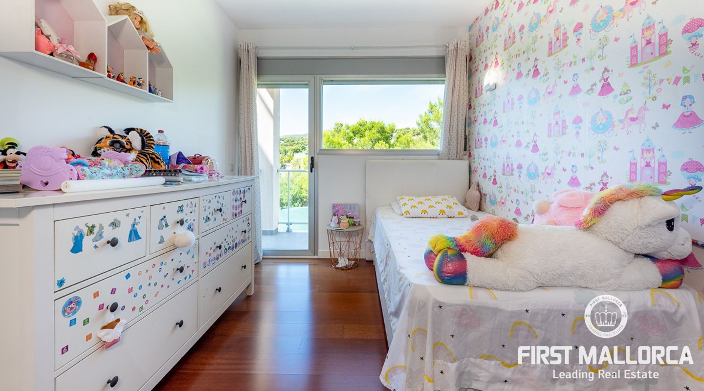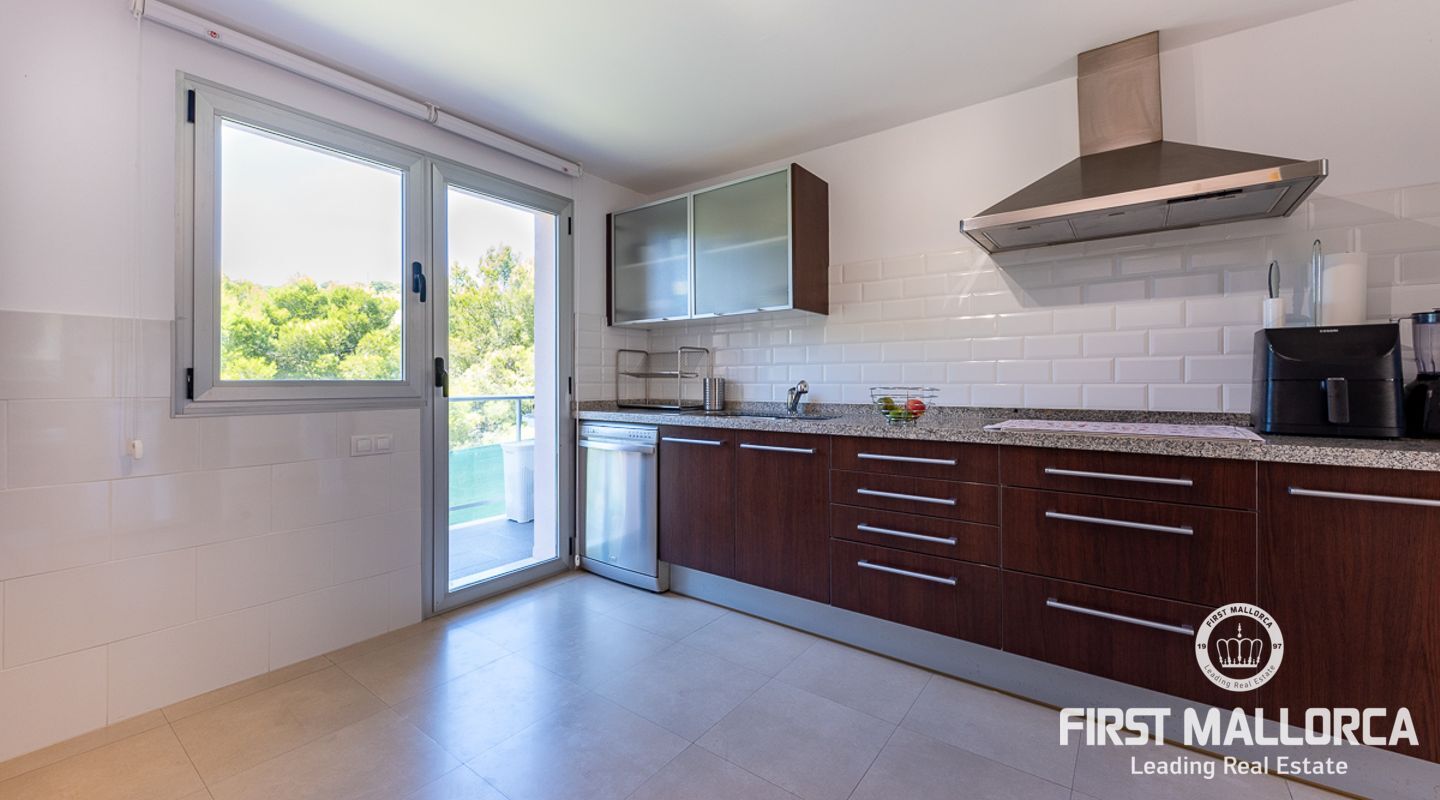 Denna välskötta lägenhet med 4 sovrum, på gångavstånd till Puerto Portals, ligger i ett litet samhälle med endast 8 ägare. Som gemensamhetsutrymmen finns en utomhuspool omgiven av en plan gräsmatta med solstolar, ett garage och en hiss. Lägenheten erbjuder ett spikat och ljusinsläppt vardagsrum/matsal med en 18 kvm stor terrass i söderläge med utsikt över den gemensamma poolen. Köket har förnyats 2021 och det finns två badrum, ett med badkar och det egna stora badrummet med en walk-in-dusch. I hela lägenheten har du trägolv och ett genomfört luftkonditioneringssystem varmt och kallt. Platsen har en mycket bra infrastruktur med shoppingmöjligheter, restauranger och internationella skolor inom gångavstånd.