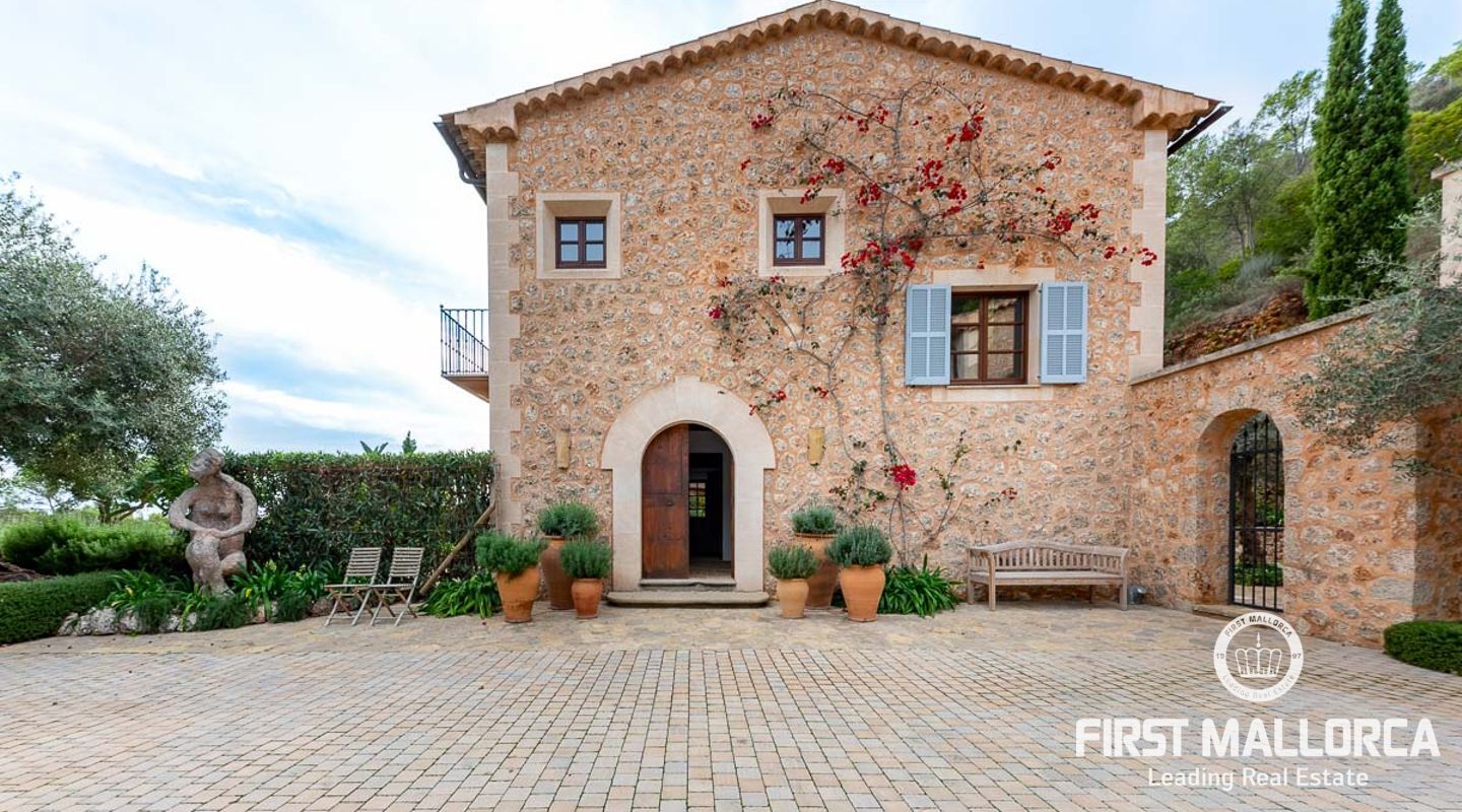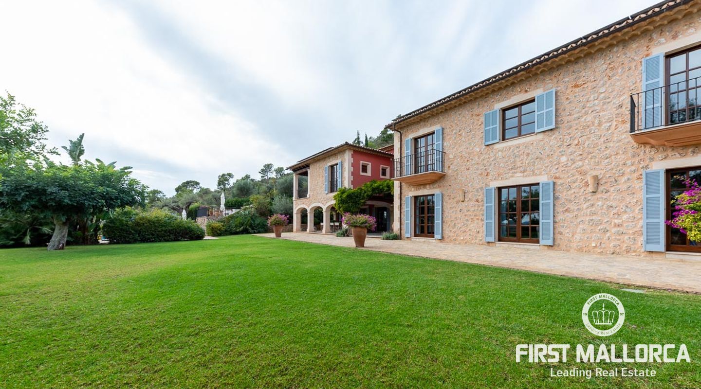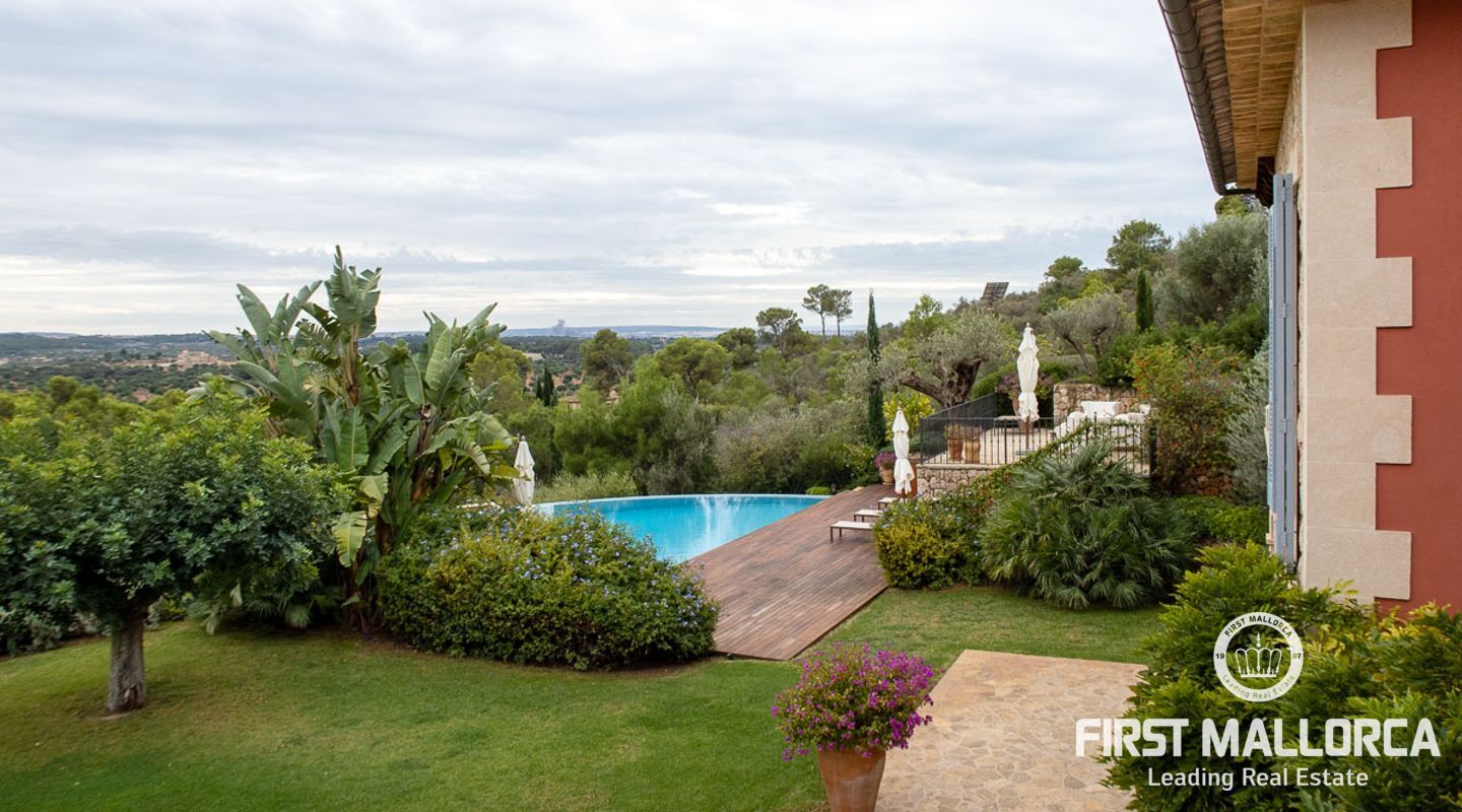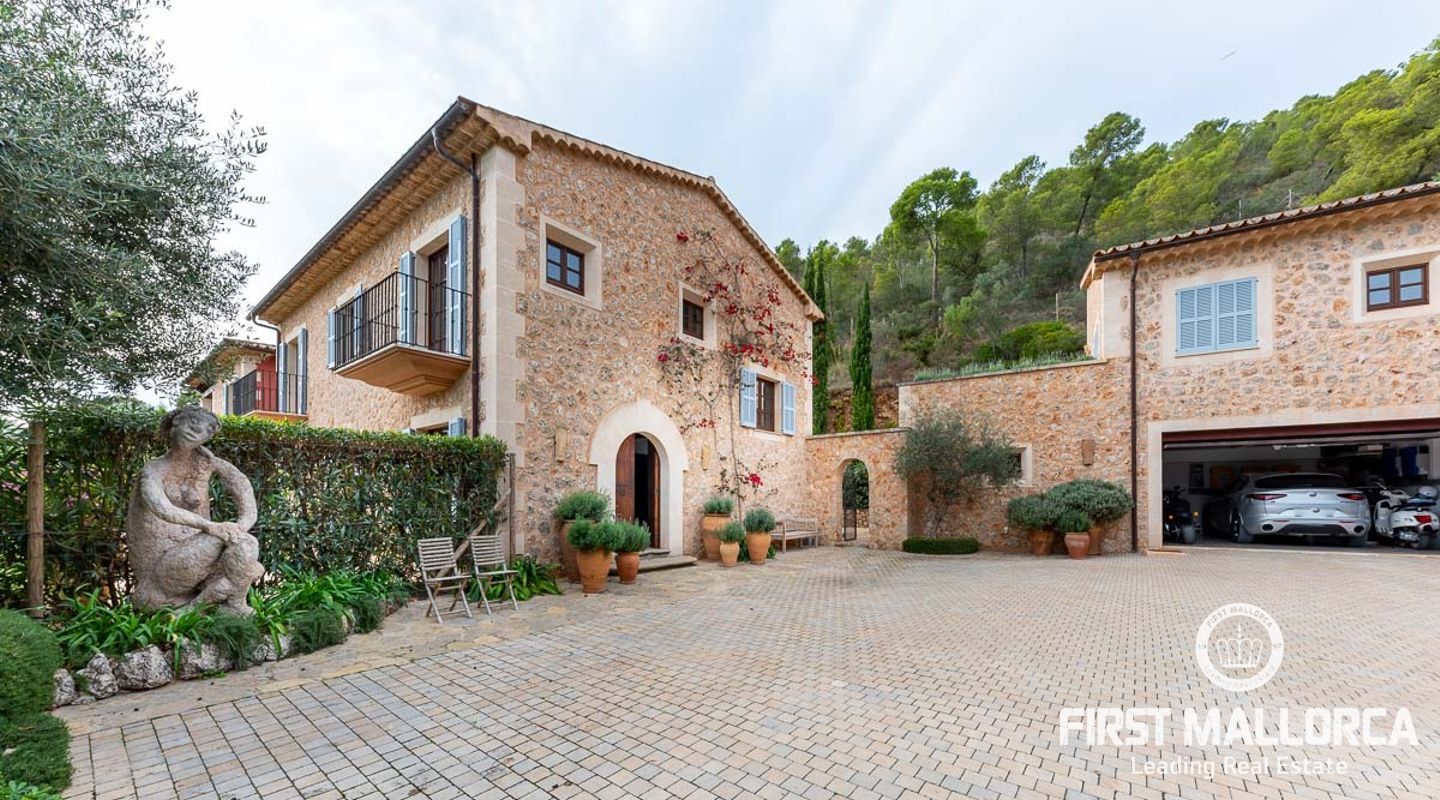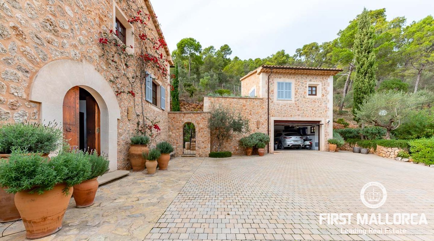 Denna vackra finca mellan Santa Maria och Bunyola, med snabb förbindelse till centrala Palma och flygplatsen Son San Joan, ligger i en naturmiljö utan motstycke. På toppen av ett bergsmassiv, med hisnande utsikt och i ett helt inhägnad och säkrat område. De ca 30.000 m2 mark är perfekt kombinerat med ett underbart landskapsarkitektur och trädgårdsarbete projekt. När du öppnar huvudporten kommer du in i en myriad av inhemska växter och blommor, som leker med sina former och former när du går upp till Fincas huvudingång, allt perfekt planerat, utformat och utformat. När vi kommer fram till huvudentrén möts vi av en sober och kraftfull byggnad som påminner om de mest typiska byggnaderna på Mallorca. Fasaderna, stenarna och materialen är en perfekt kombination av texturer och färger, vilket vittnar om den höga kvalitet som använts vid byggandet. Du kan redan känna vad som väntar dig bakom de vackra antika trädörrarna. ..... massor av ljus, öppna ytor, kvalitet och enastående utsikt! Fem sovrum alla med eget badrum och två gästlägenheter, en saltvattenpool på ca 80 m2, öppna och täckta terrasser som följer solens gång, ädla material som ekgolv av Schotten & Hansen, designkök av Birgitt Müller, tunga och starka träbjälkar i taket, natursten överallt och varje rum flyter in i nästa som om det vore en öppen yta. Om vi talar om den tekniska sidan är vi förvånade över att se att denna finca är helt självförsörjande och dess energikategori är den högsta möjliga A, vilket är mycket svårt att hitta på ön. Den är självförsörjande med sin egen vattenförsörjning med olika uttag, en solcellsstation och en dieselgenerator, luftkonditionering, golvvärme, larmsystem, musikkrets i hela Finca och många fler extrafunktioner. Ett dubbelgarage, gym, vinkällare, automatiskt bevattningssystem som täcker från grinden på gatunivå till det sista hörnet av huvudbyggnaden, är några av de extrafunktioner som avrundar denna trevliga och lugna fristad i en privilegierad miljö. I det här fallet kan vi skriva PRIVACY med stora bokstäver!