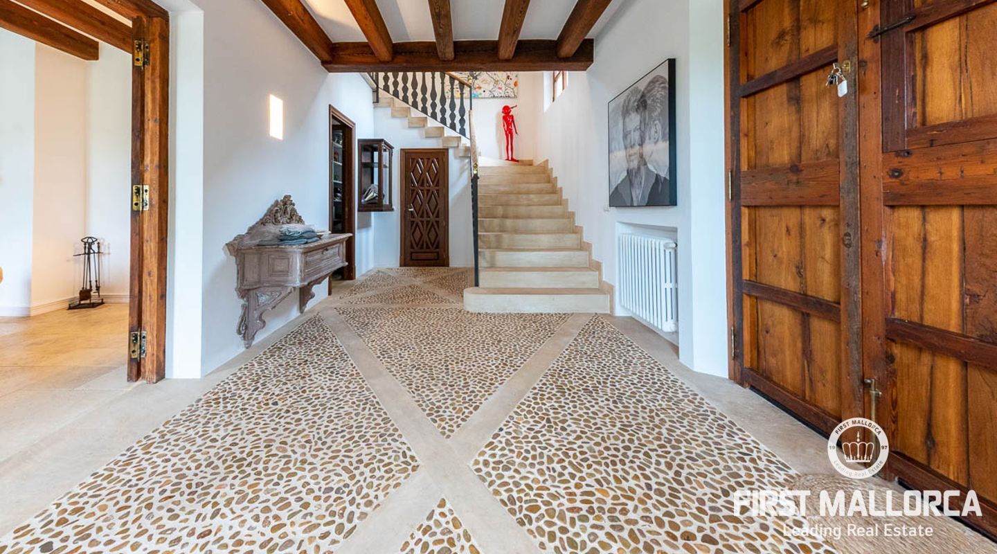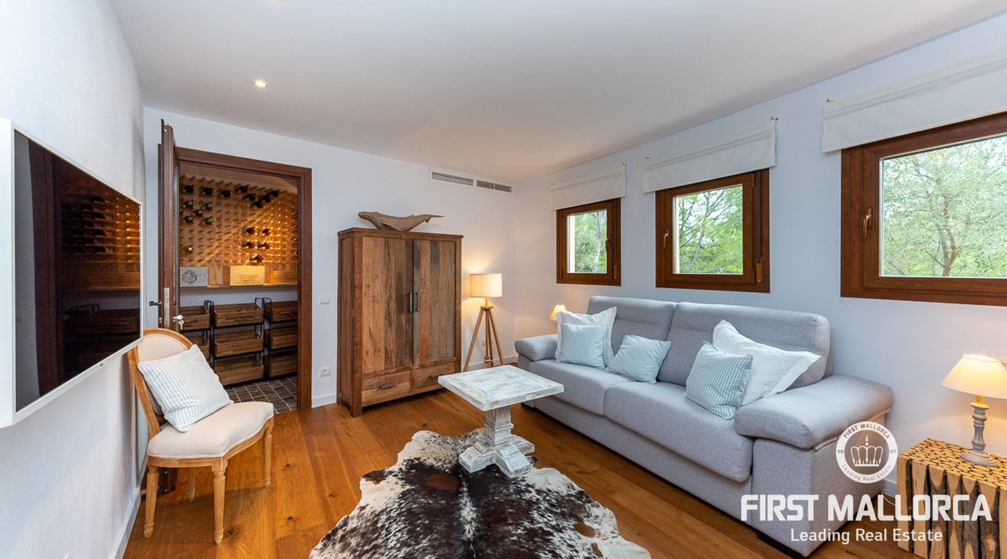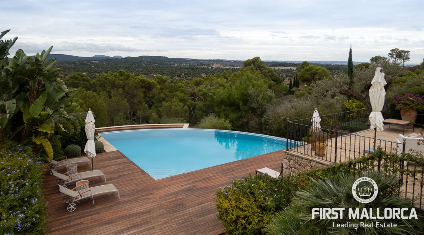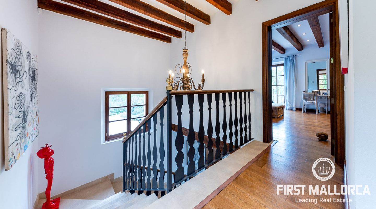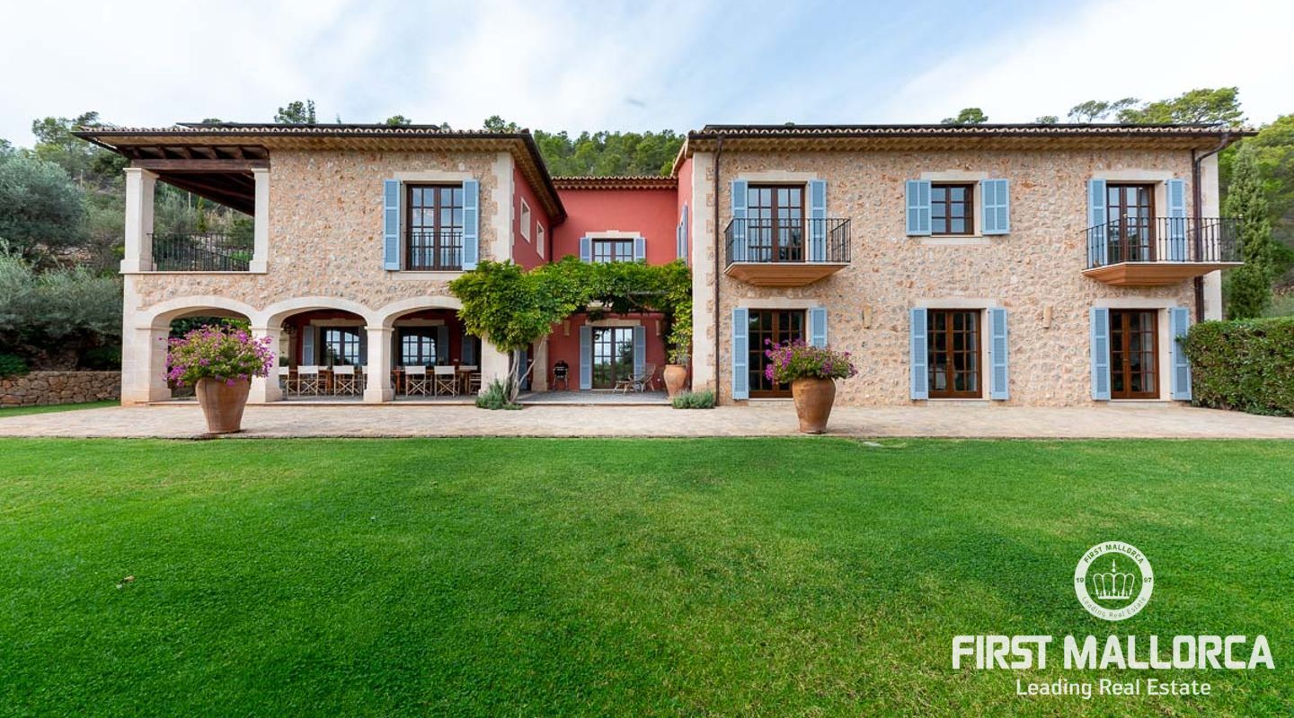 Denna vackra finca mellan Santa Maria och Bunyola, med snabb förbindelse till centrala Palma och flygplatsen Son San Joan, ligger i en naturmiljö utan motstycke. På toppen av ett bergsmassiv, med hisnande utsikt och i ett helt inhägnad och säkrat område. De ca 30.000 m2 mark är perfekt kombinerat med ett underbart landskapsarkitektur och trädgårdsarbete projekt. När du öppnar huvudporten kommer du in i en myriad av inhemska växter och blommor, som leker med sina former och former när du går upp till Fincas huvudingång, allt perfekt planerat, utformat och utformat. När vi kommer fram till huvudentrén möts vi av en sober och kraftfull byggnad som påminner om de mest typiska byggnaderna på Mallorca. Fasaderna, stenarna och materialen är en perfekt kombination av texturer och färger, vilket vittnar om den höga kvalitet som använts vid byggandet. Du kan redan känna vad som väntar dig bakom de vackra antika trädörrarna. ..... massor av ljus, öppna ytor, kvalitet och enastående utsikt! Fem sovrum alla med eget badrum och två gästlägenheter, en saltvattenpool på ca 80 m2, öppna och täckta terrasser som följer solens gång, ädla material som ekgolv av Schotten & Hansen, designkök av Birgitt Müller, tunga och starka träbjälkar i taket, natursten överallt och varje rum flyter in i nästa som om det vore en öppen yta. Om vi talar om den tekniska sidan är vi förvånade över att se att denna finca är helt självförsörjande och dess energikategori är den högsta möjliga A, vilket är mycket svårt att hitta på ön. Den är självförsörjande med sin egen vattenförsörjning med olika uttag, en solcellsstation och en dieselgenerator, luftkonditionering, golvvärme, larmsystem, musikkrets i hela Finca och många fler extrafunktioner. Ett dubbelgarage, gym, vinkällare, automatiskt bevattningssystem som täcker från grinden på gatunivå till det sista hörnet av huvudbyggnaden, är några av de extrafunktioner som avrundar denna trevliga och lugna fristad i en privilegierad miljö. I det här fallet kan vi skriva PRIVACY med stora bokstäver!