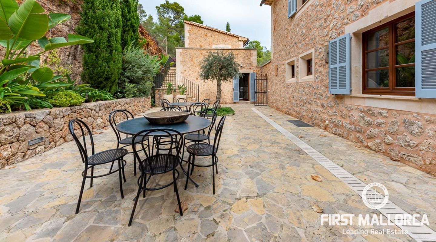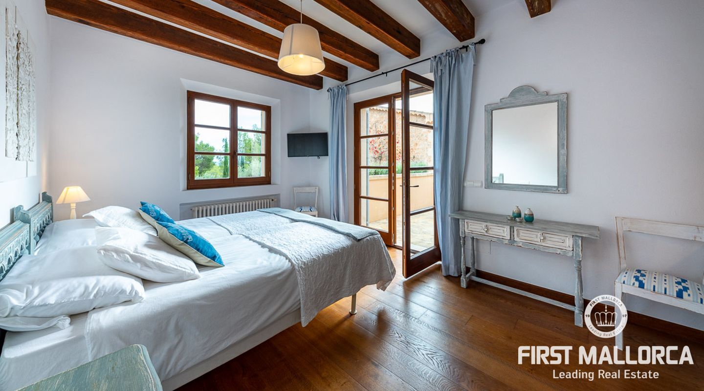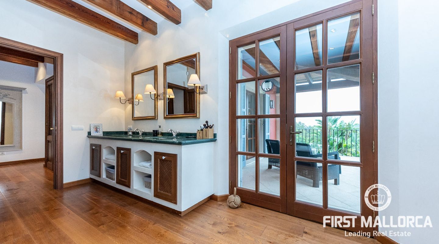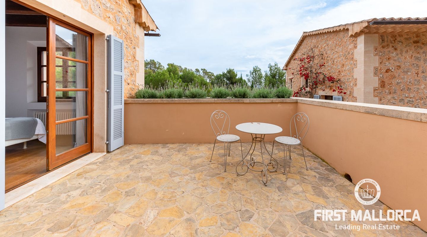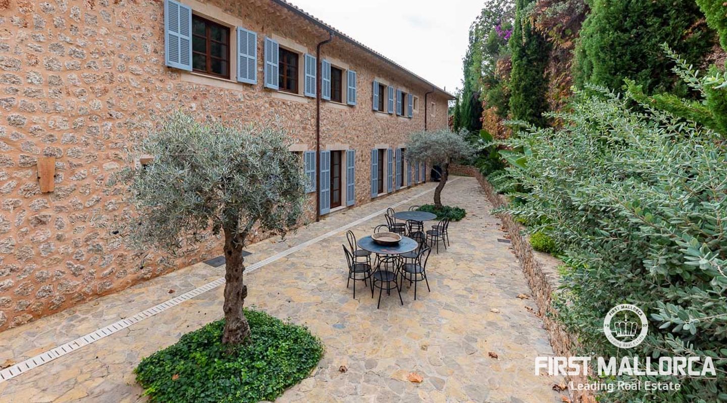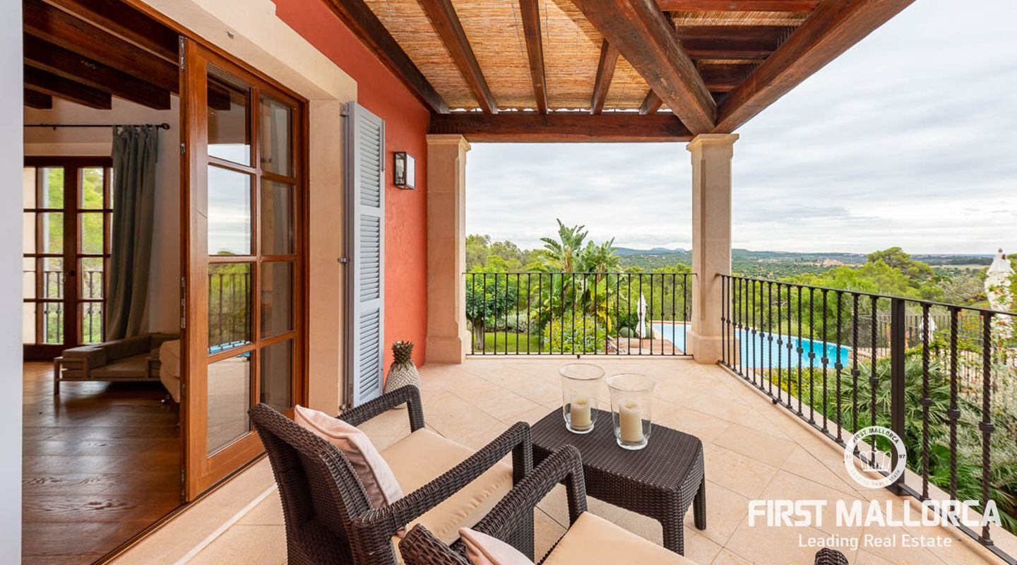 Denna vackra finca mellan Santa Maria och Bunyola, med snabb förbindelse till centrala Palma och flygplatsen Son San Joan, ligger i en naturmiljö utan motstycke. På toppen av ett bergsmassiv, med hisnande utsikt och i ett helt inhägnad och säkrat område. De ca 30.000 m2 mark är perfekt kombinerat med ett underbart landskapsarkitektur och trädgårdsarbete projekt. När du öppnar huvudporten kommer du in i en myriad av inhemska växter och blommor, som leker med sina former och former när du går upp till Fincas huvudingång, allt perfekt planerat, utformat och utformat. När vi kommer fram till huvudentrén möts vi av en sober och kraftfull byggnad som påminner om de mest typiska byggnaderna på Mallorca. Fasaderna, stenarna och materialen är en perfekt kombination av texturer och färger, vilket vittnar om den höga kvalitet som använts vid byggandet. Du kan redan känna vad som väntar dig bakom de vackra antika trädörrarna. ..... massor av ljus, öppna ytor, kvalitet och enastående utsikt! Fem sovrum alla med eget badrum och två gästlägenheter, en saltvattenpool på ca 80 m2, öppna och täckta terrasser som följer solens gång, ädla material som ekgolv av Schotten & Hansen, designkök av Birgitt Müller, tunga och starka träbjälkar i taket, natursten överallt och varje rum flyter in i nästa som om det vore en öppen yta. Om vi talar om den tekniska sidan är vi förvånade över att se att denna finca är helt självförsörjande och dess energikategori är den högsta möjliga A, vilket är mycket svårt att hitta på ön. Den är självförsörjande med sin egen vattenförsörjning med olika uttag, en solcellsstation och en dieselgenerator, luftkonditionering, golvvärme, larmsystem, musikkrets i hela Finca och många fler extrafunktioner. Ett dubbelgarage, gym, vinkällare, automatiskt bevattningssystem som täcker från grinden på gatunivå till det sista hörnet av huvudbyggnaden, är några av de extrafunktioner som avrundar denna trevliga och lugna fristad i en privilegierad miljö. I det här fallet kan vi skriva PRIVACY med stora bokstäver!