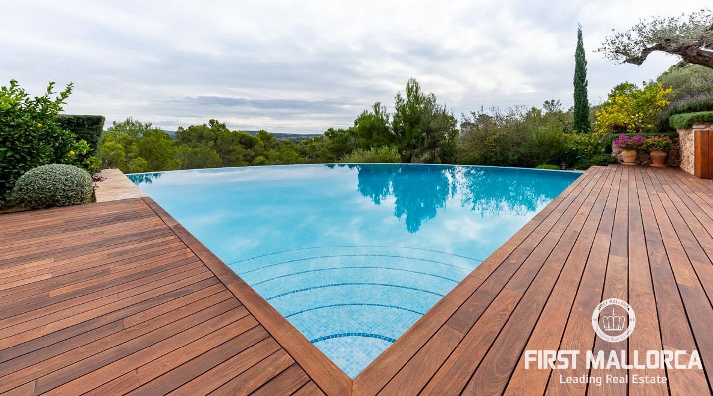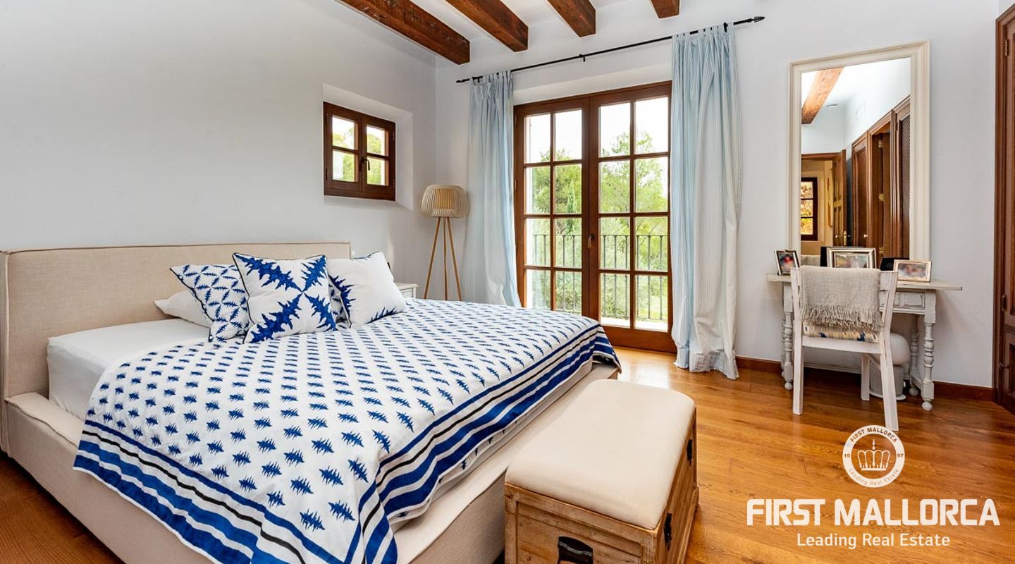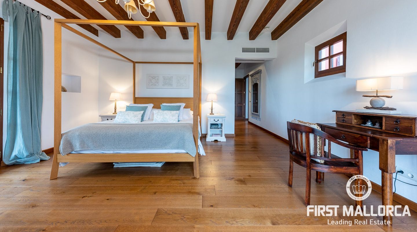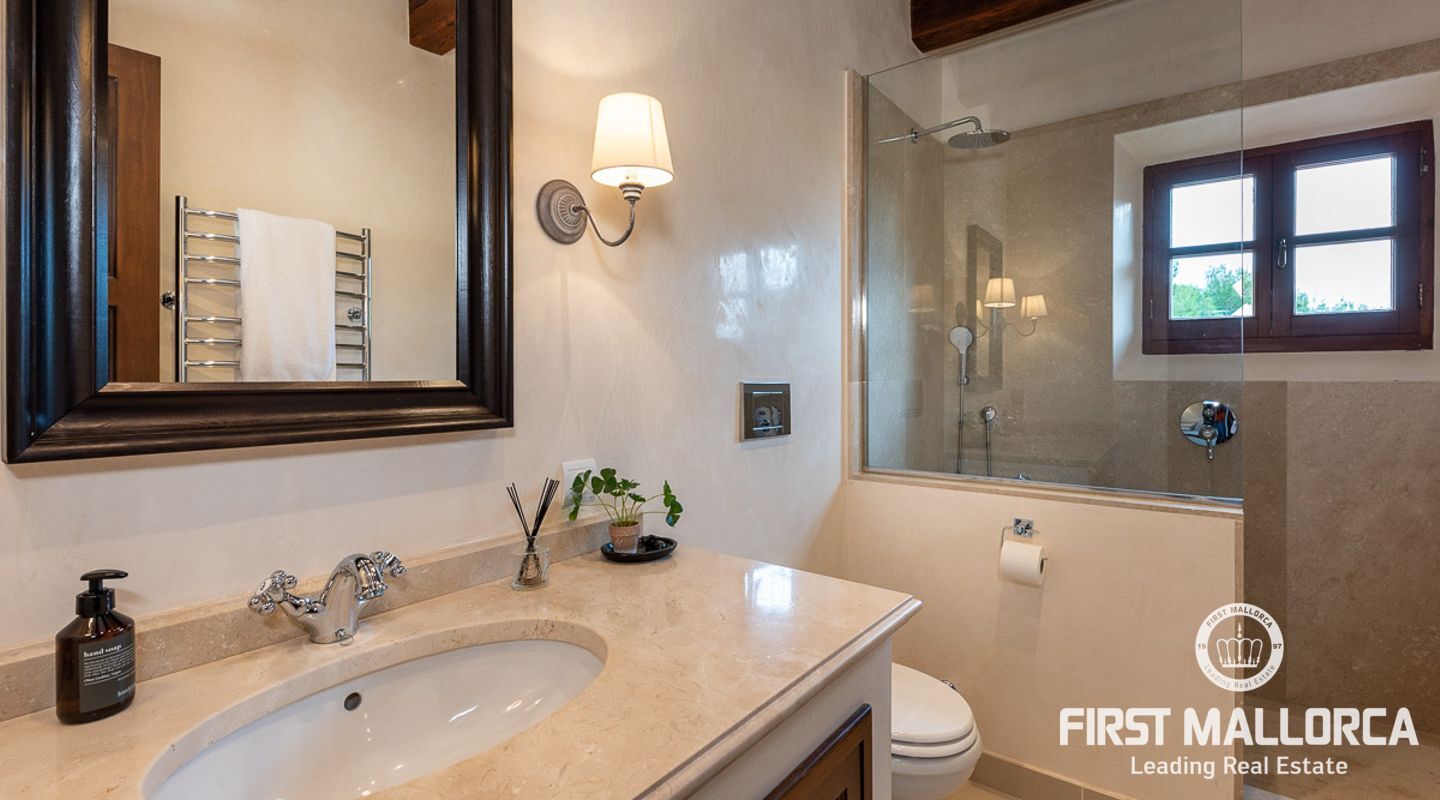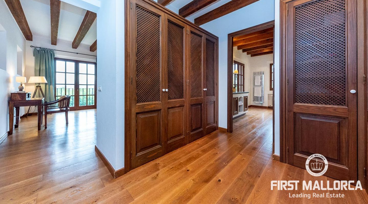 Denna vackra finca mellan Santa Maria och Bunyola, med snabb förbindelse till centrala Palma och flygplatsen Son San Joan, ligger i en naturmiljö utan motstycke. På toppen av ett bergsmassiv, med hisnande utsikt och i ett helt inhägnad och säkrat område. De ca 30.000 m2 mark är perfekt kombinerat med ett underbart landskapsarkitektur och trädgårdsarbete projekt. När du öppnar huvudporten kommer du in i en myriad av inhemska växter och blommor, som leker med sina former och former när du går upp till Fincas huvudingång, allt perfekt planerat, utformat och utformat. När vi kommer fram till huvudentrén möts vi av en sober och kraftfull byggnad som påminner om de mest typiska byggnaderna på Mallorca. Fasaderna, stenarna och materialen är en perfekt kombination av texturer och färger, vilket vittnar om den höga kvalitet som använts vid byggandet. Du kan redan känna vad som väntar dig bakom de vackra antika trädörrarna. ..... massor av ljus, öppna ytor, kvalitet och enastående utsikt! Fem sovrum alla med eget badrum och två gästlägenheter, en saltvattenpool på ca 80 m2, öppna och täckta terrasser som följer solens gång, ädla material som ekgolv av Schotten & Hansen, designkök av Birgitt Müller, tunga och starka träbjälkar i taket, natursten överallt och varje rum flyter in i nästa som om det vore en öppen yta. Om vi talar om den tekniska sidan är vi förvånade över att se att denna finca är helt självförsörjande och dess energikategori är den högsta möjliga A, vilket är mycket svårt att hitta på ön. Den är självförsörjande med sin egen vattenförsörjning med olika uttag, en solcellsstation och en dieselgenerator, luftkonditionering, golvvärme, larmsystem, musikkrets i hela Finca och många fler extrafunktioner. Ett dubbelgarage, gym, vinkällare, automatiskt bevattningssystem som täcker från grinden på gatunivå till det sista hörnet av huvudbyggnaden, är några av de extrafunktioner som avrundar denna trevliga och lugna fristad i en privilegierad miljö. I det här fallet kan vi skriva PRIVACY med stora bokstäver!