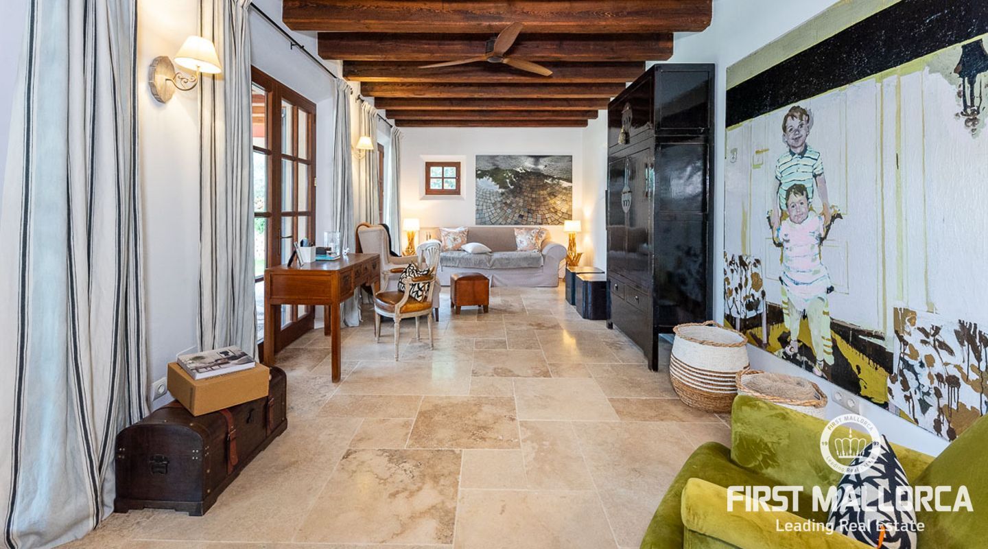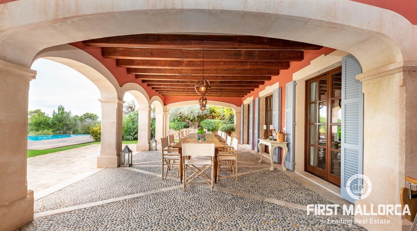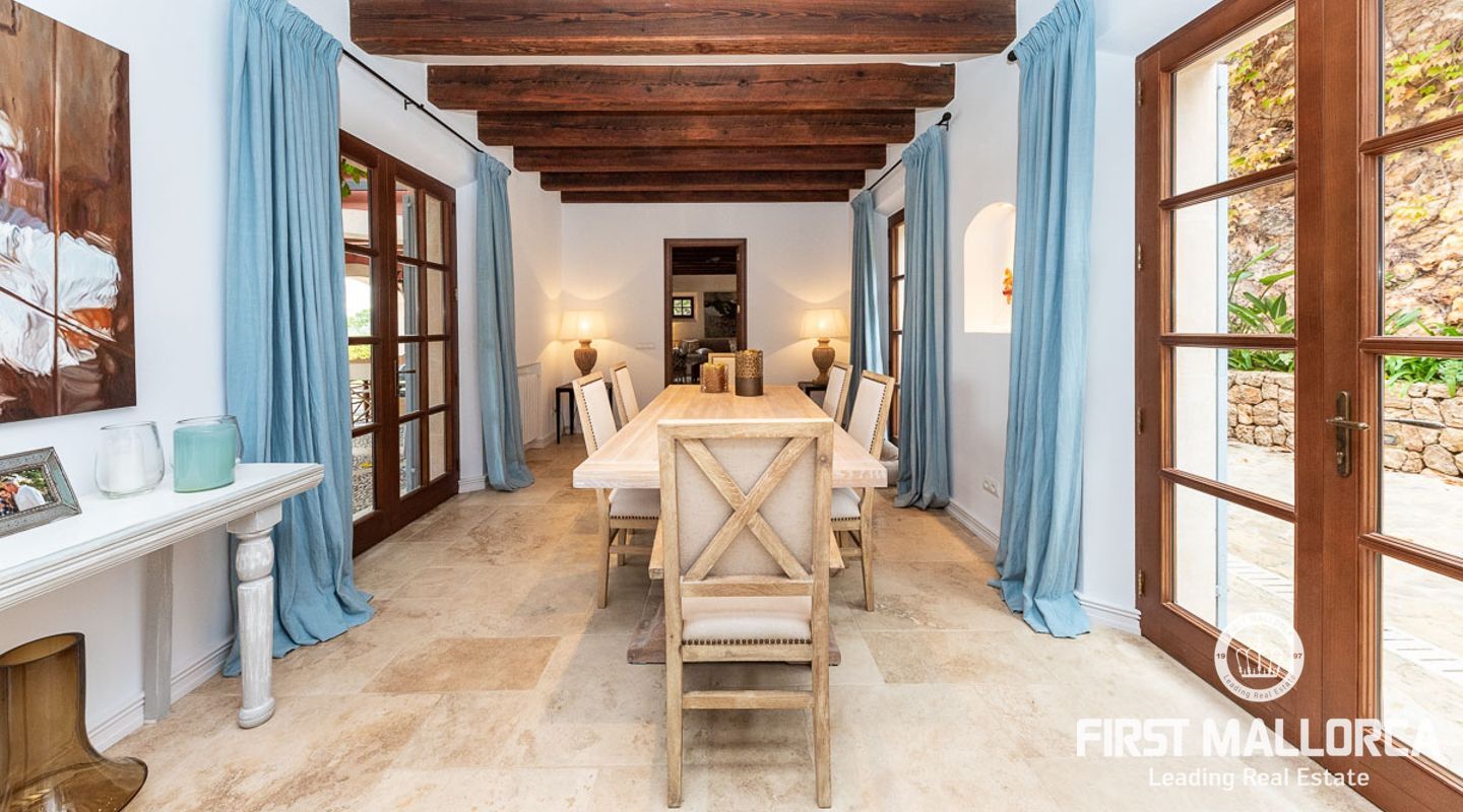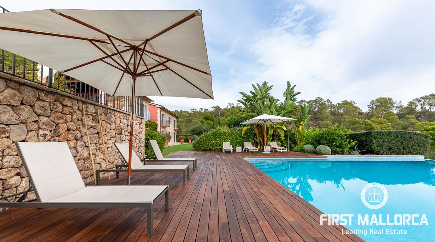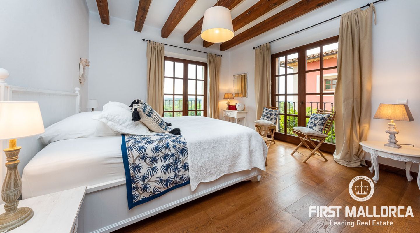 Denna vackra finca mellan Santa Maria och Bunyola, med snabb förbindelse till centrala Palma och flygplatsen Son San Joan, ligger i en naturmiljö utan motstycke. På toppen av ett bergsmassiv, med hisnande utsikt och i ett helt inhägnad och säkrat område. De ca 30.000 m2 mark är perfekt kombinerat med ett underbart landskapsarkitektur och trädgårdsarbete projekt. När du öppnar huvudporten kommer du in i en myriad av inhemska växter och blommor, som leker med sina former och former när du går upp till Fincas huvudingång, allt perfekt planerat, utformat och utformat. När vi kommer fram till huvudentrén möts vi av en sober och kraftfull byggnad som påminner om de mest typiska byggnaderna på Mallorca. Fasaderna, stenarna och materialen är en perfekt kombination av texturer och färger, vilket vittnar om den höga kvalitet som använts vid byggandet. Du kan redan känna vad som väntar dig bakom de vackra antika trädörrarna. ..... massor av ljus, öppna ytor, kvalitet och enastående utsikt! Fem sovrum alla med eget badrum och två gästlägenheter, en saltvattenpool på ca 80 m2, öppna och täckta terrasser som följer solens gång, ädla material som ekgolv av Schotten & Hansen, designkök av Birgitt Müller, tunga och starka träbjälkar i taket, natursten överallt och varje rum flyter in i nästa som om det vore en öppen yta. Om vi talar om den tekniska sidan är vi förvånade över att se att denna finca är helt självförsörjande och dess energikategori är den högsta möjliga A, vilket är mycket svårt att hitta på ön. Den är självförsörjande med sin egen vattenförsörjning med olika uttag, en solcellsstation och en dieselgenerator, luftkonditionering, golvvärme, larmsystem, musikkrets i hela Finca och många fler extrafunktioner. Ett dubbelgarage, gym, vinkällare, automatiskt bevattningssystem som täcker från grinden på gatunivå till det sista hörnet av huvudbyggnaden, är några av de extrafunktioner som avrundar denna trevliga och lugna fristad i en privilegierad miljö. I det här fallet kan vi skriva PRIVACY med stora bokstäver!