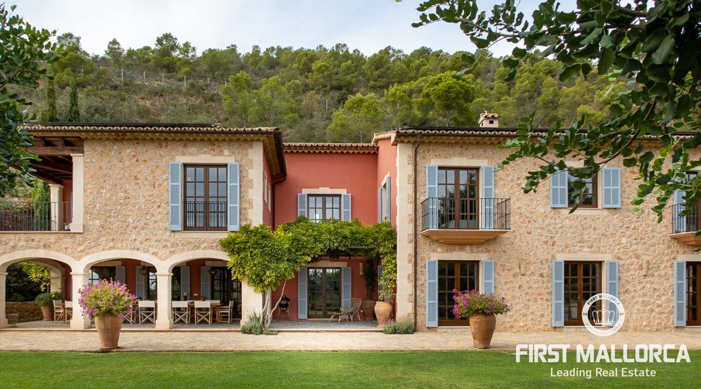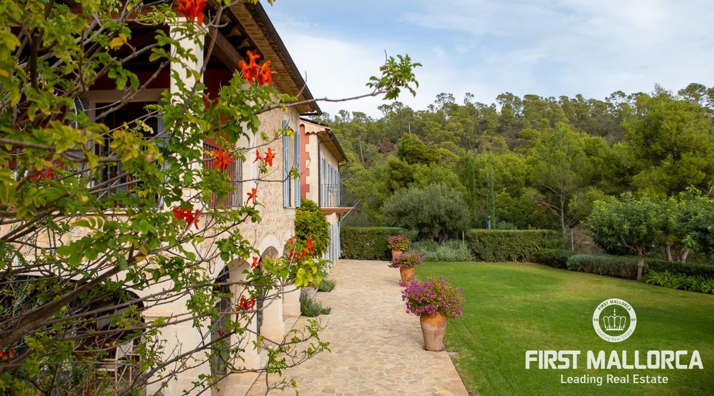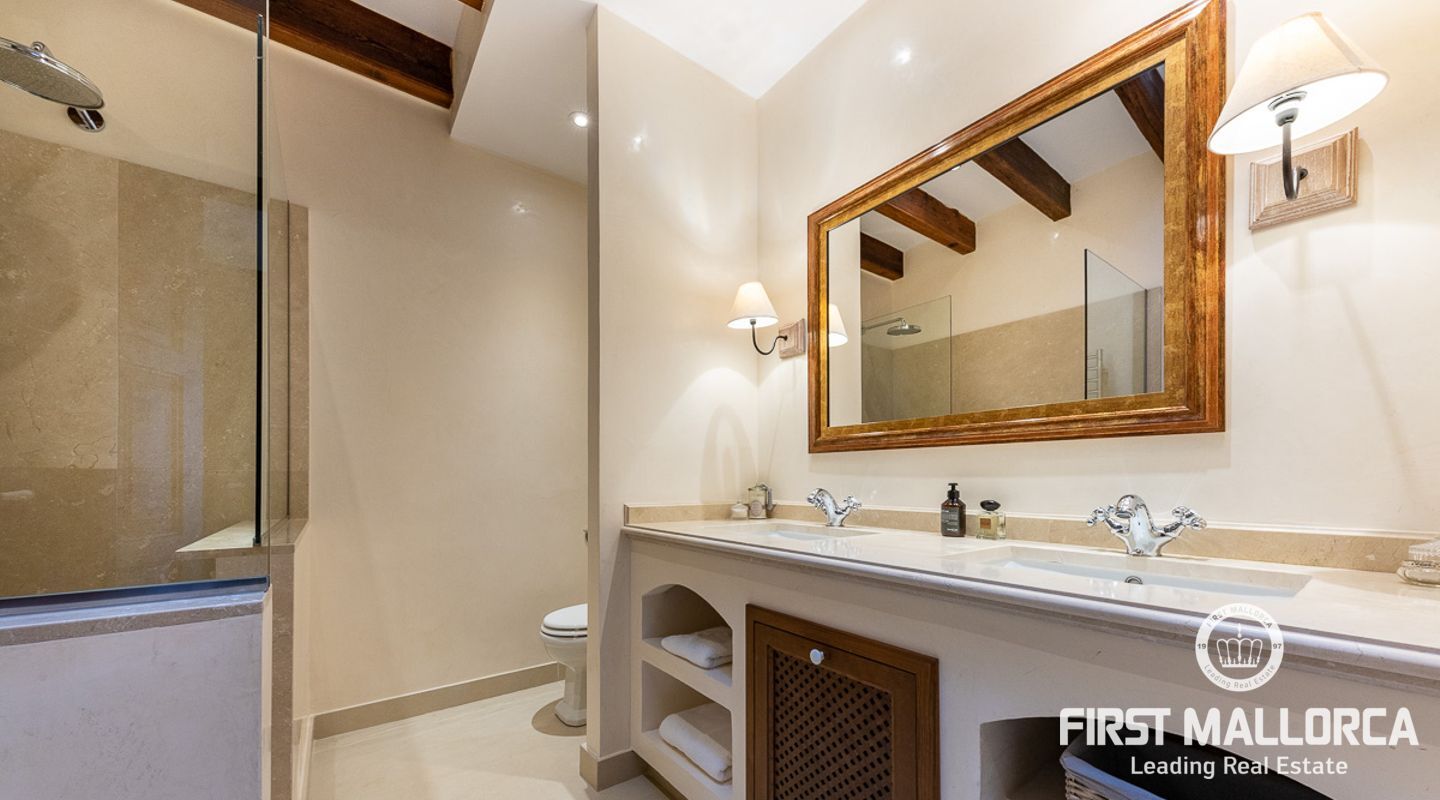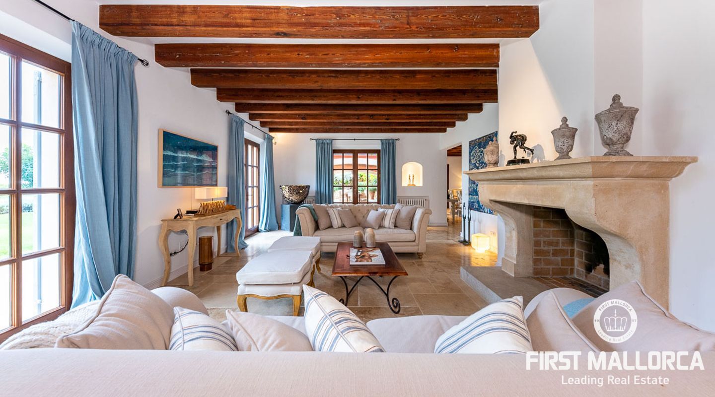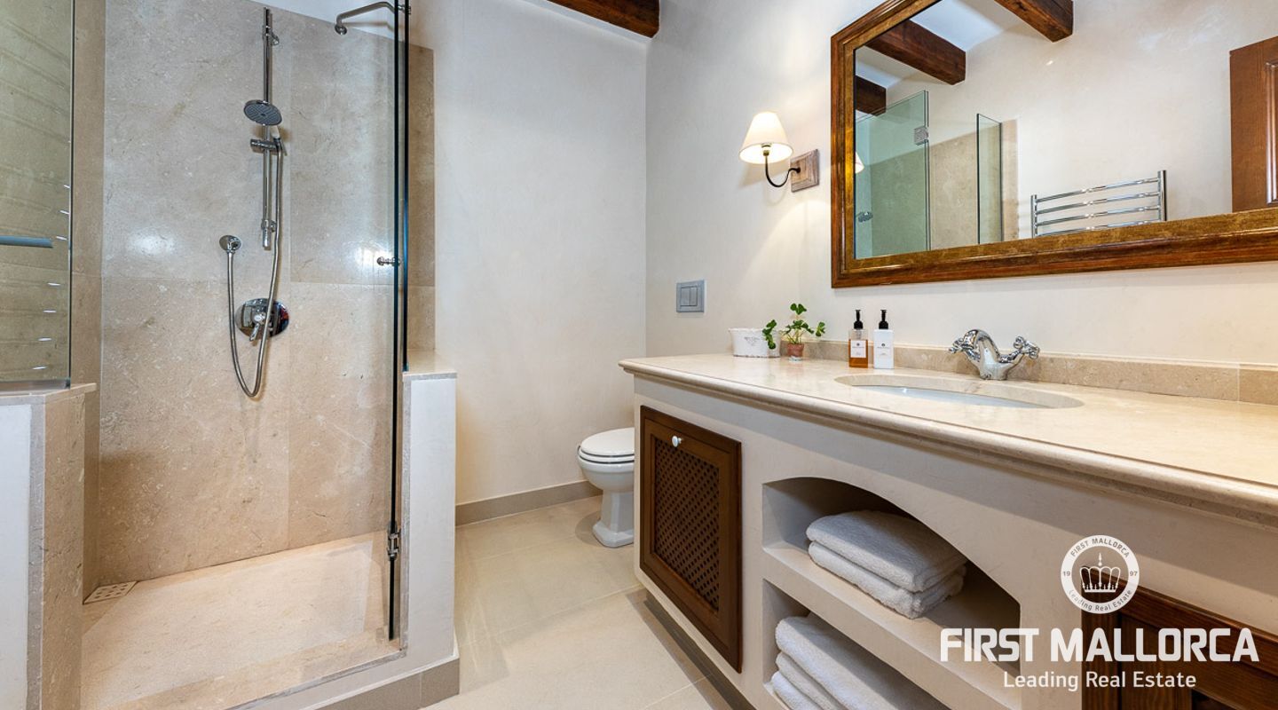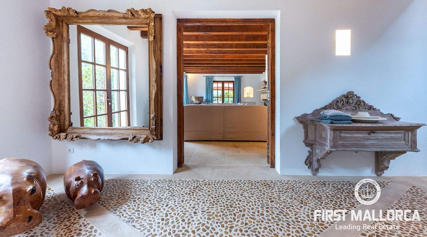 Denna vackra finca mellan Santa Maria och Bunyola, med snabb förbindelse till centrala Palma och flygplatsen Son San Joan, ligger i en naturmiljö utan motstycke. På toppen av ett bergsmassiv, med hisnande utsikt och i ett helt inhägnad och säkrat område. De ca 30.000 m2 mark är perfekt kombinerat med ett underbart landskapsarkitektur och trädgårdsarbete projekt. När du öppnar huvudporten kommer du in i en myriad av inhemska växter och blommor, som leker med sina former och former när du går upp till Fincas huvudingång, allt perfekt planerat, utformat och utformat. När vi kommer fram till huvudentrén möts vi av en sober och kraftfull byggnad som påminner om de mest typiska byggnaderna på Mallorca. Fasaderna, stenarna och materialen är en perfekt kombination av texturer och färger, vilket vittnar om den höga kvalitet som använts vid byggandet. Du kan redan känna vad som väntar dig bakom de vackra antika trädörrarna. ..... massor av ljus, öppna ytor, kvalitet och enastående utsikt! Fem sovrum alla med eget badrum och två gästlägenheter, en saltvattenpool på ca 80 m2, öppna och täckta terrasser som följer solens gång, ädla material som ekgolv av Schotten & Hansen, designkök av Birgitt Müller, tunga och starka träbjälkar i taket, natursten överallt och varje rum flyter in i nästa som om det vore en öppen yta. Om vi talar om den tekniska sidan är vi förvånade över att se att denna finca är helt självförsörjande och dess energikategori är den högsta möjliga A, vilket är mycket svårt att hitta på ön. Den är självförsörjande med sin egen vattenförsörjning med olika uttag, en solcellsstation och en dieselgenerator, luftkonditionering, golvvärme, larmsystem, musikkrets i hela Finca och många fler extrafunktioner. Ett dubbelgarage, gym, vinkällare, automatiskt bevattningssystem som täcker från grinden på gatunivå till det sista hörnet av huvudbyggnaden, är några av de extrafunktioner som avrundar denna trevliga och lugna fristad i en privilegierad miljö. I det här fallet kan vi skriva PRIVACY med stora bokstäver!