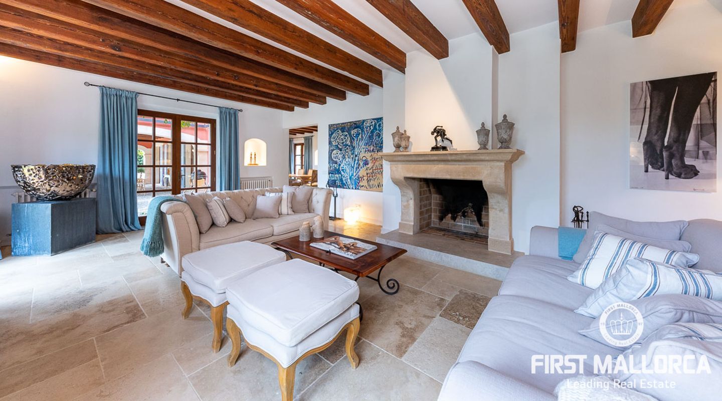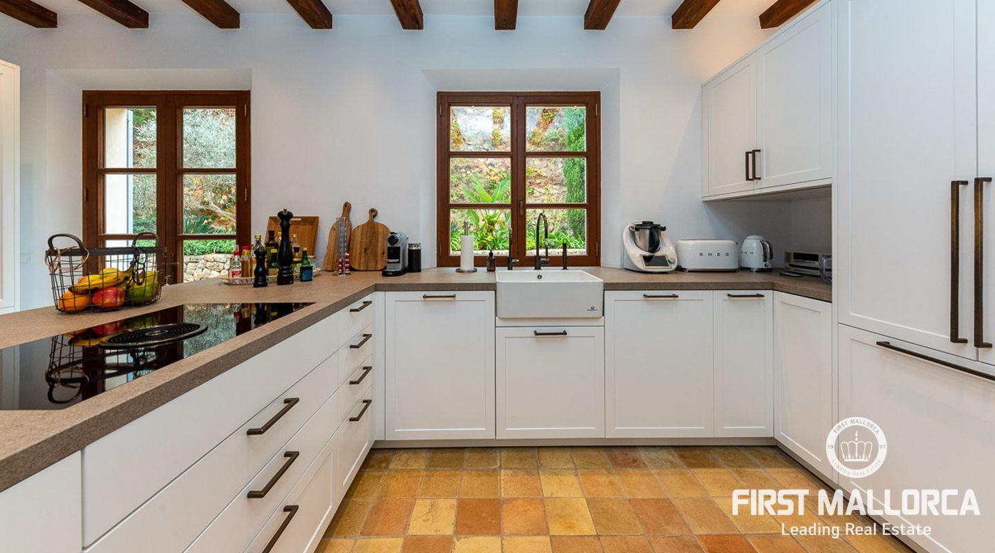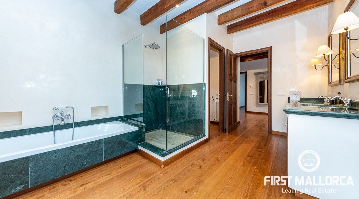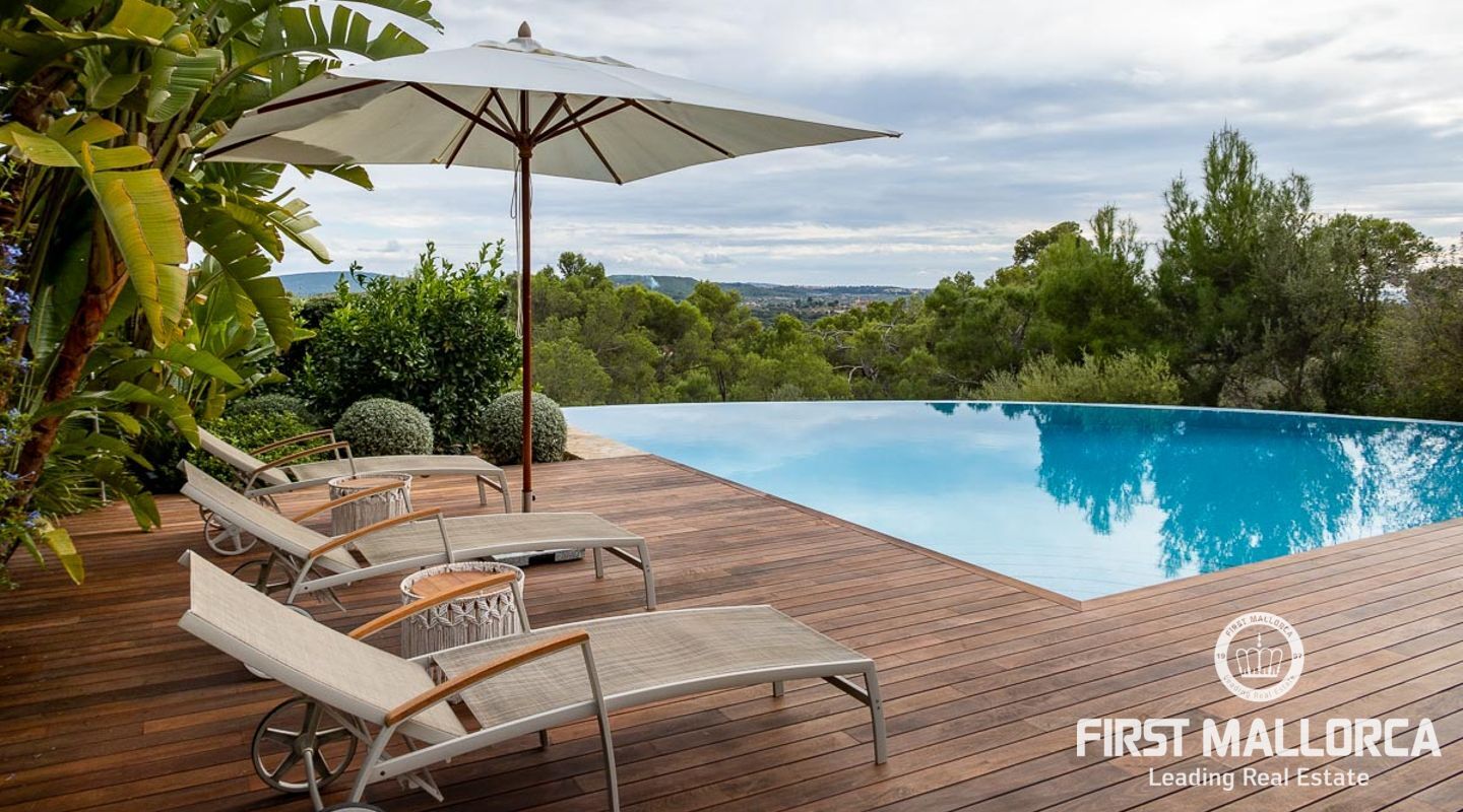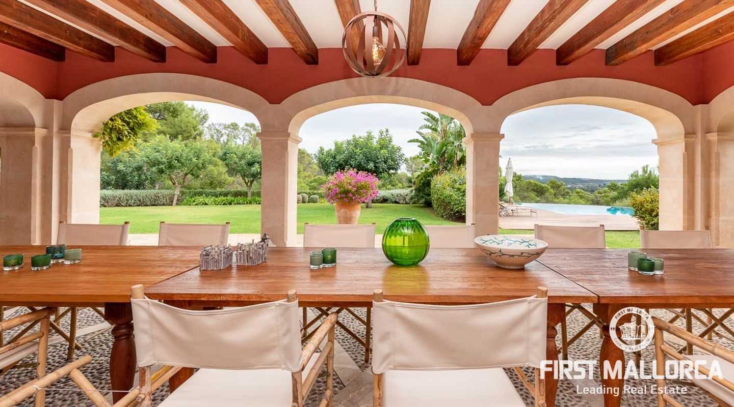 Denna vackra finca mellan Santa Maria och Bunyola, med snabb förbindelse till centrala Palma och flygplatsen Son San Joan, ligger i en naturmiljö utan motstycke. På toppen av ett bergsmassiv, med hisnande utsikt och i ett helt inhägnad och säkrat område. De ca 30.000 m2 mark är perfekt kombinerat med ett underbart landskapsarkitektur och trädgårdsarbete projekt. När du öppnar huvudporten kommer du in i en myriad av inhemska växter och blommor, som leker med sina former och former när du går upp till Fincas huvudingång, allt perfekt planerat, utformat och utformat. När vi kommer fram till huvudentrén möts vi av en sober och kraftfull byggnad som påminner om de mest typiska byggnaderna på Mallorca. Fasaderna, stenarna och materialen är en perfekt kombination av texturer och färger, vilket vittnar om den höga kvalitet som använts vid byggandet. Du kan redan känna vad som väntar dig bakom de vackra antika trädörrarna. ..... massor av ljus, öppna ytor, kvalitet och enastående utsikt! Fem sovrum alla med eget badrum och två gästlägenheter, en saltvattenpool på ca 80 m2, öppna och täckta terrasser som följer solens gång, ädla material som ekgolv av Schotten & Hansen, designkök av Birgitt Müller, tunga och starka träbjälkar i taket, natursten överallt och varje rum flyter in i nästa som om det vore en öppen yta. Om vi talar om den tekniska sidan är vi förvånade över att se att denna finca är helt självförsörjande och dess energikategori är den högsta möjliga A, vilket är mycket svårt att hitta på ön. Den är självförsörjande med sin egen vattenförsörjning med olika uttag, en solcellsstation och en dieselgenerator, luftkonditionering, golvvärme, larmsystem, musikkrets i hela Finca och många fler extrafunktioner. Ett dubbelgarage, gym, vinkällare, automatiskt bevattningssystem som täcker från grinden på gatunivå till det sista hörnet av huvudbyggnaden, är några av de extrafunktioner som avrundar denna trevliga och lugna fristad i en privilegierad miljö. I det här fallet kan vi skriva PRIVACY med stora bokstäver!