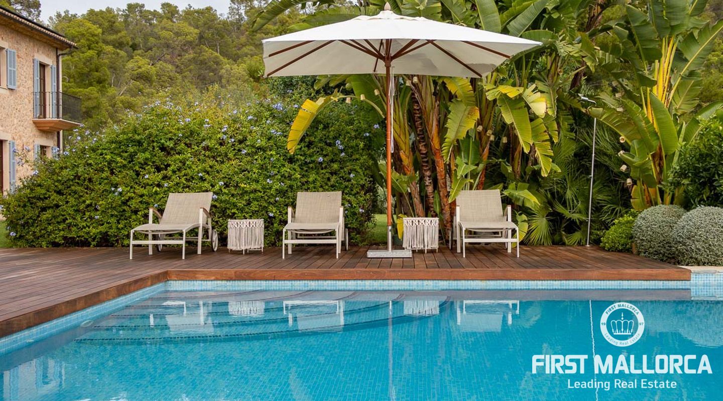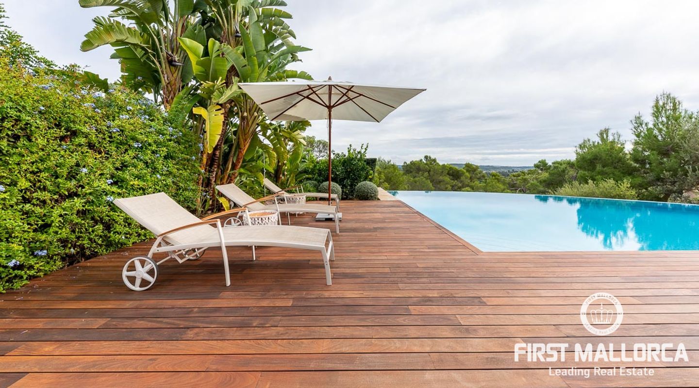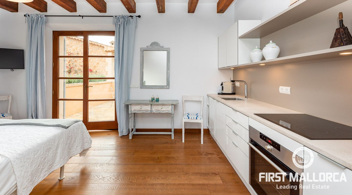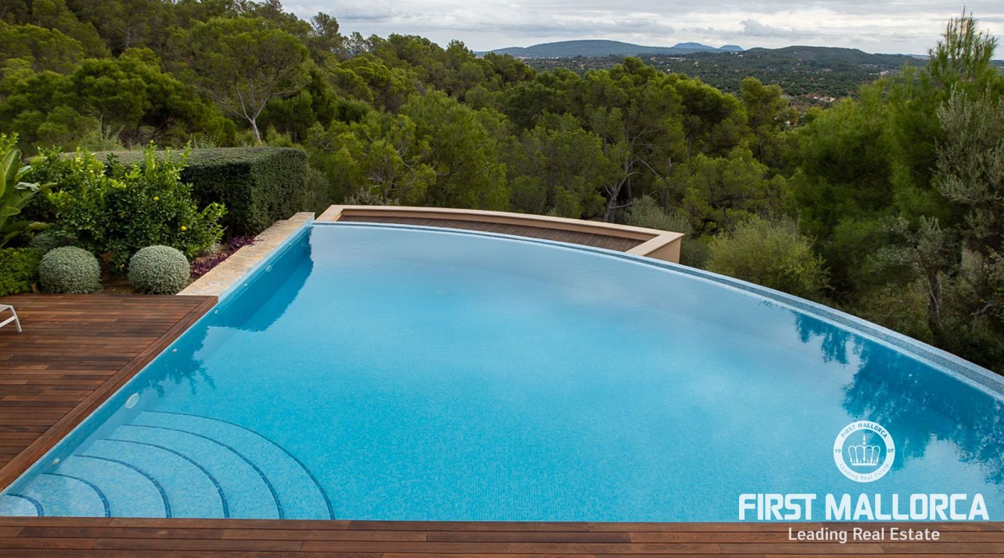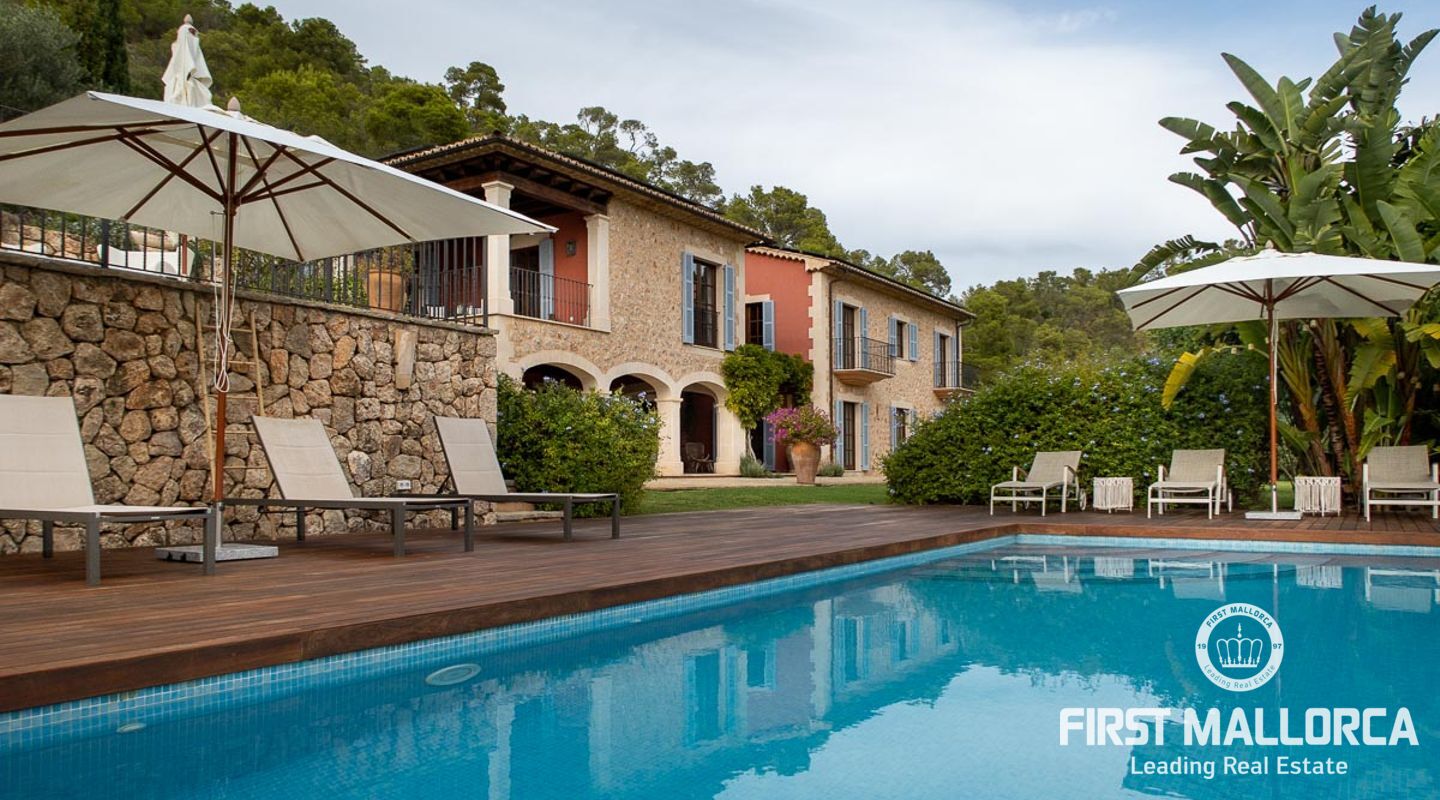 Denna vackra finca mellan Santa Maria och Bunyola, med snabb förbindelse till centrala Palma och flygplatsen Son San Joan, ligger i en naturmiljö utan motstycke. På toppen av ett bergsmassiv, med hisnande utsikt och i ett helt inhägnad och säkrat område. De ca 30.000 m2 mark är perfekt kombinerat med ett underbart landskapsarkitektur och trädgårdsarbete projekt. När du öppnar huvudporten kommer du in i en myriad av inhemska växter och blommor, som leker med sina former och former när du går upp till Fincas huvudingång, allt perfekt planerat, utformat och utformat. När vi kommer fram till huvudentrén möts vi av en sober och kraftfull byggnad som påminner om de mest typiska byggnaderna på Mallorca. Fasaderna, stenarna och materialen är en perfekt kombination av texturer och färger, vilket vittnar om den höga kvalitet som använts vid byggandet. Du kan redan känna vad som väntar dig bakom de vackra antika trädörrarna. ..... massor av ljus, öppna ytor, kvalitet och enastående utsikt! Fem sovrum alla med eget badrum och två gästlägenheter, en saltvattenpool på ca 80 m2, öppna och täckta terrasser som följer solens gång, ädla material som ekgolv av Schotten & Hansen, designkök av Birgitt Müller, tunga och starka träbjälkar i taket, natursten överallt och varje rum flyter in i nästa som om det vore en öppen yta. Om vi talar om den tekniska sidan är vi förvånade över att se att denna finca är helt självförsörjande och dess energikategori är den högsta möjliga A, vilket är mycket svårt att hitta på ön. Den är självförsörjande med sin egen vattenförsörjning med olika uttag, en solcellsstation och en dieselgenerator, luftkonditionering, golvvärme, larmsystem, musikkrets i hela Finca och många fler extrafunktioner. Ett dubbelgarage, gym, vinkällare, automatiskt bevattningssystem som täcker från grinden på gatunivå till det sista hörnet av huvudbyggnaden, är några av de extrafunktioner som avrundar denna trevliga och lugna fristad i en privilegierad miljö. I det här fallet kan vi skriva PRIVACY med stora bokstäver!