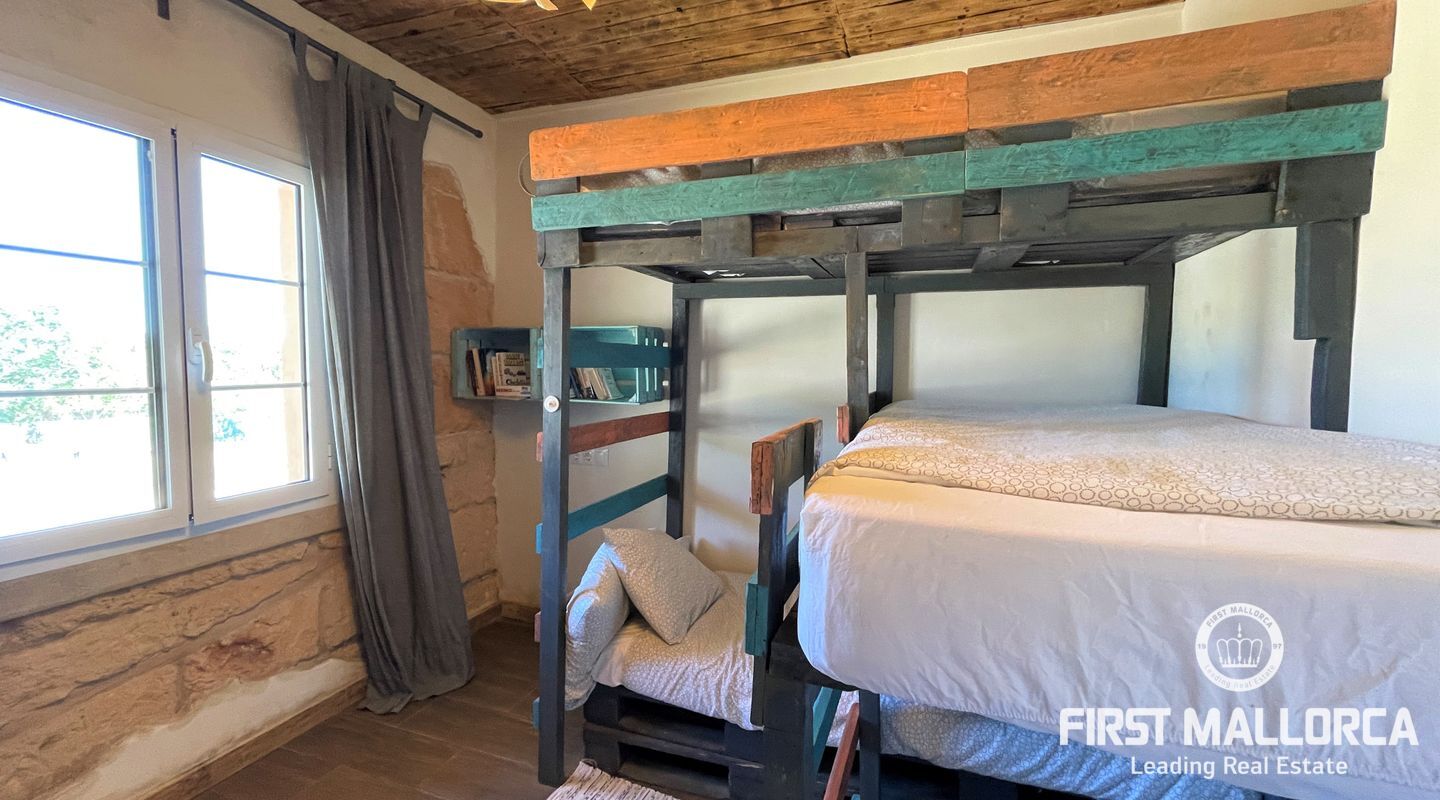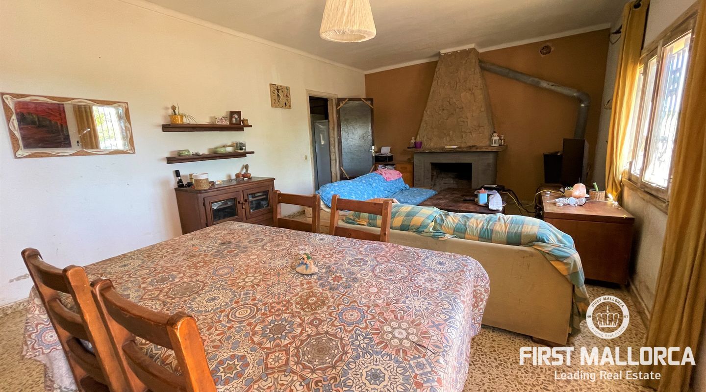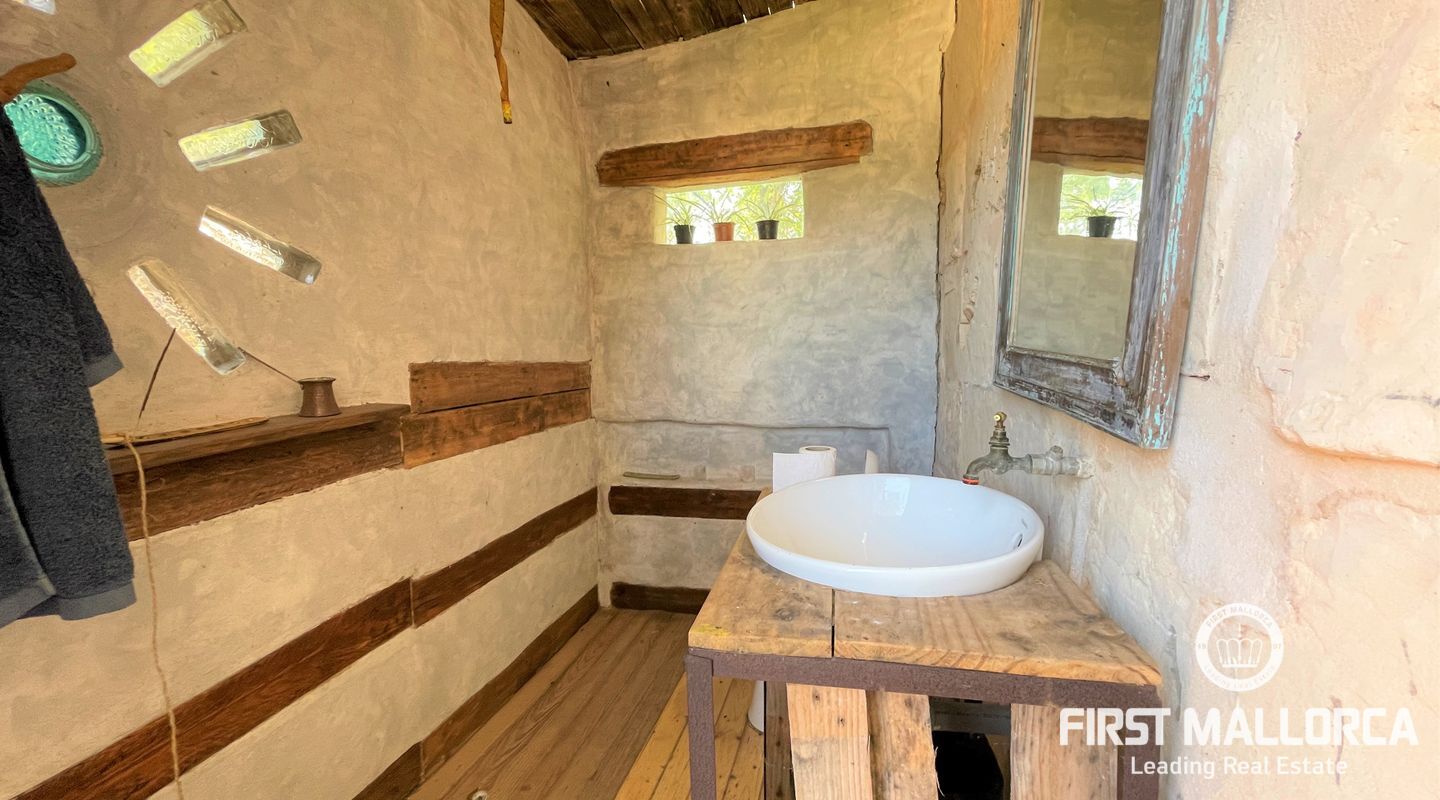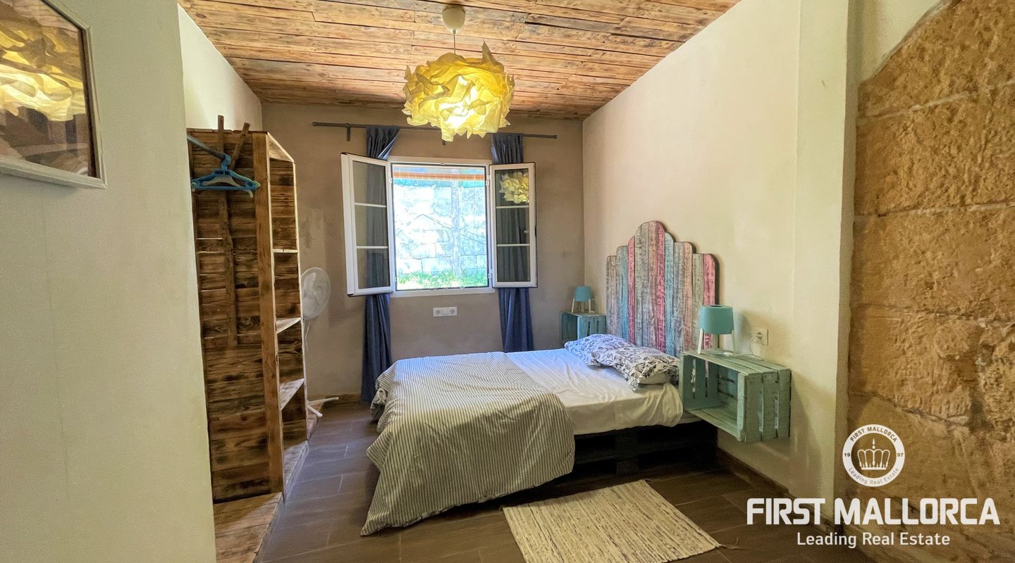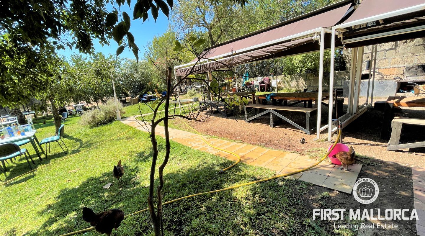 Två hus på en 12 000 m2 stor tomt. Gästhuset är en vacker lägenhet med trätak, imitation av parkettplattor och synliga stenväggar. Det har två sovrum, badrum med dusch och skärm, kök/matsal. Det har nyligen renoverats. Huvudbyggnaden som ligger bredvid gästhuset. Det har 2 sovrum, badrum, ett stort kök och ett rymligt vardagsrum/matsal. Det skulle kunna dra nytta av en liten renovering. (98m2). Fincaen har ett mycket bra läge i mitten av ön Mallorca, 8 km från byn Manacor. Den har underbar fri utsikt, en stor trädgård med grillar, två lerugnar, utomhusbadrum, chiringuito, damm och träd. Andra områden på fastigheten har inretts för parkering eller ett fritidsområde. Fincaen är helt självförsörjande, drivs av solenergi och har en brunn med gott om vatten och en brunn för uppsamling av regnvatten. Den betalar inte för el eller vatten. Utomhusytan hyrs för närvarande ut för fester, evenemang, workshops osv. Det är en perfekt investeringsmöjlighet. Det har inte ett intyg om beboelighet, förväntas få det i oktober.