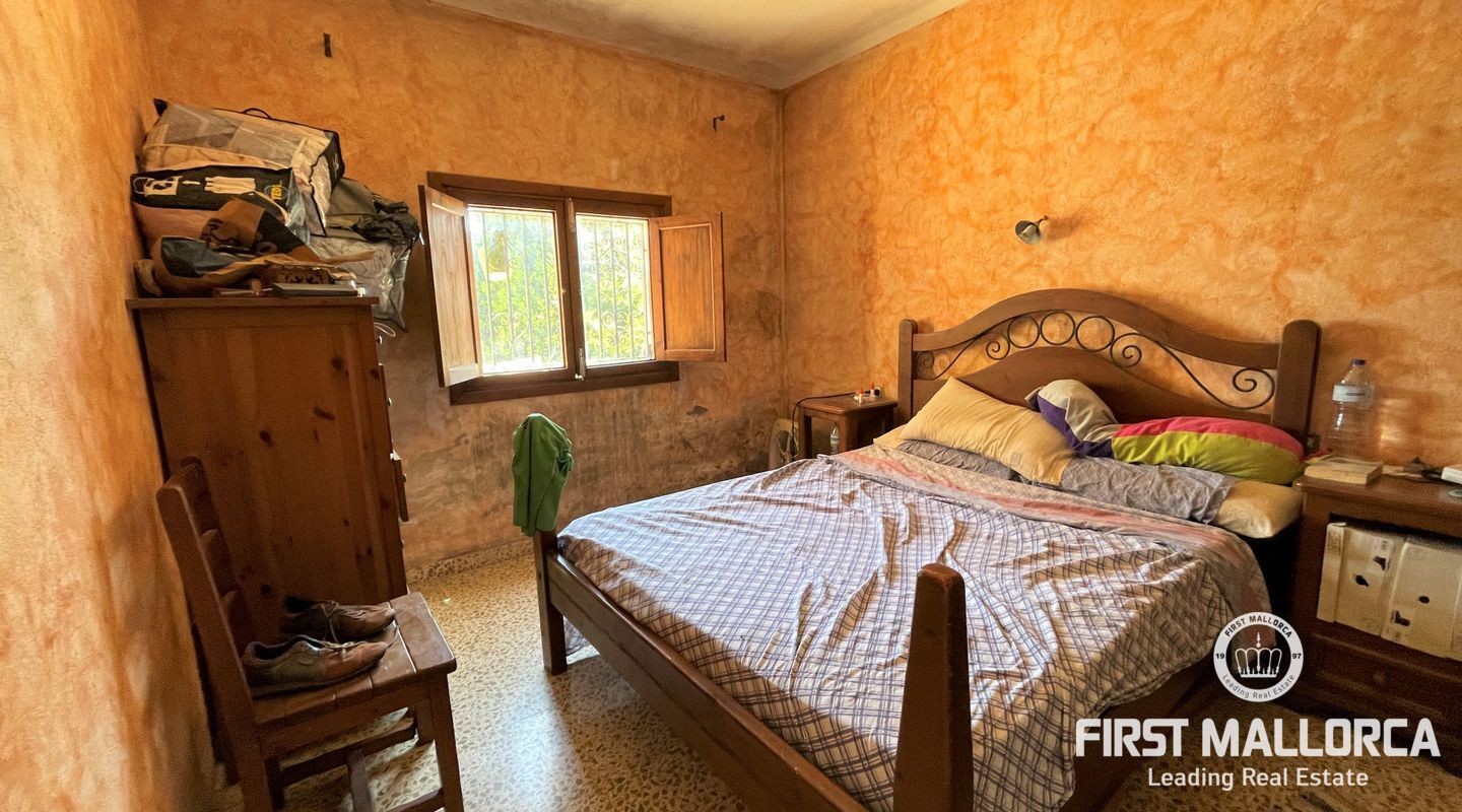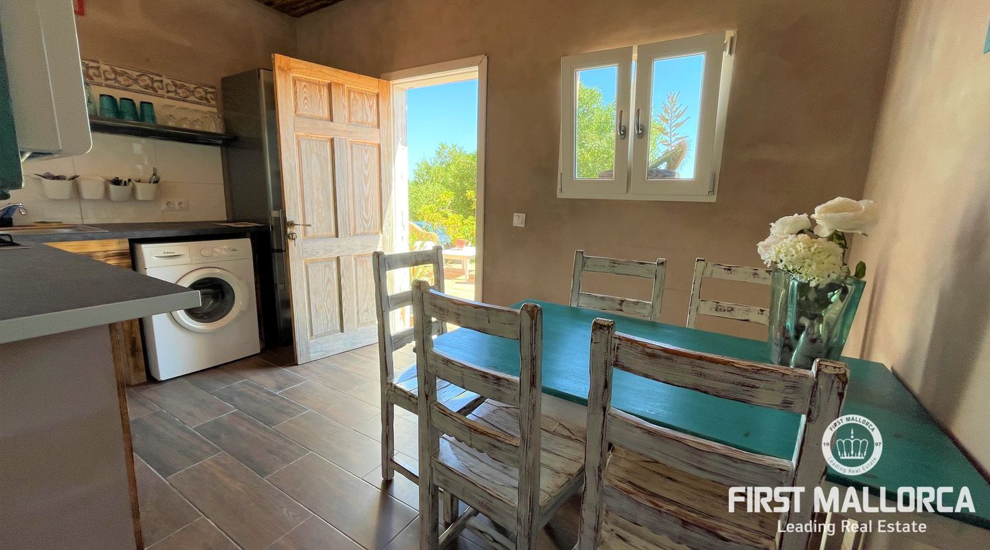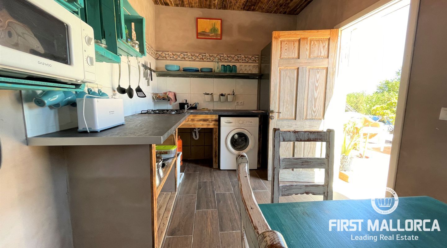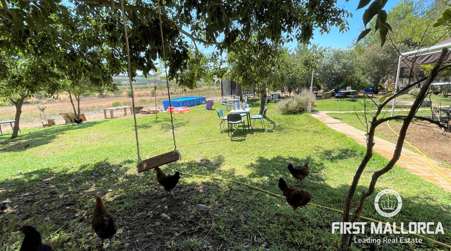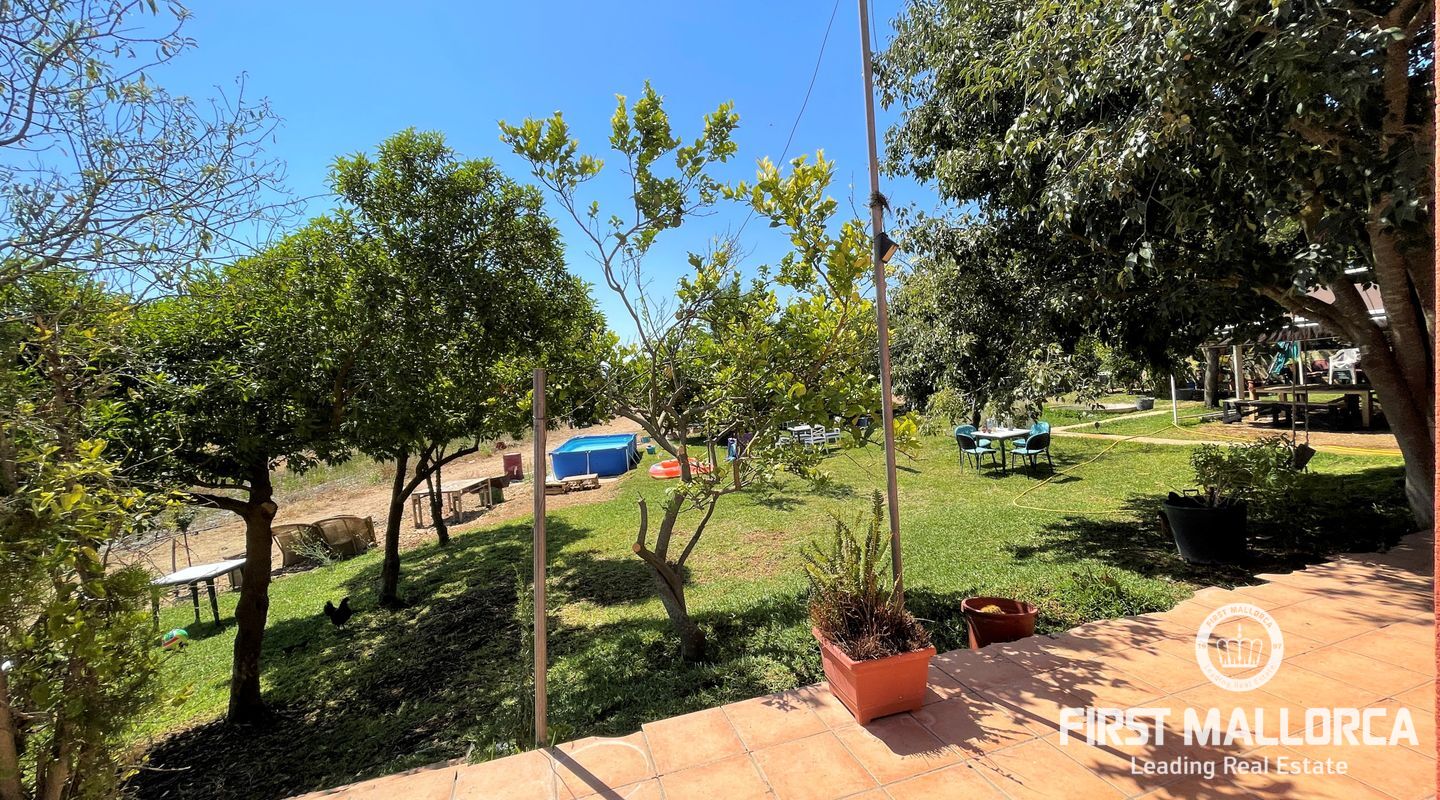 Två hus på en 12 000 m2 stor tomt. Gästhuset är en vacker lägenhet med trätak, imitation av parkettplattor och synliga stenväggar. Det har två sovrum, badrum med dusch och skärm, kök/matsal. Det har nyligen renoverats. Huvudbyggnaden som ligger bredvid gästhuset. Det har 2 sovrum, badrum, ett stort kök och ett rymligt vardagsrum/matsal. Det skulle kunna dra nytta av en liten renovering. (98m2). Fincaen har ett mycket bra läge i mitten av ön Mallorca, 8 km från byn Manacor. Den har underbar fri utsikt, en stor trädgård med grillar, två lerugnar, utomhusbadrum, chiringuito, damm och träd. Andra områden på fastigheten har inretts för parkering eller ett fritidsområde. Fincaen är helt självförsörjande, drivs av solenergi och har en brunn med gott om vatten och en brunn för uppsamling av regnvatten. Den betalar inte för el eller vatten. Utomhusytan hyrs för närvarande ut för fester, evenemang, workshops osv. Det är en perfekt investeringsmöjlighet. Det har inte ett intyg om beboelighet, förväntas få det i oktober.