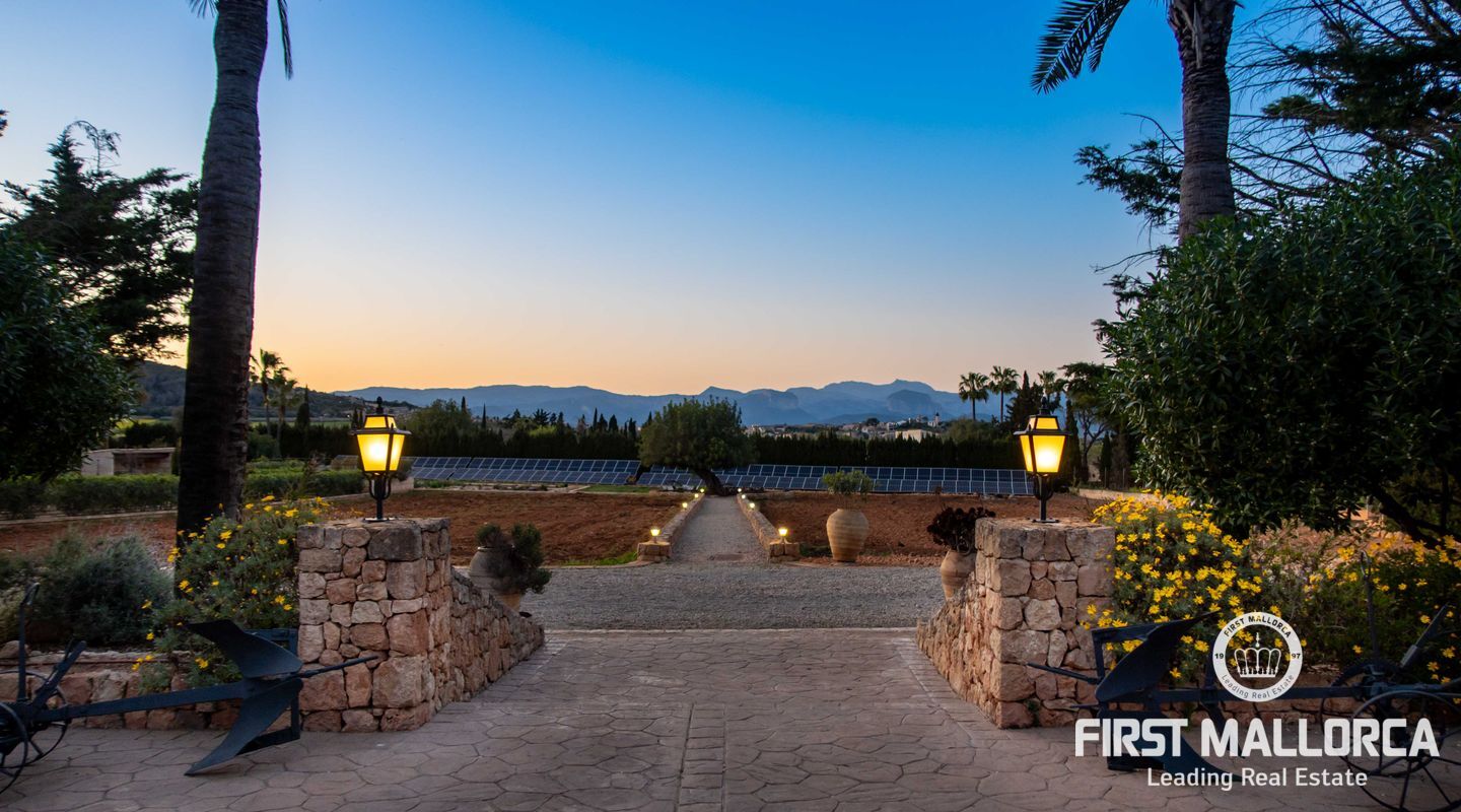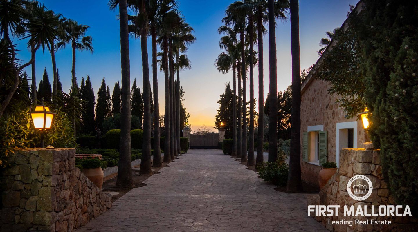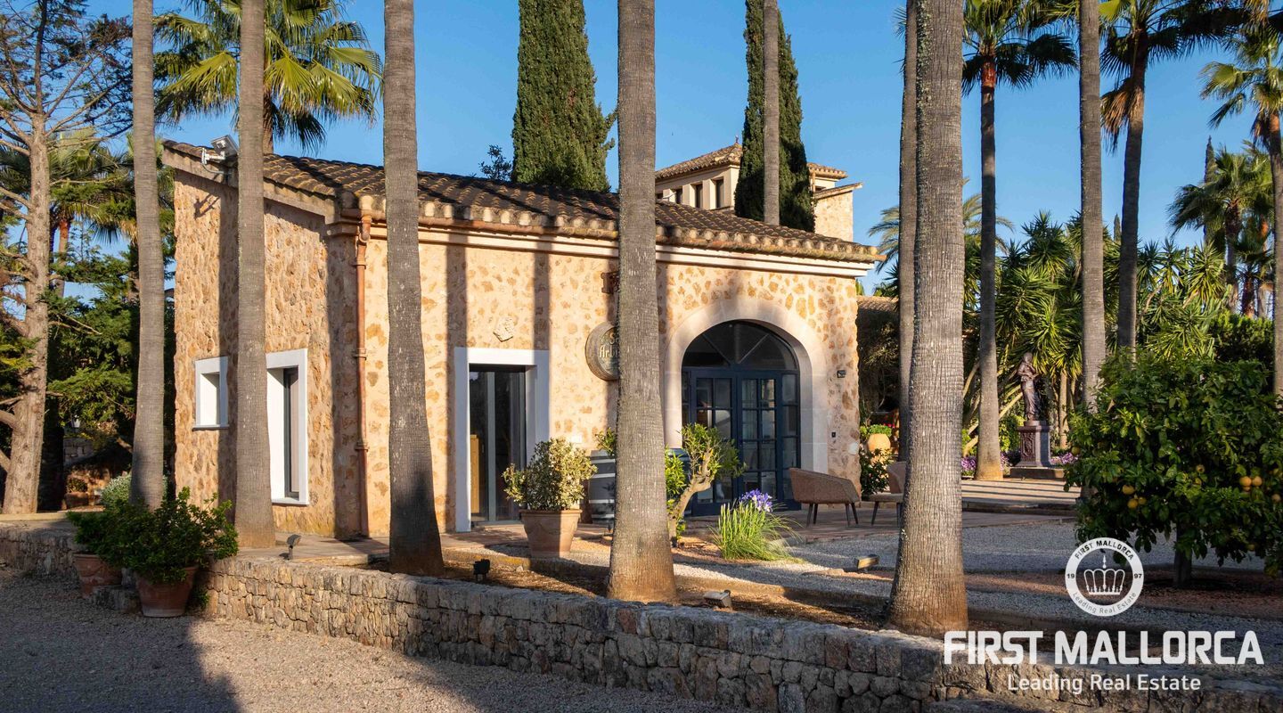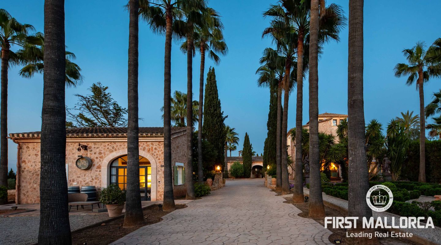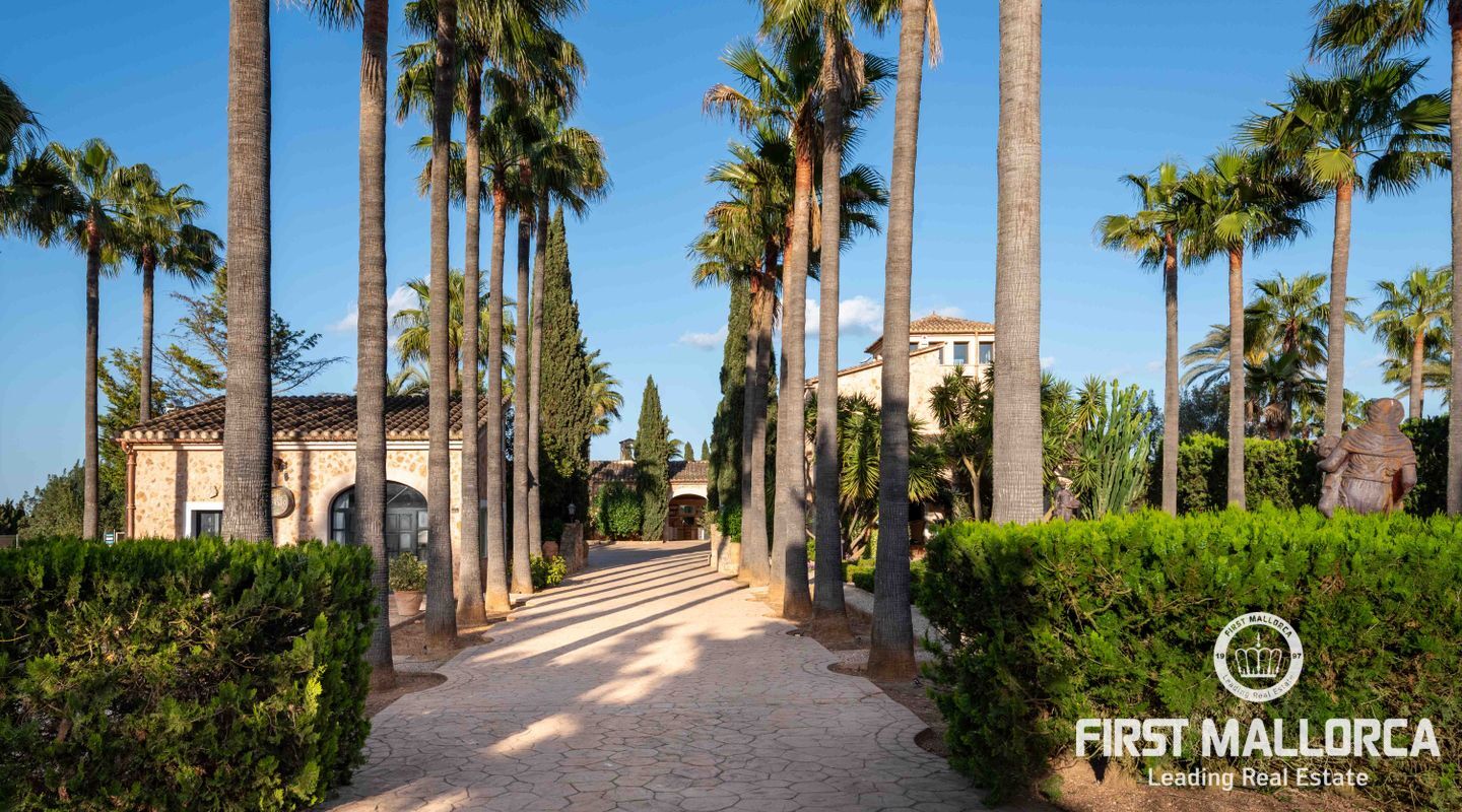 En vacker, bred väg kantad med palmer leder till huvudbyggnaden samt tre eleganta gästhus, som harmoniskt kombinerar traditionell mallorkinsk arkitektur med modern komfort. Med totalt åtta sovrum och sex badrum erbjuder denna fastighet generöst med utrymme för familj och gäster.