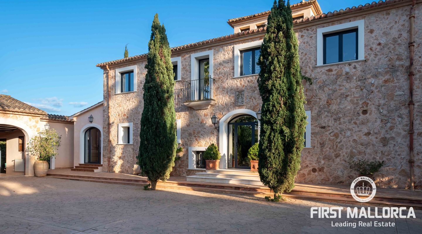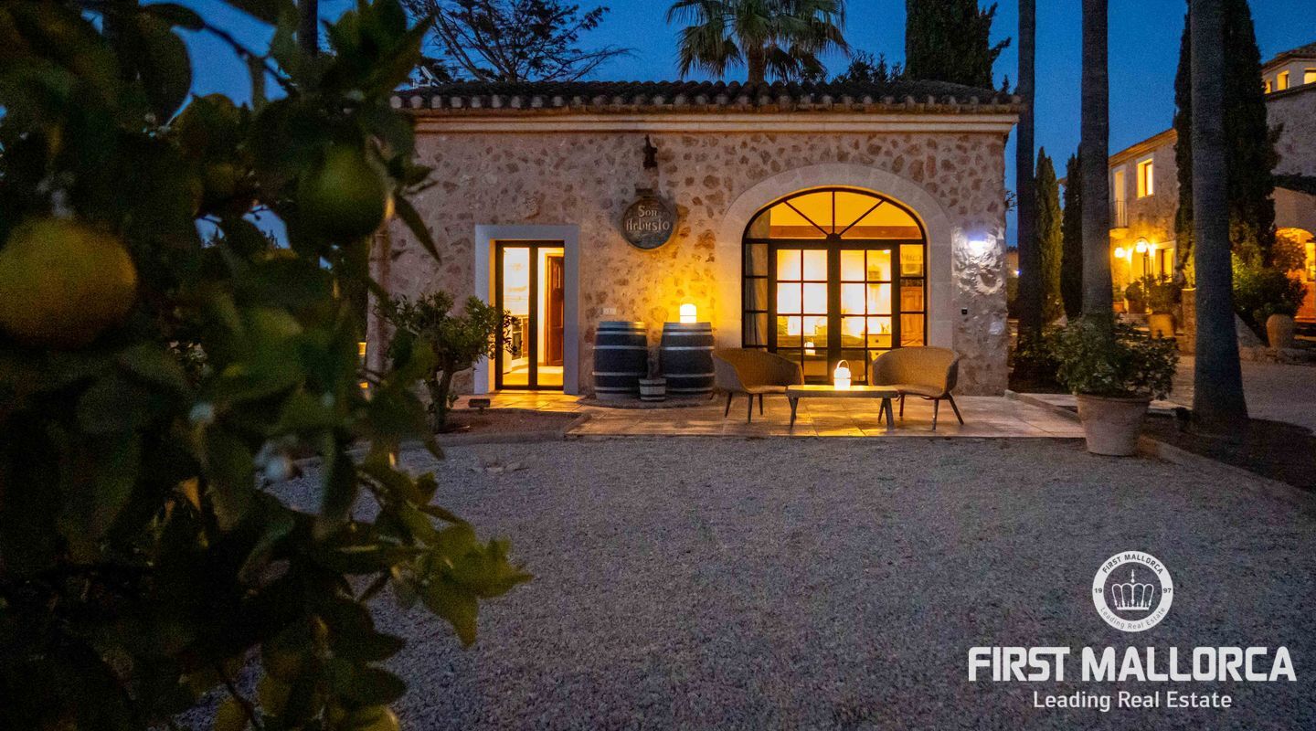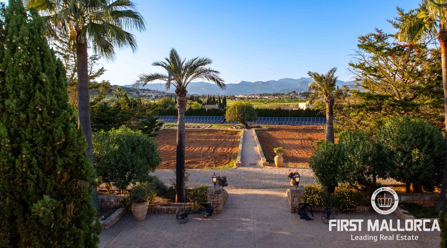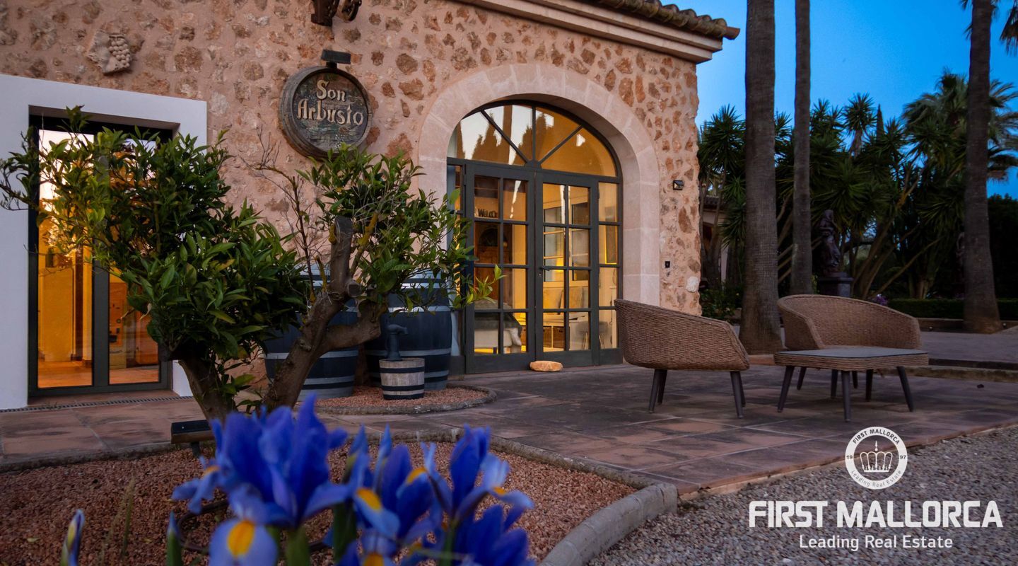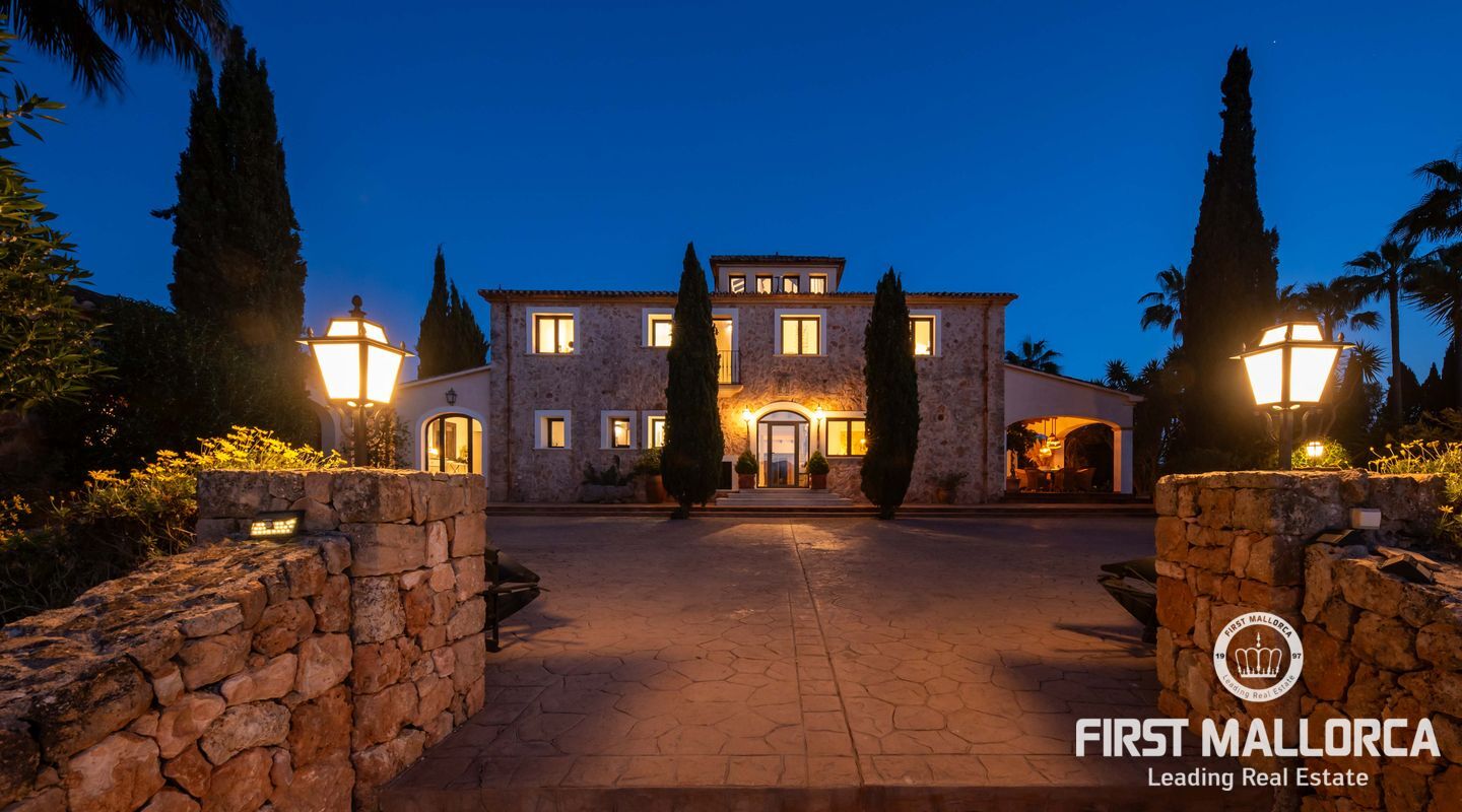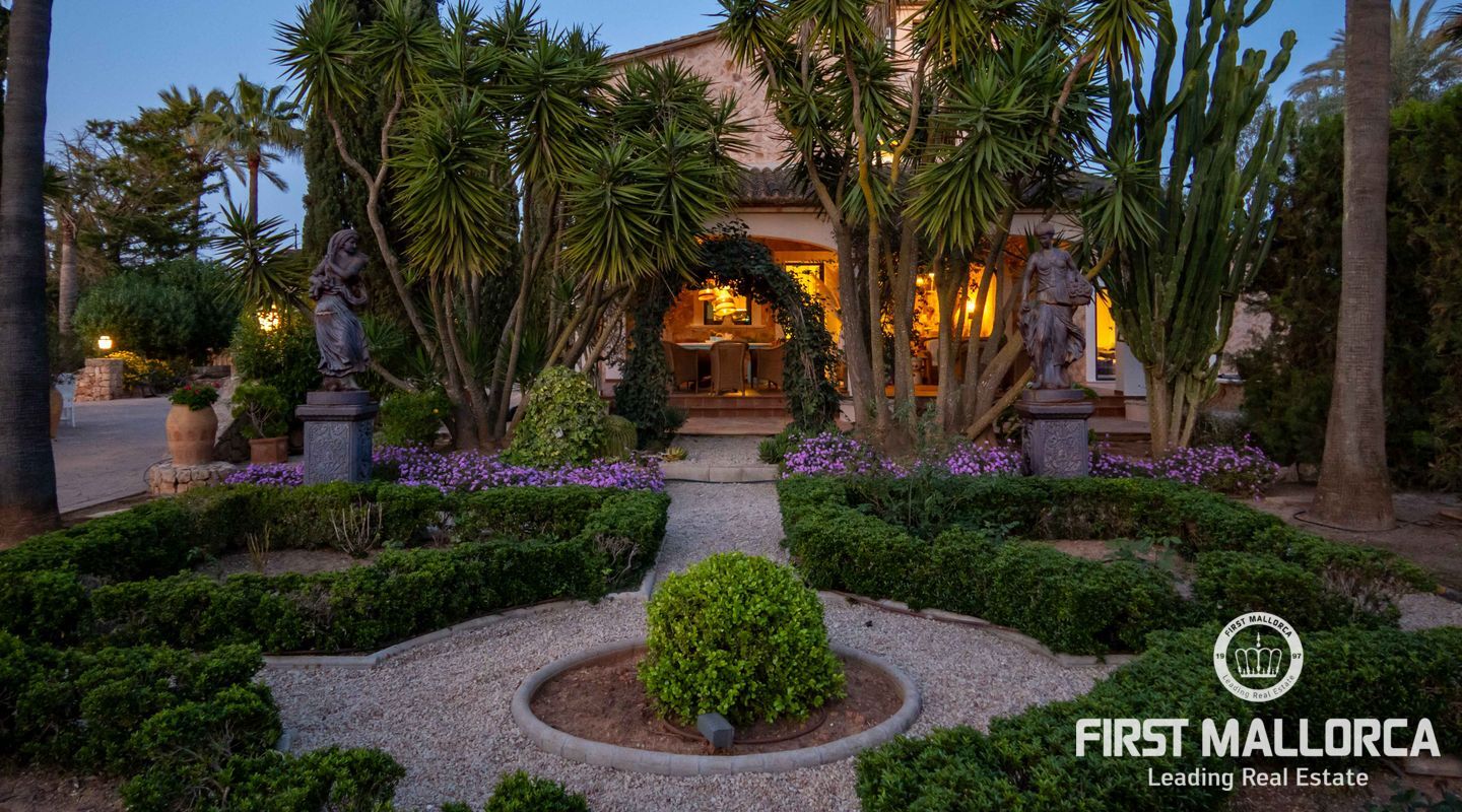 En vacker, bred väg kantad med palmer leder till huvudbyggnaden samt tre eleganta gästhus, som harmoniskt kombinerar traditionell mallorkinsk arkitektur med modern komfort. Med totalt åtta sovrum och sex badrum erbjuder denna fastighet generöst med utrymme för familj och gäster.