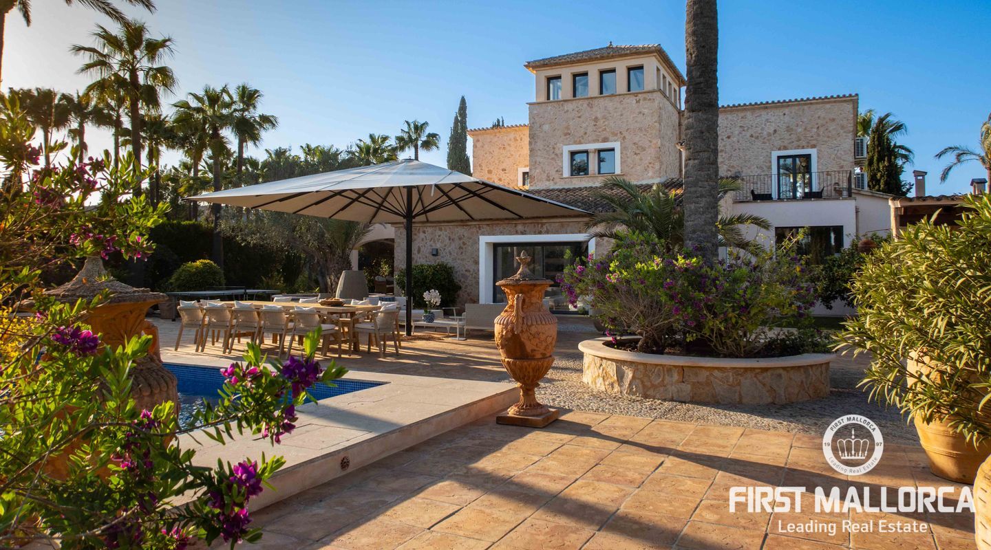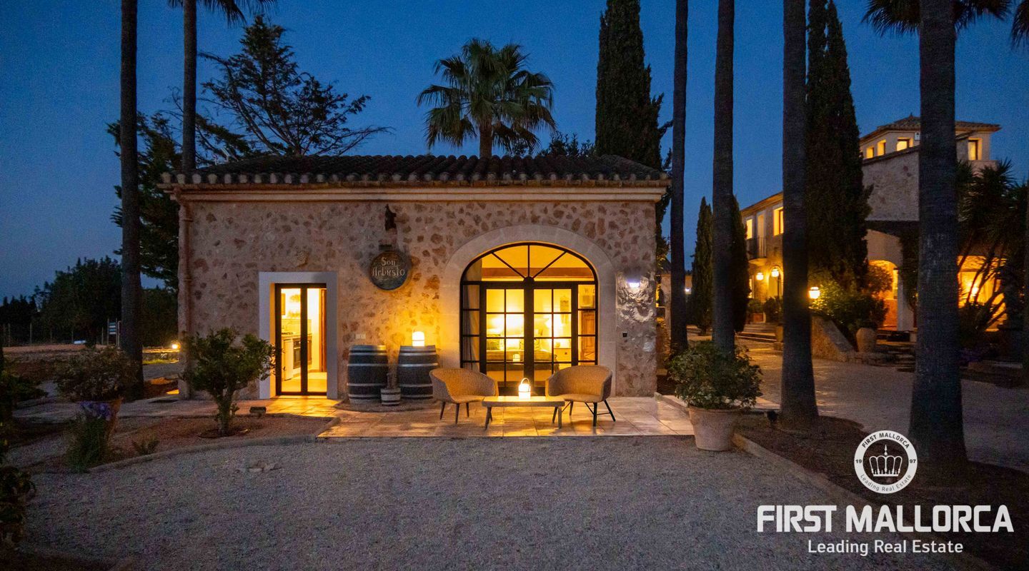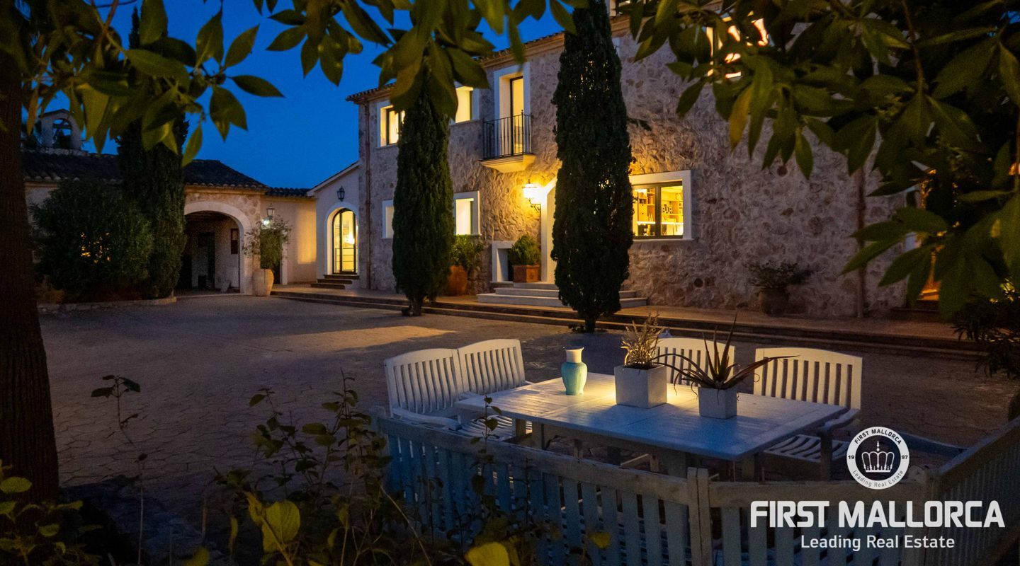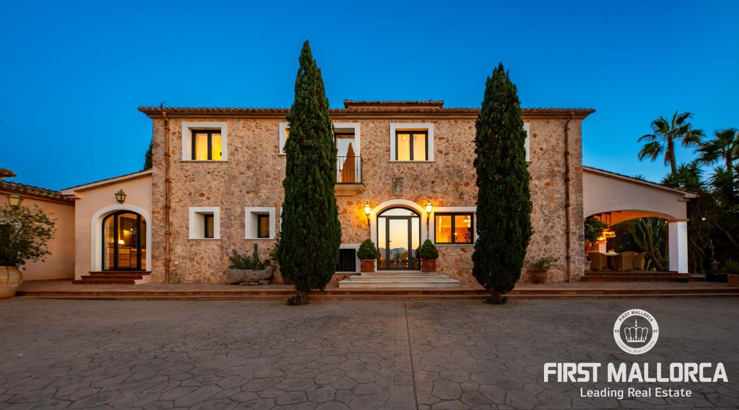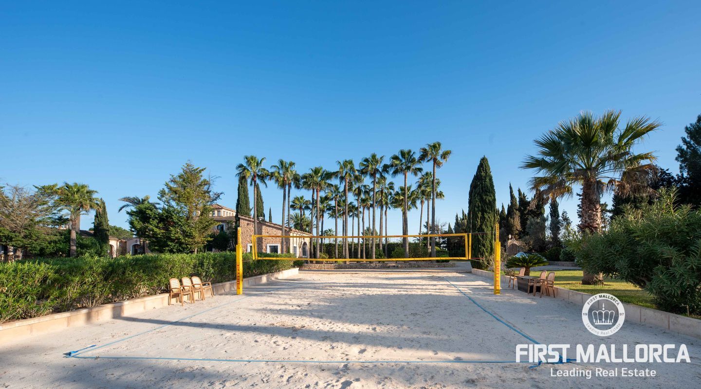 En vacker, bred väg kantad med palmer leder till huvudbyggnaden samt tre eleganta gästhus, som harmoniskt kombinerar traditionell mallorkinsk arkitektur med modern komfort. Med totalt åtta sovrum och sex badrum erbjuder denna fastighet generöst med utrymme för familj och gäster.