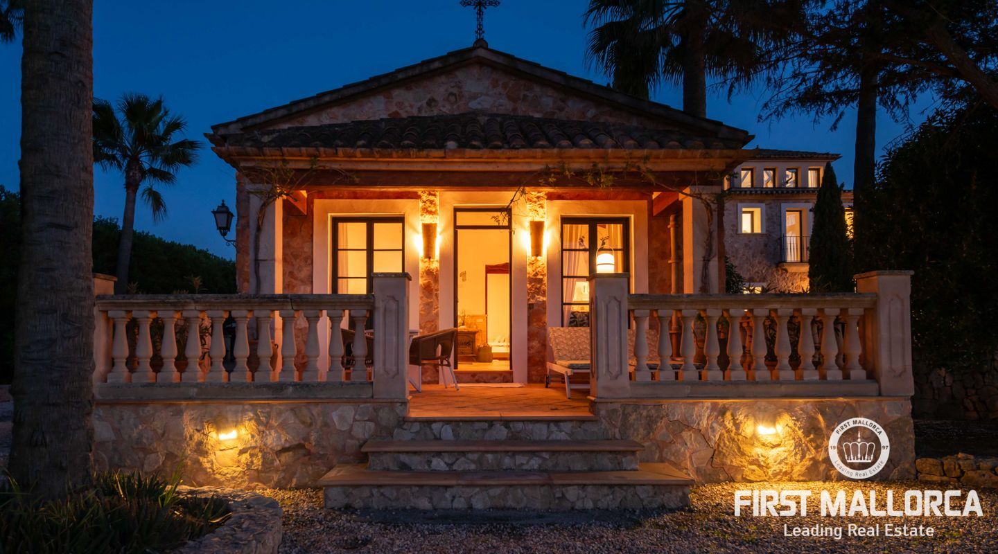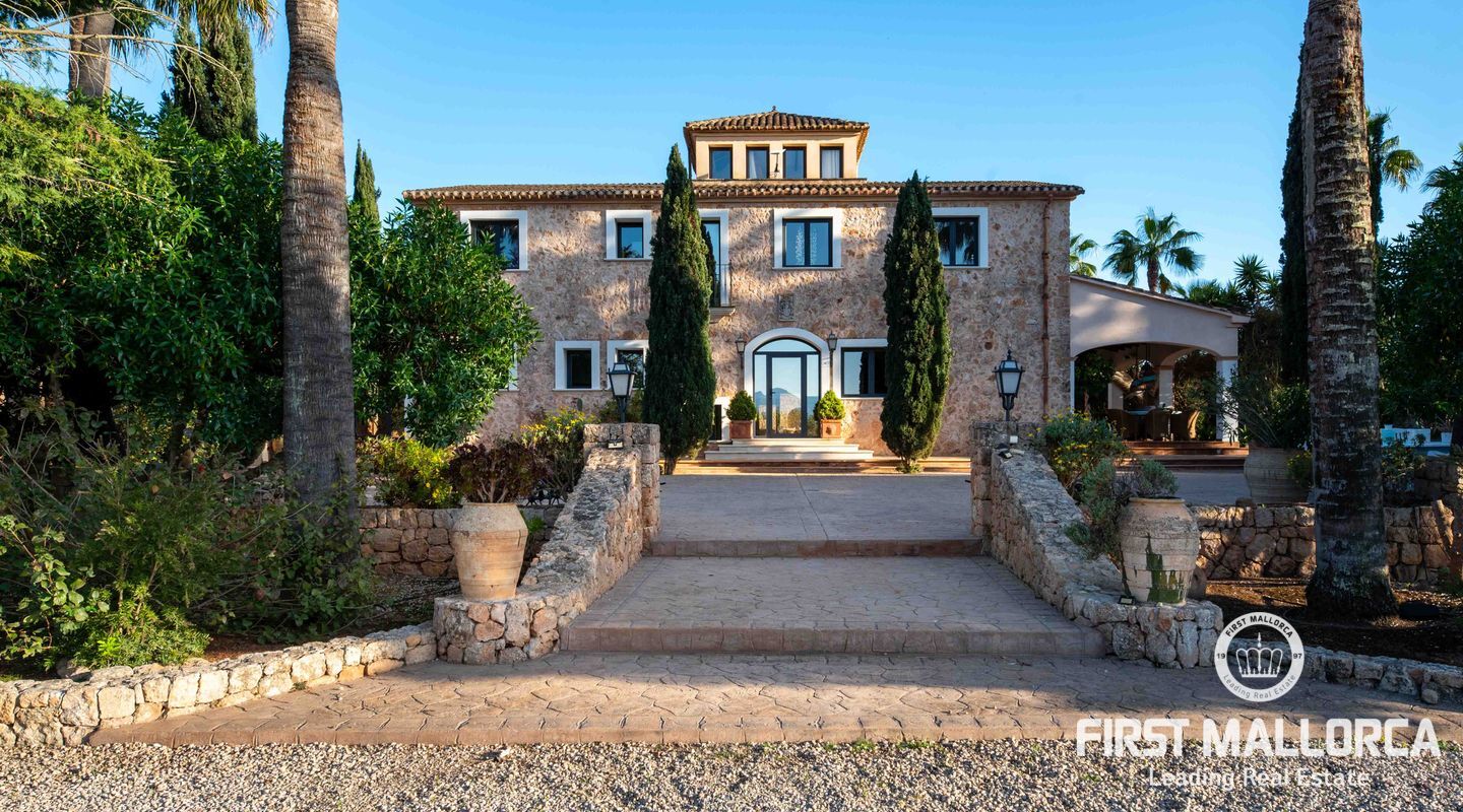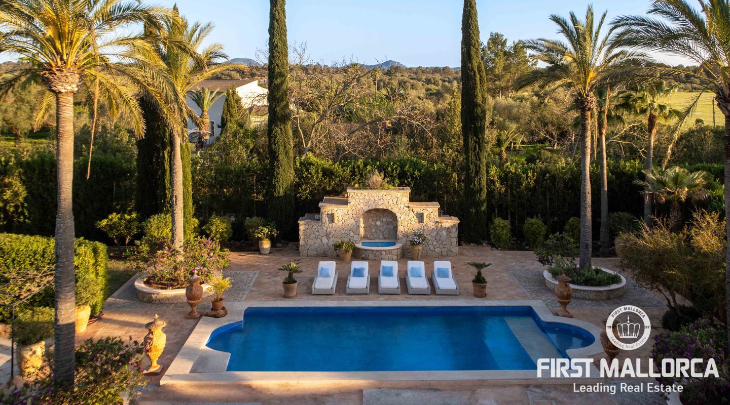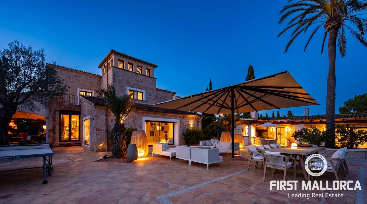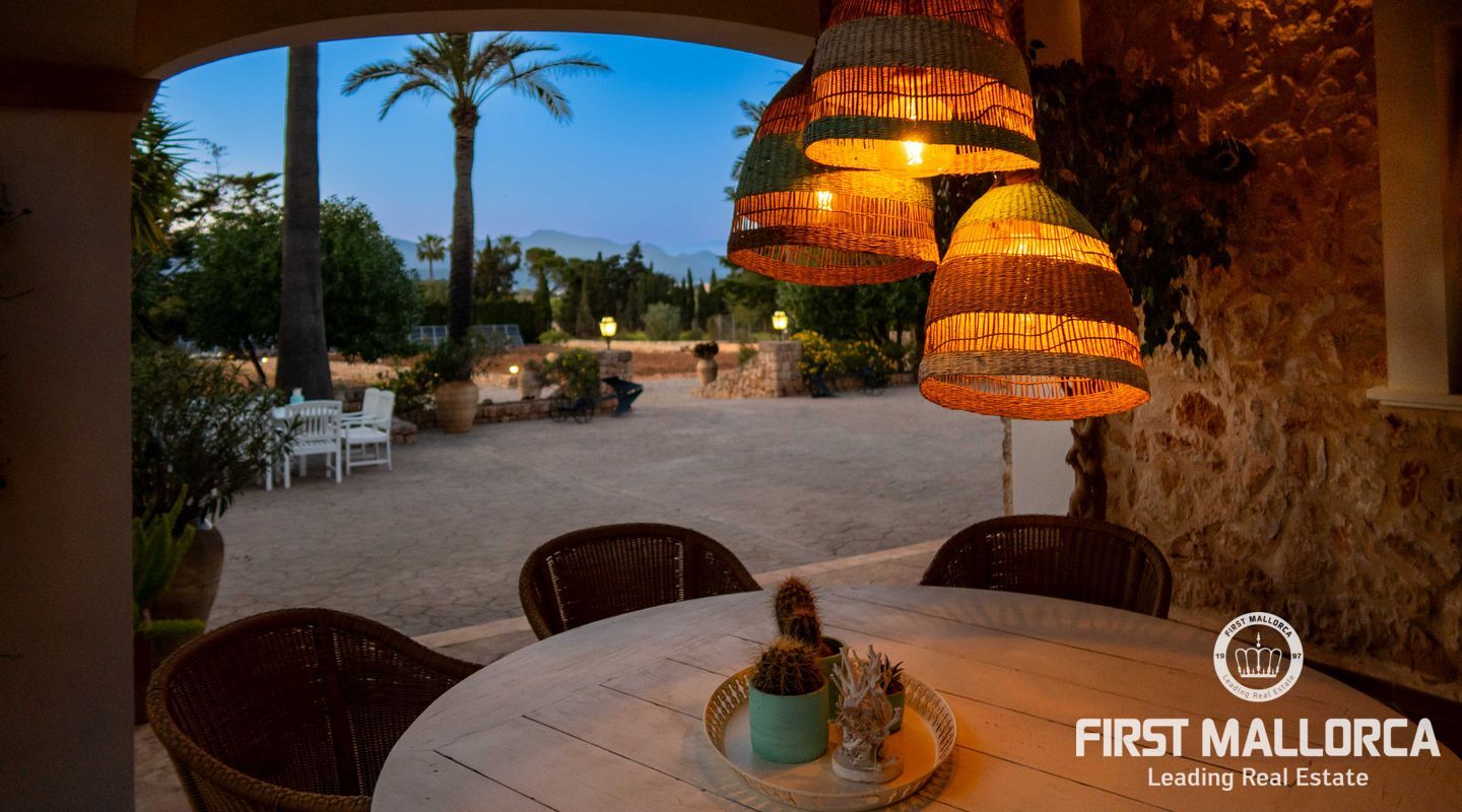 En vacker, bred väg kantad med palmer leder till huvudbyggnaden samt tre eleganta gästhus, som harmoniskt kombinerar traditionell mallorkinsk arkitektur med modern komfort. Med totalt åtta sovrum och sex badrum erbjuder denna fastighet generöst med utrymme för familj och gäster.