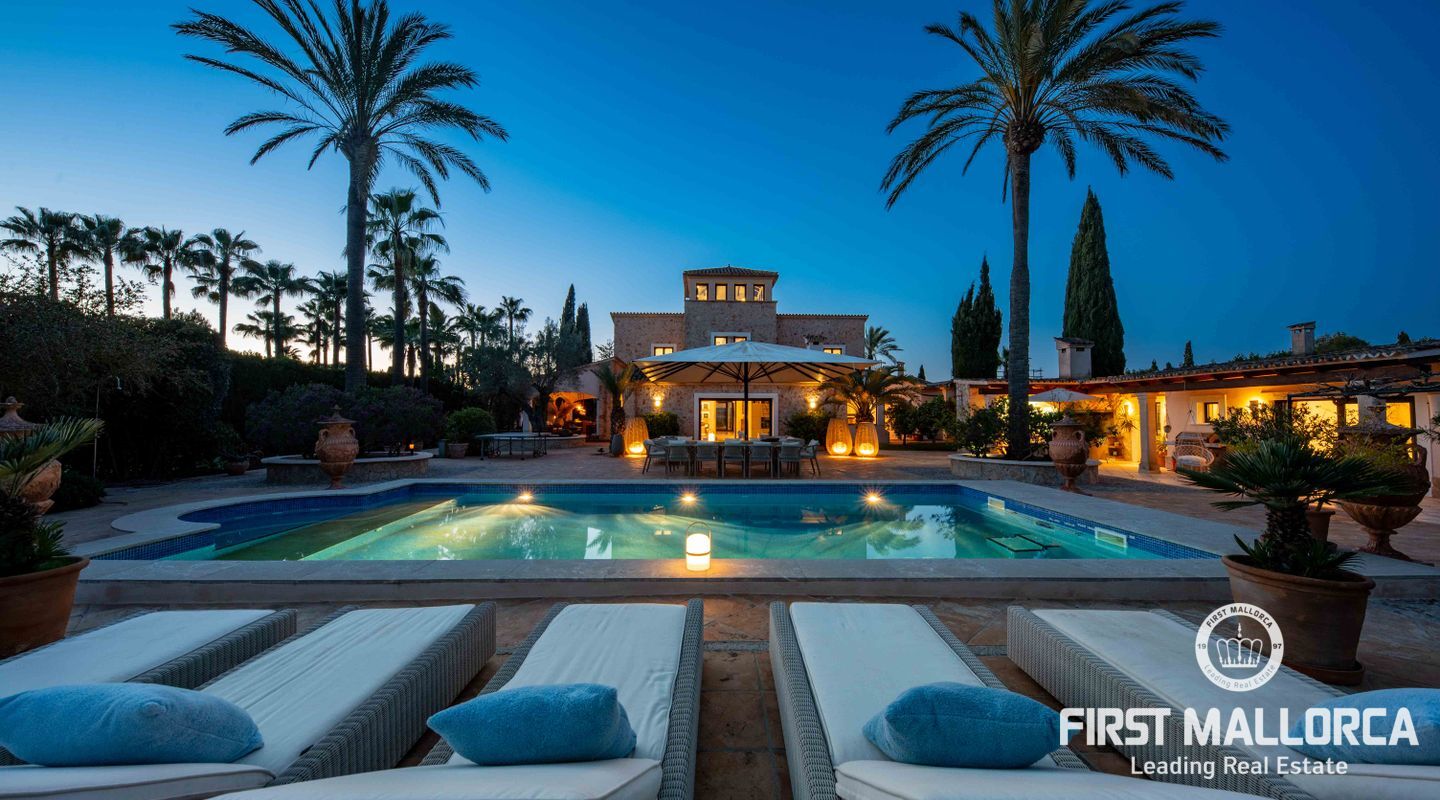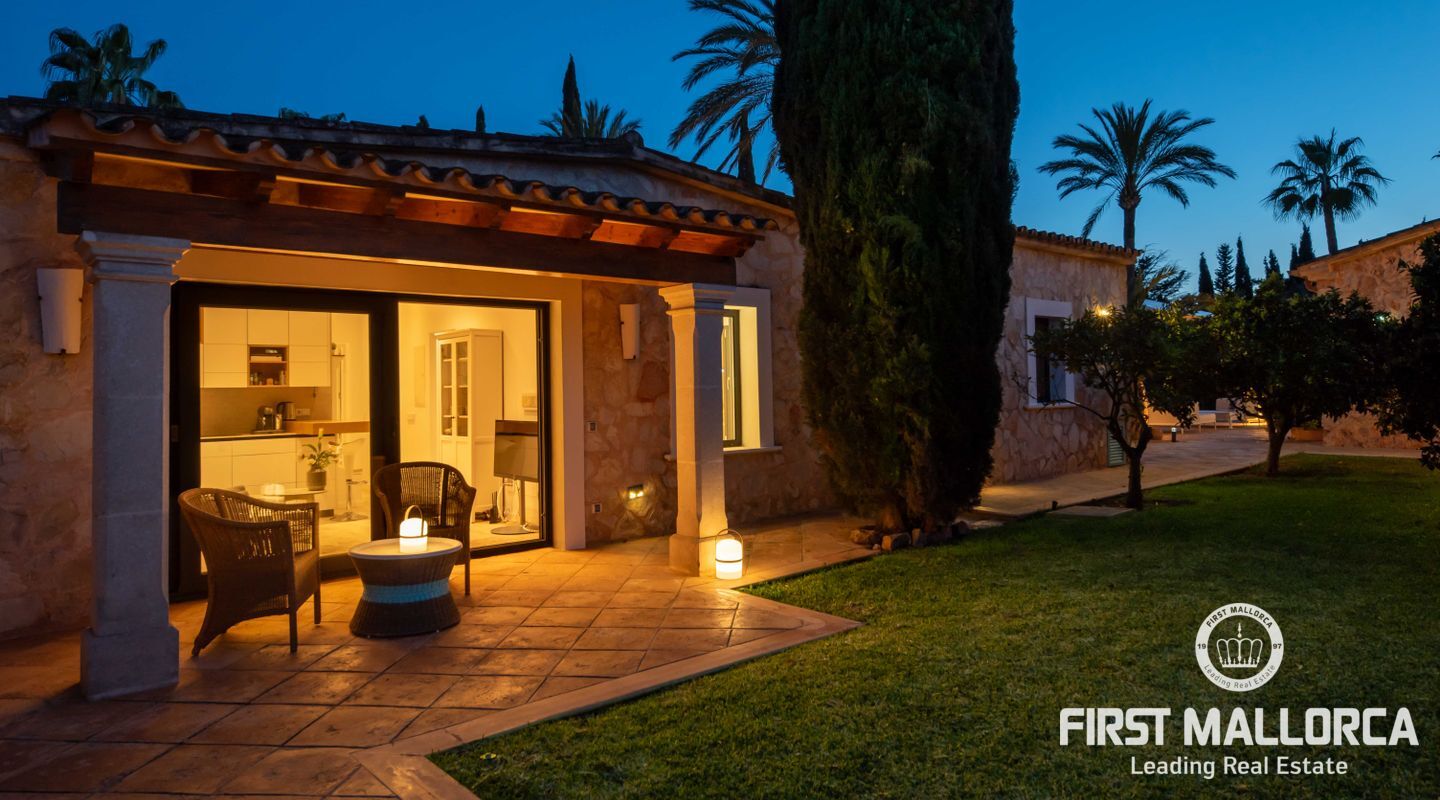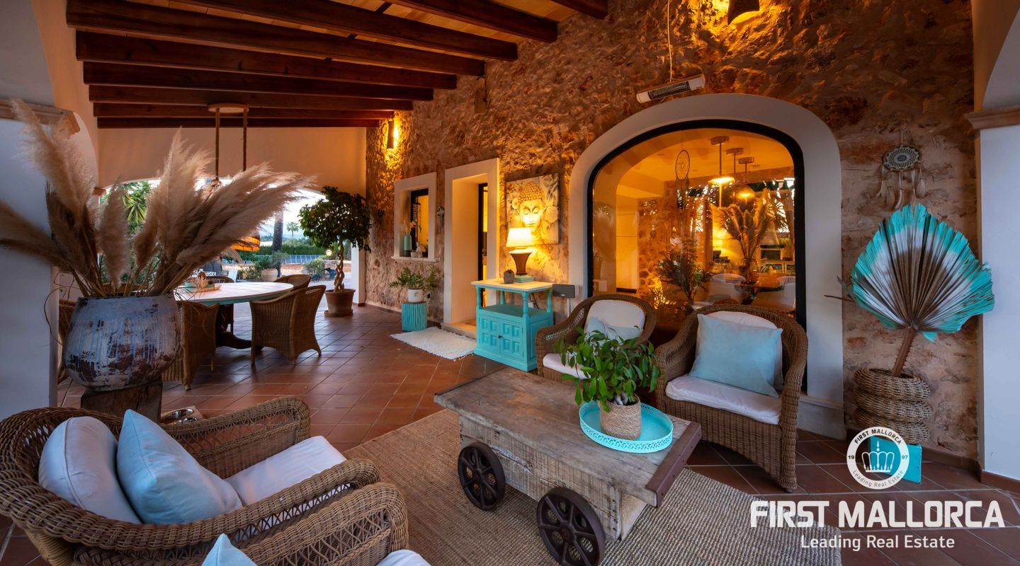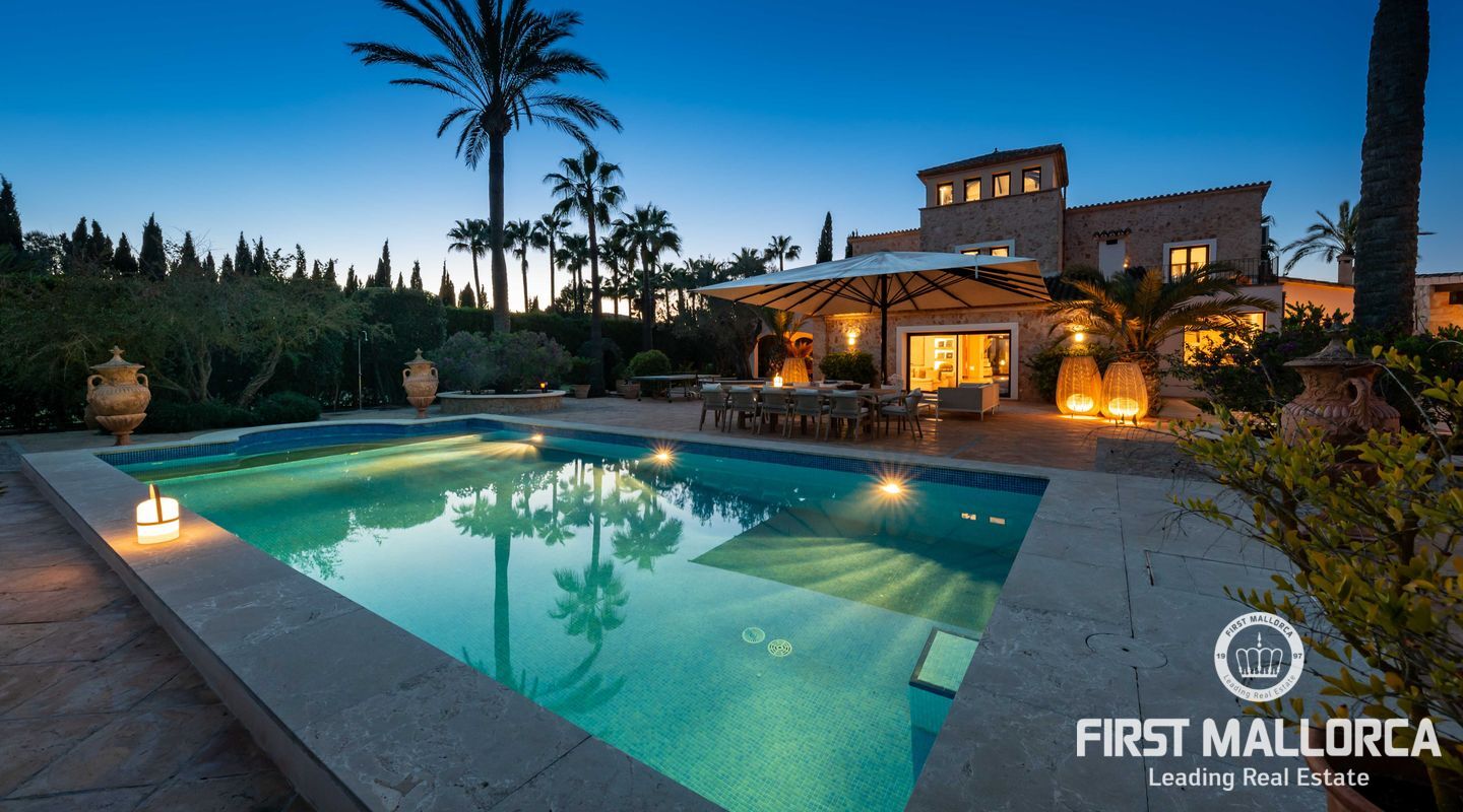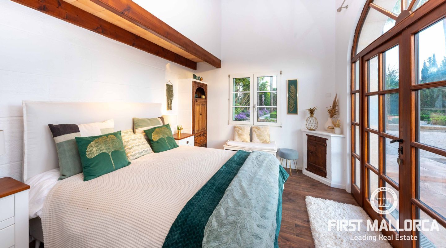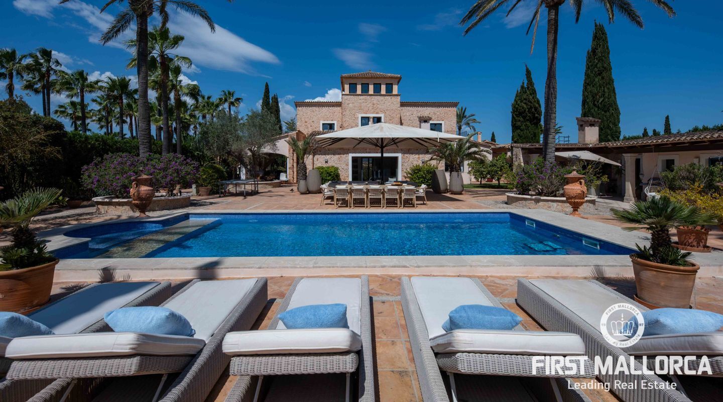 En vacker, bred väg kantad med palmer leder till huvudbyggnaden samt tre eleganta gästhus, som harmoniskt kombinerar traditionell mallorkinsk arkitektur med modern komfort. Med totalt åtta sovrum och sex badrum erbjuder denna fastighet generöst med utrymme för familj och gäster.