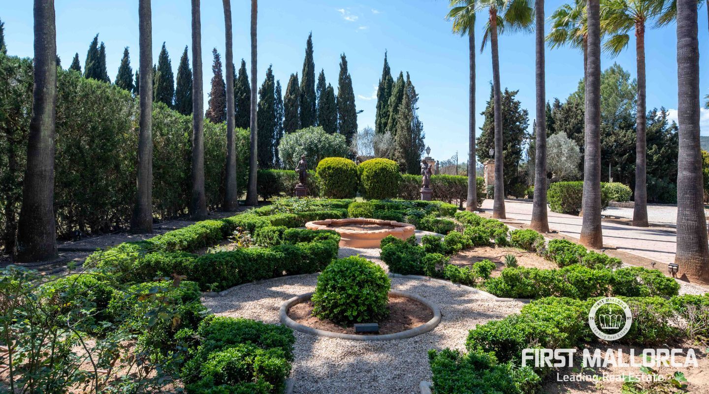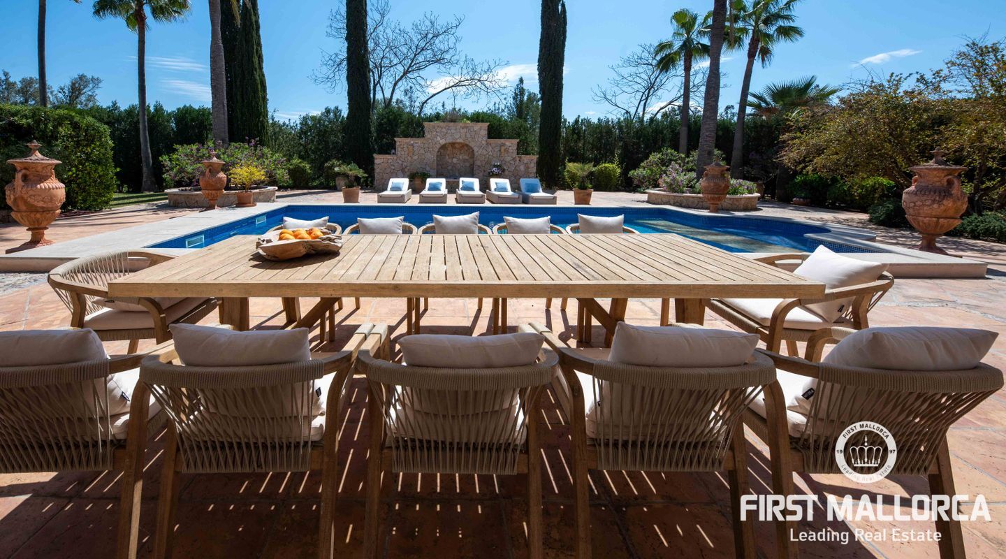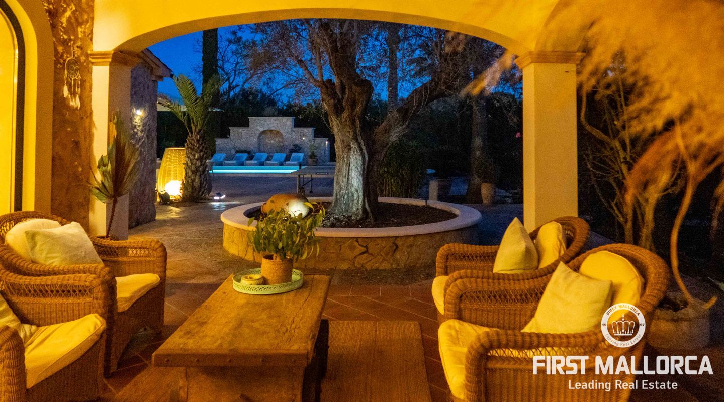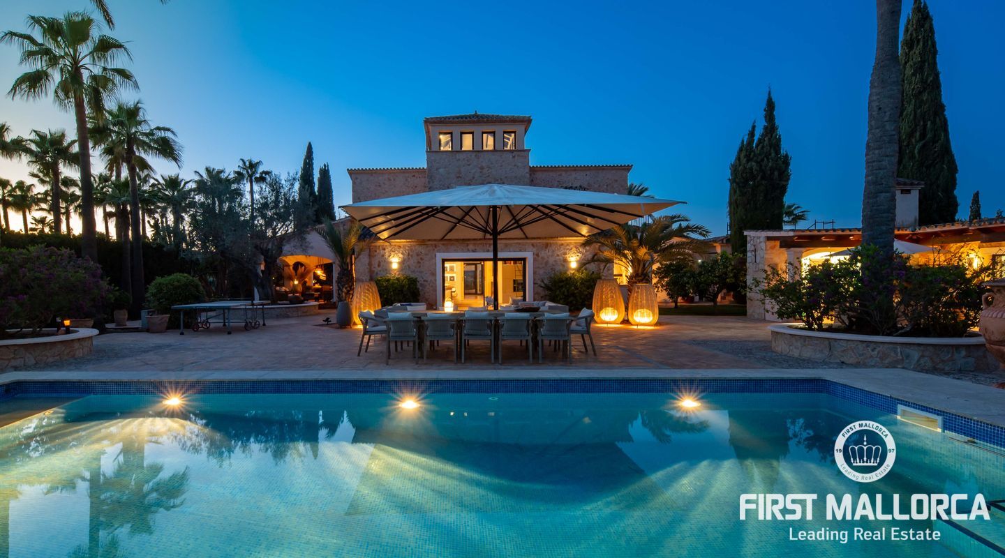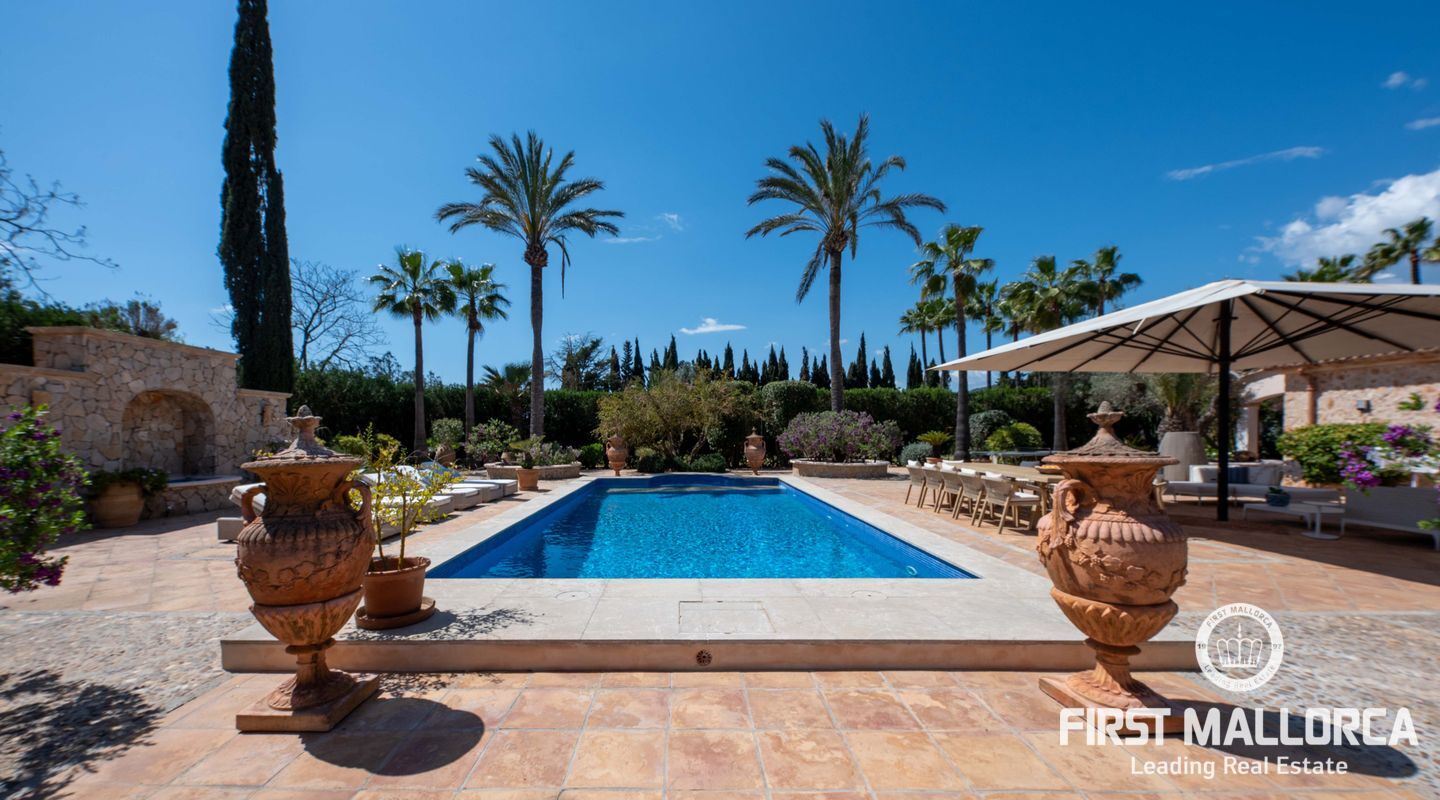 En vacker, bred väg kantad med palmer leder till huvudbyggnaden samt tre eleganta gästhus, som harmoniskt kombinerar traditionell mallorkinsk arkitektur med modern komfort. Med totalt åtta sovrum och sex badrum erbjuder denna fastighet generöst med utrymme för familj och gäster.