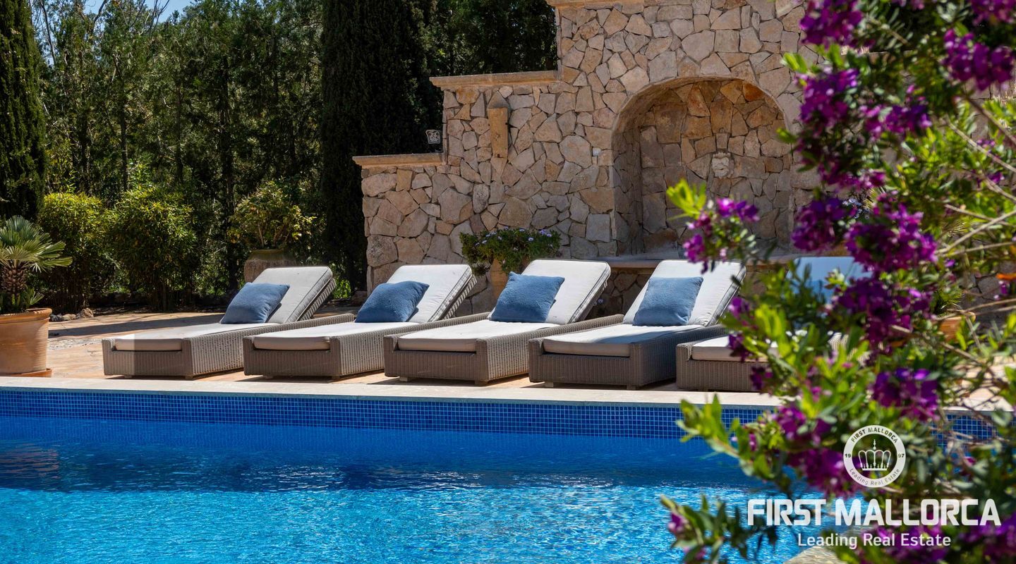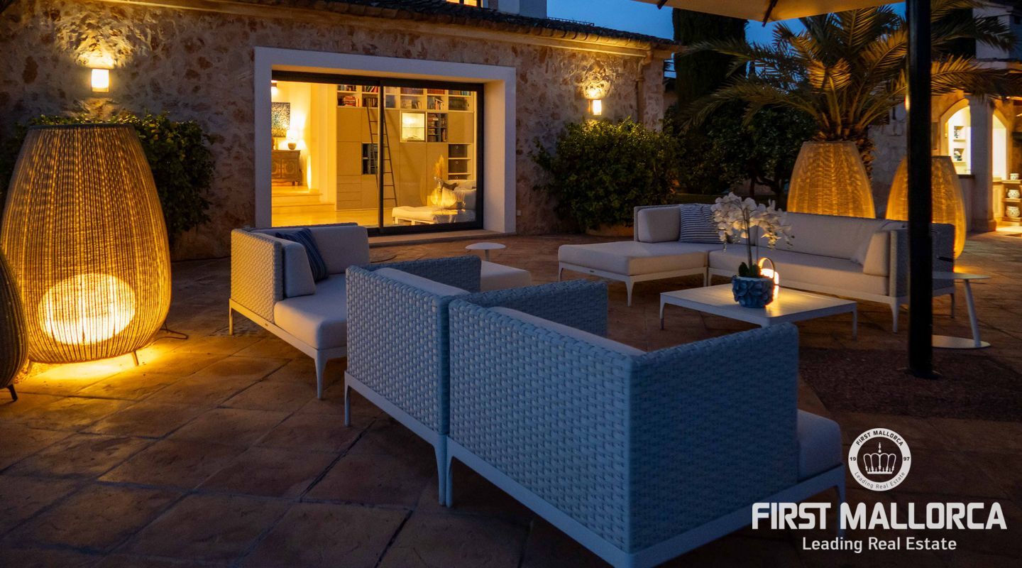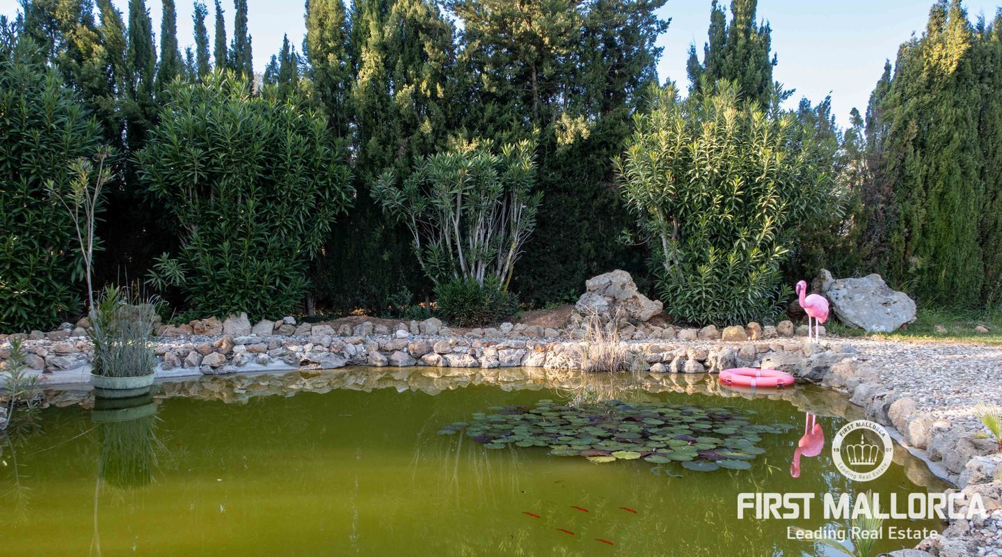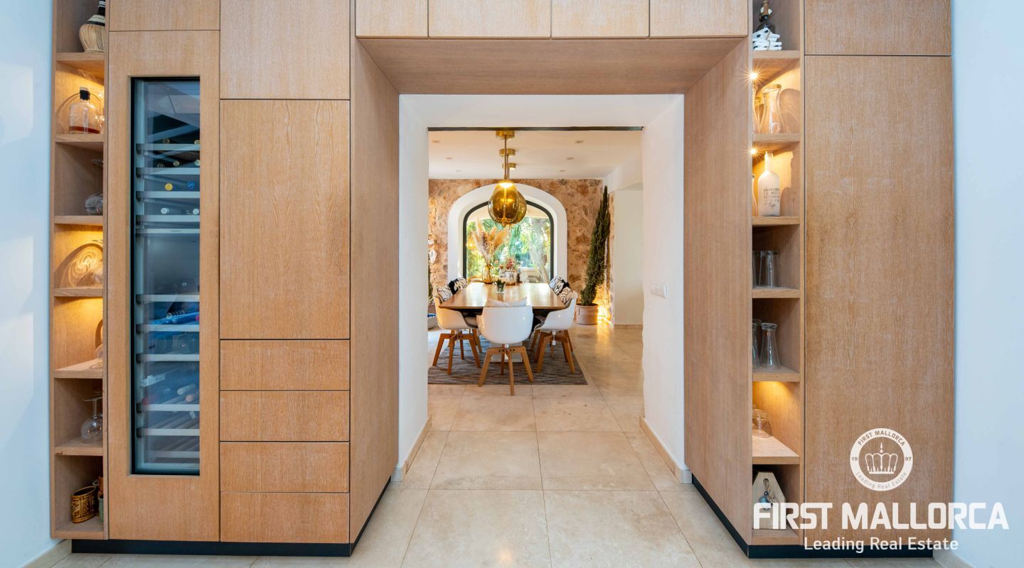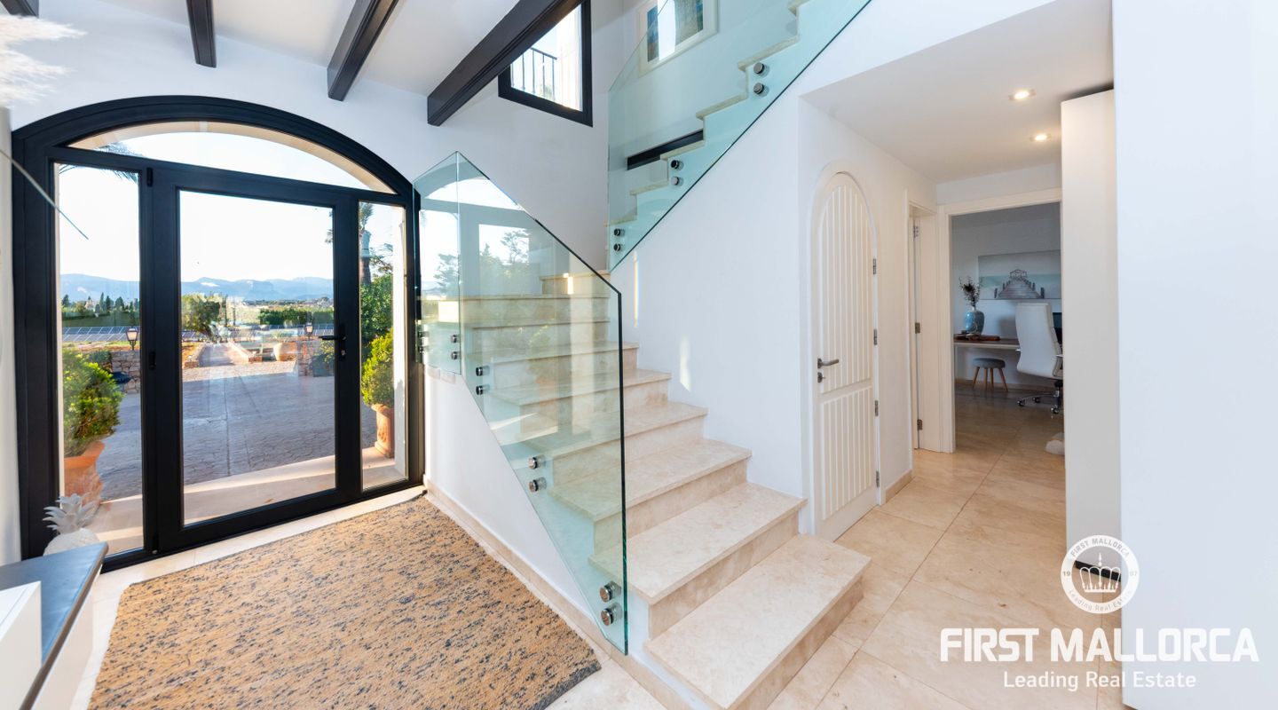 En vacker, bred väg kantad med palmer leder till huvudbyggnaden samt tre eleganta gästhus, som harmoniskt kombinerar traditionell mallorkinsk arkitektur med modern komfort. Med totalt åtta sovrum och sex badrum erbjuder denna fastighet generöst med utrymme för familj och gäster.