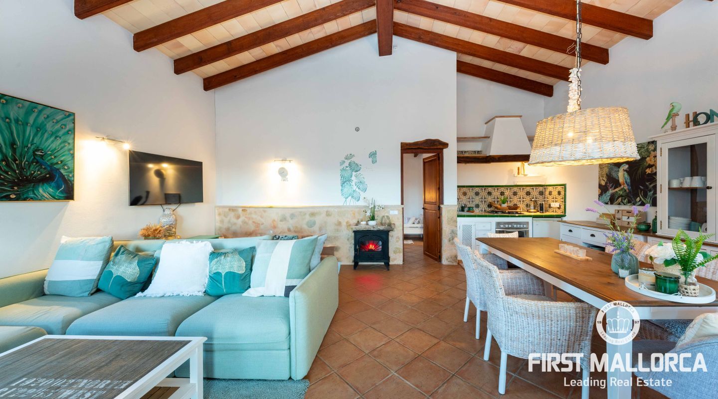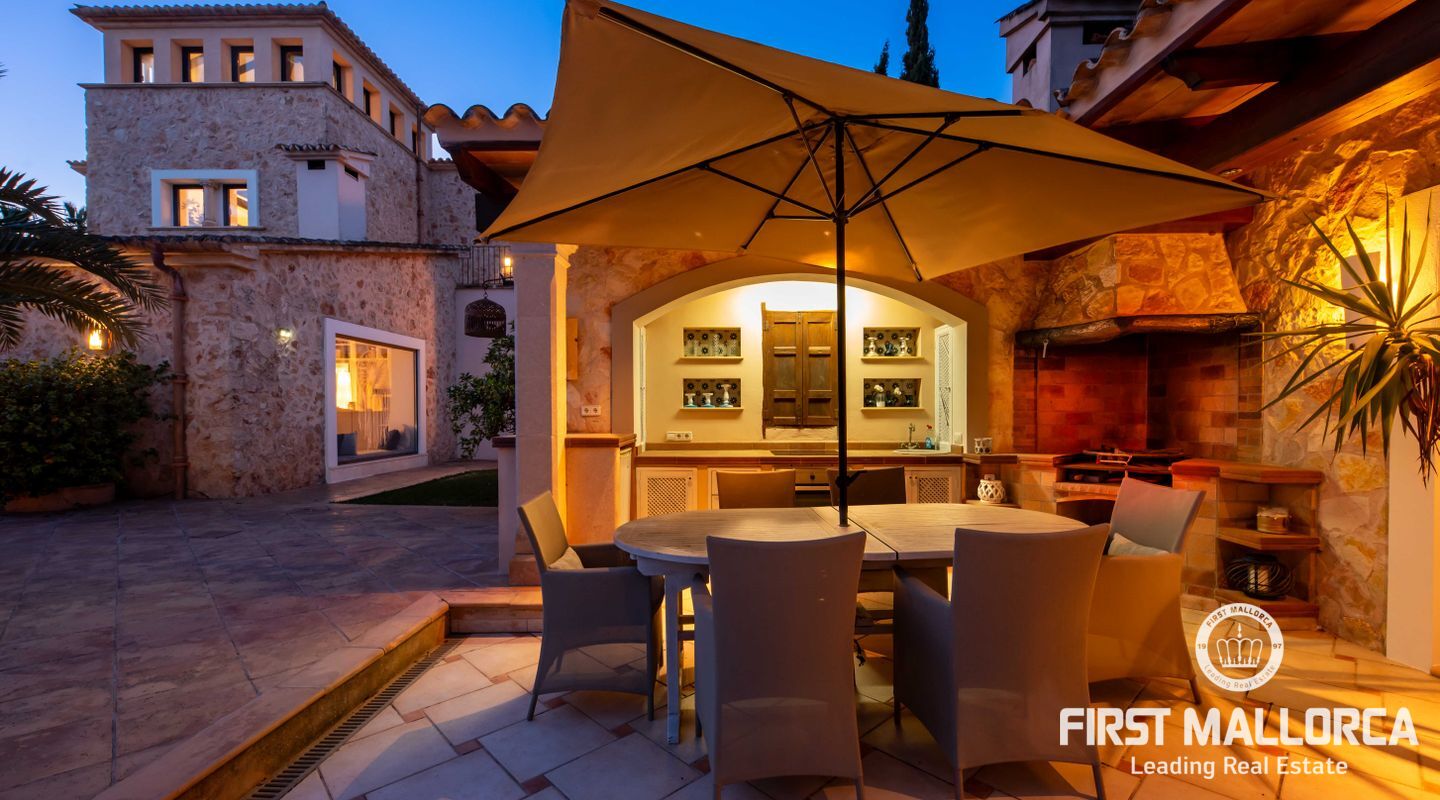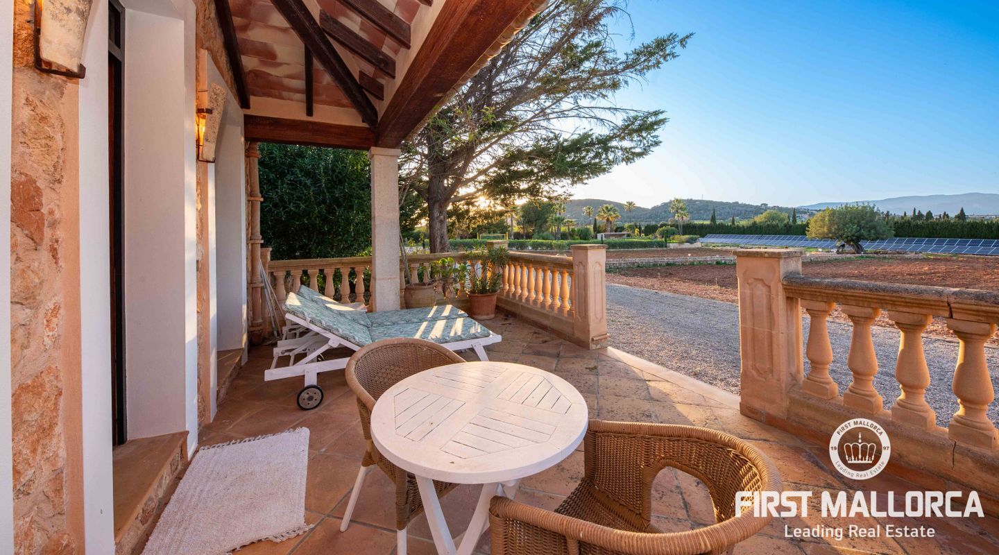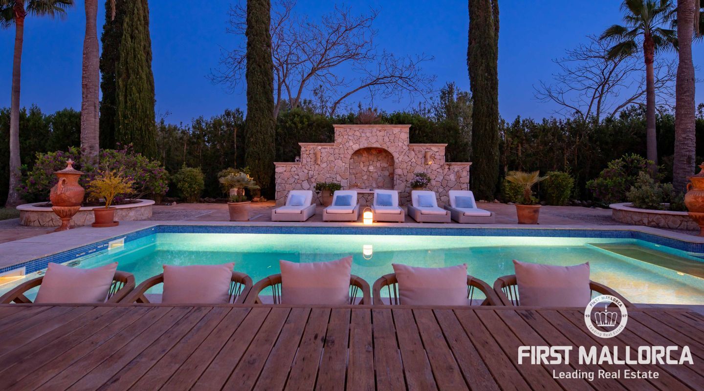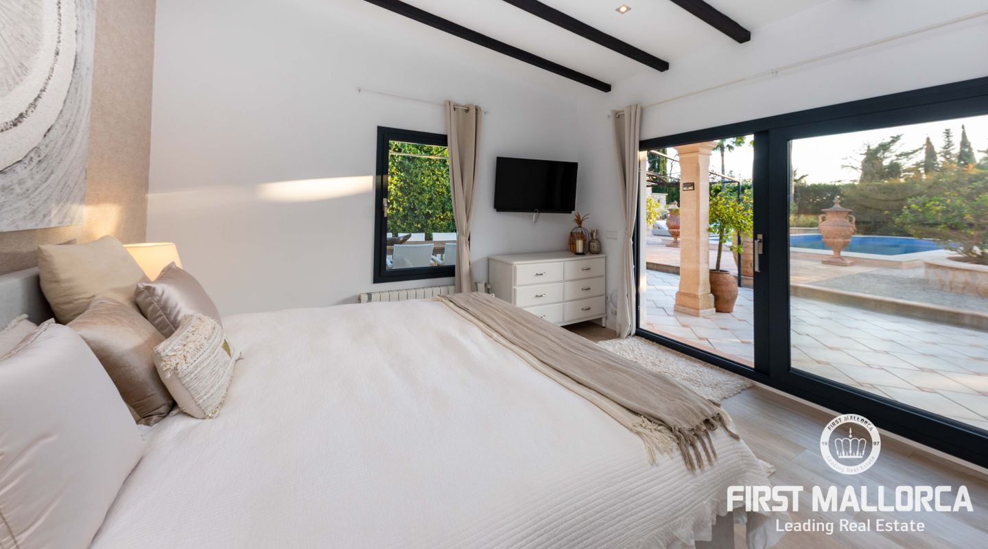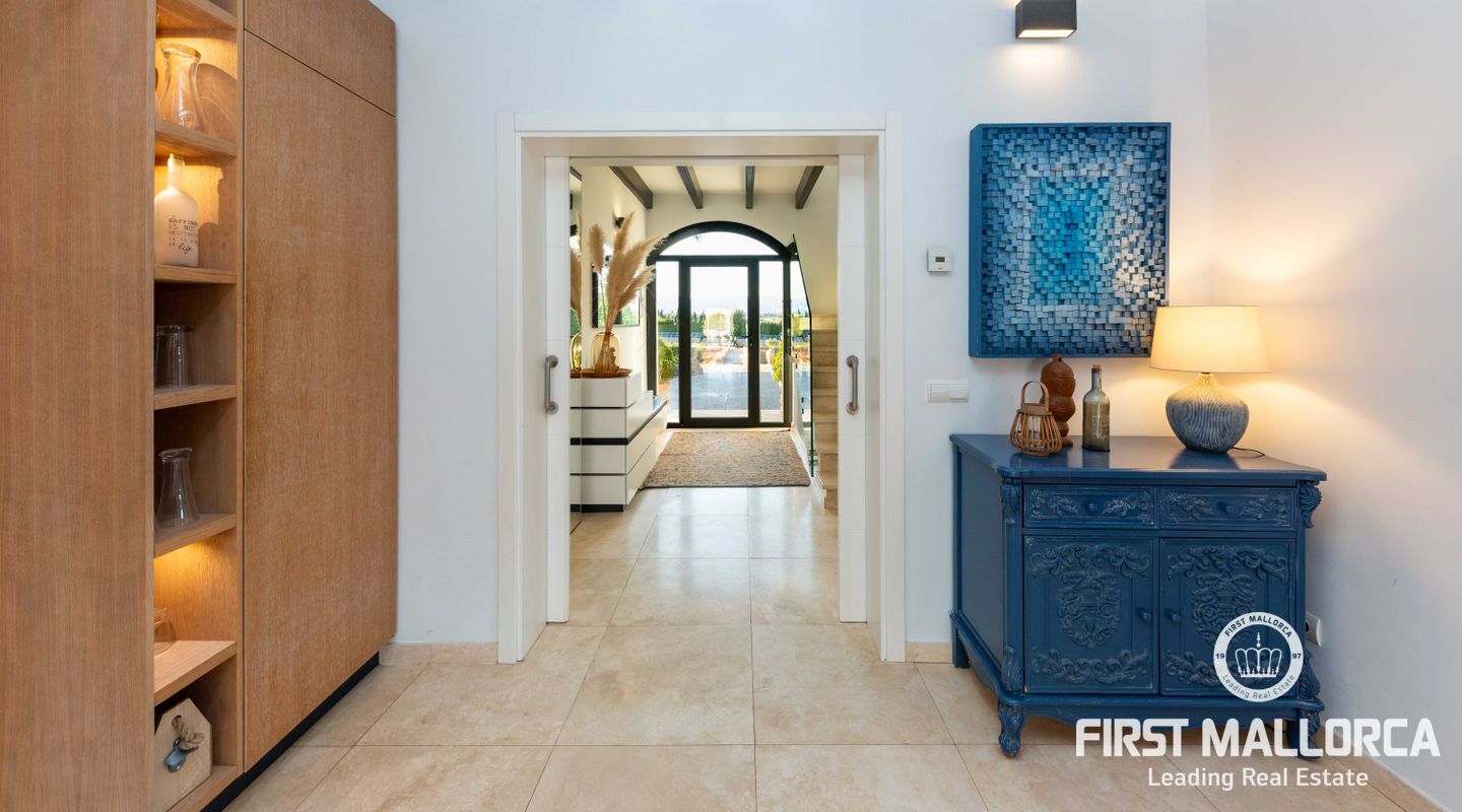 En vacker, bred väg kantad med palmer leder till huvudbyggnaden samt tre eleganta gästhus, som harmoniskt kombinerar traditionell mallorkinsk arkitektur med modern komfort. Med totalt åtta sovrum och sex badrum erbjuder denna fastighet generöst med utrymme för familj och gäster.
