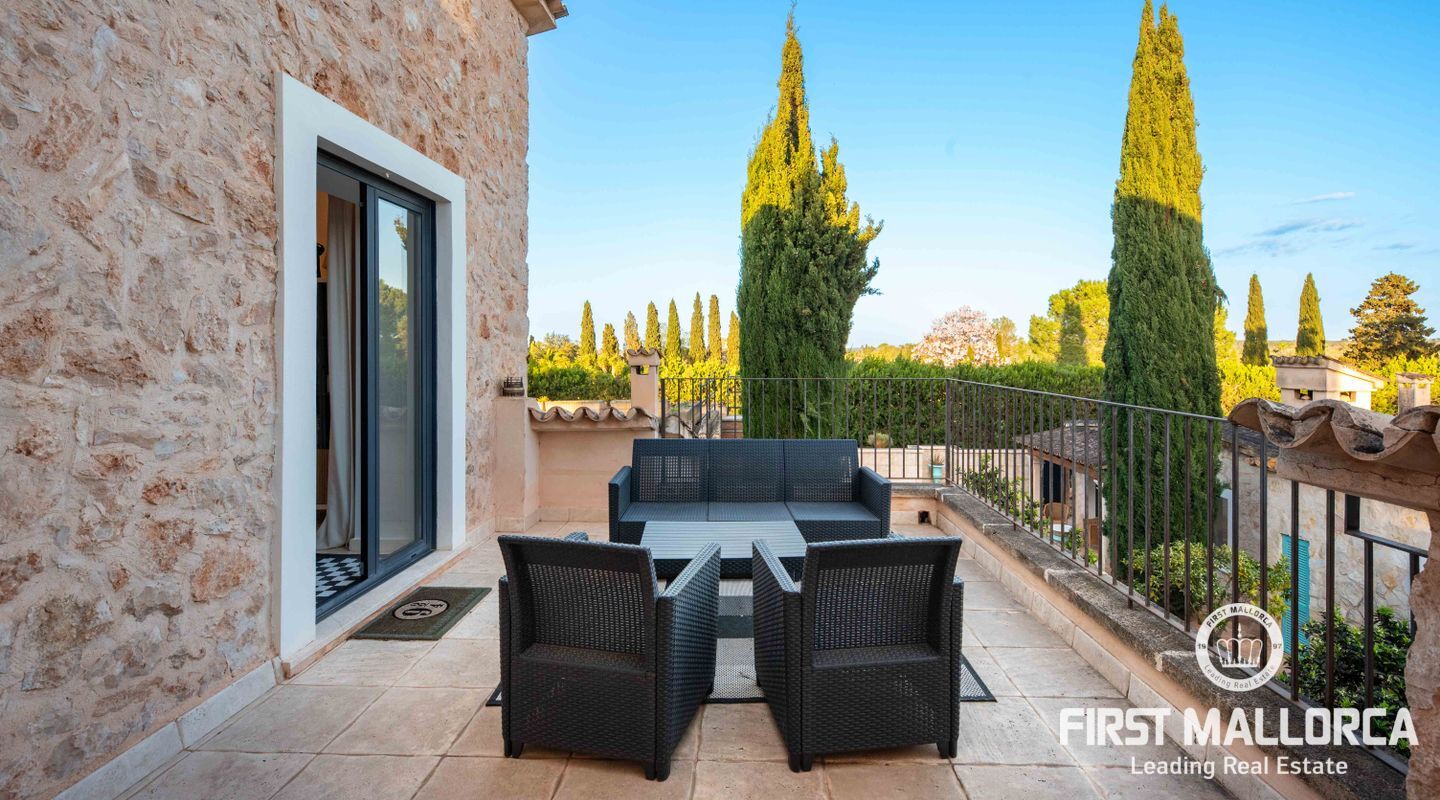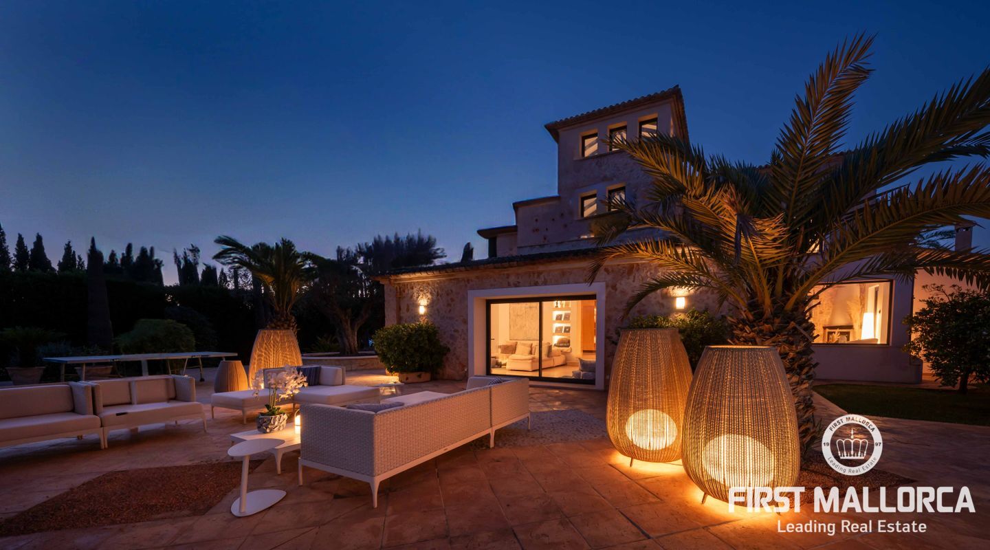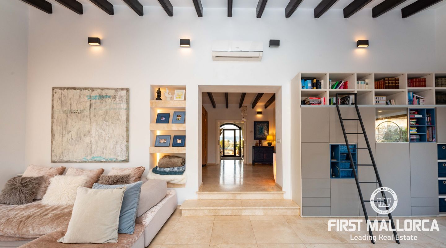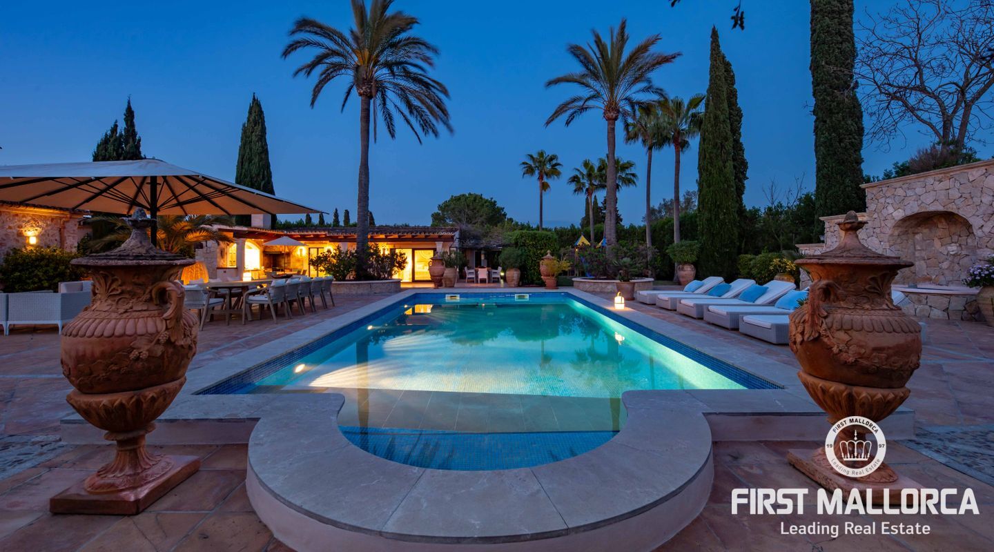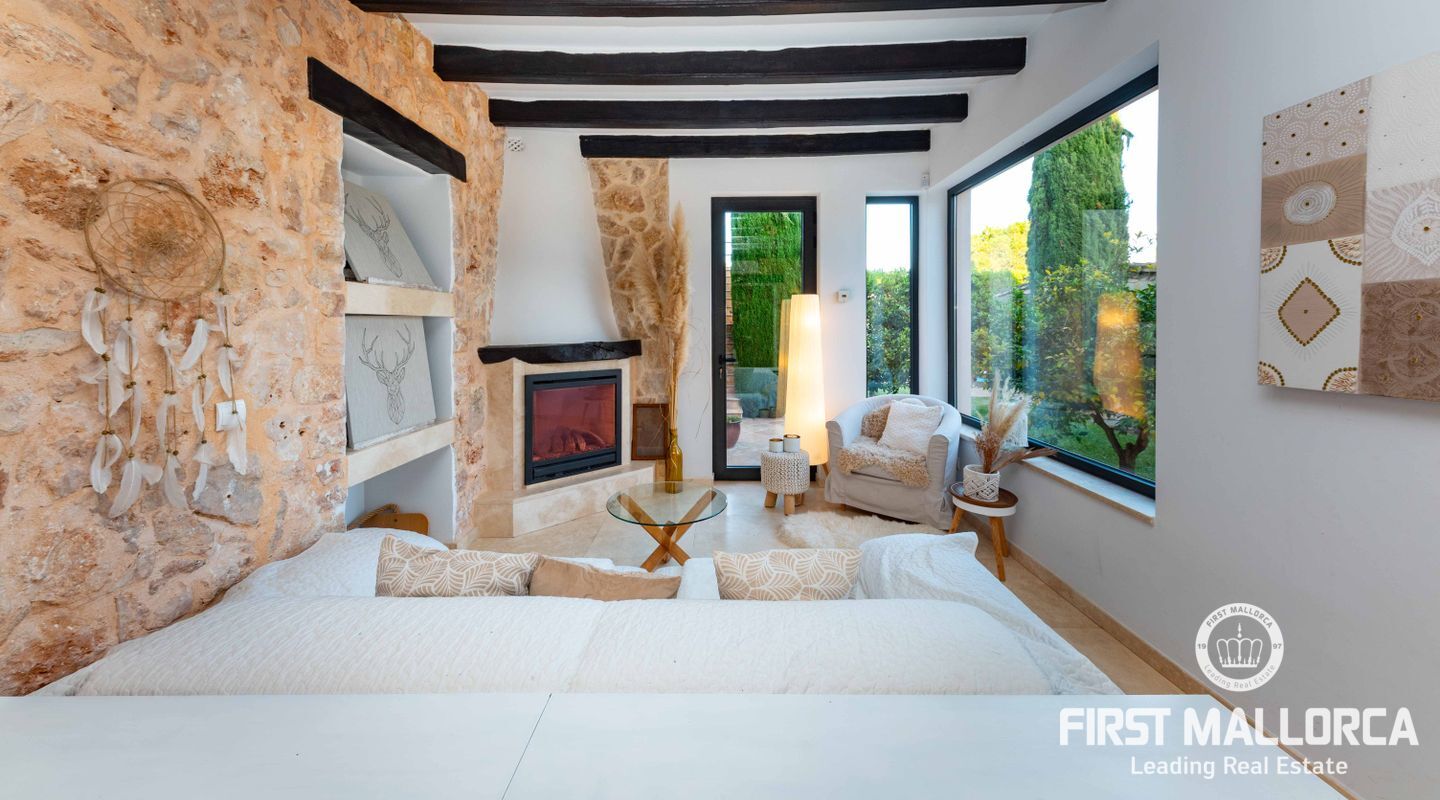 En vacker, bred väg kantad med palmer leder till huvudbyggnaden samt tre eleganta gästhus, som harmoniskt kombinerar traditionell mallorkinsk arkitektur med modern komfort. Med totalt åtta sovrum och sex badrum erbjuder denna fastighet generöst med utrymme för familj och gäster.