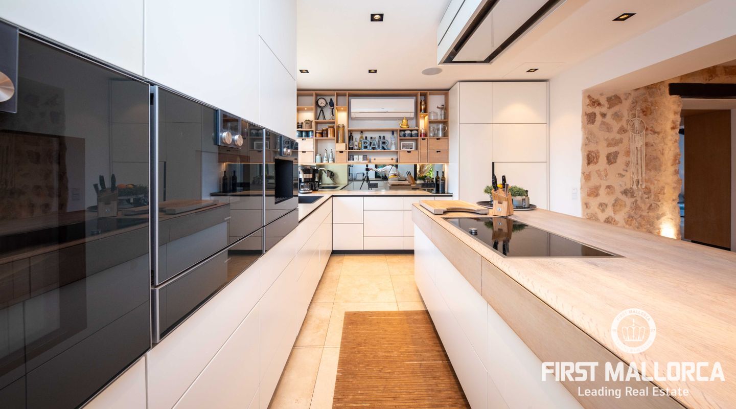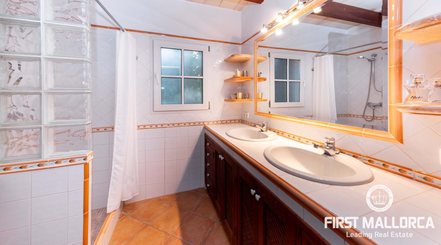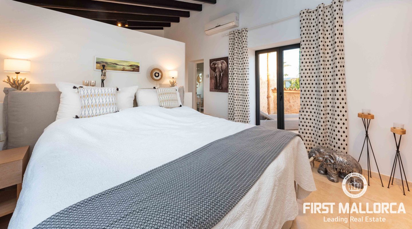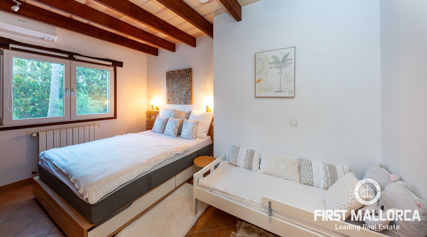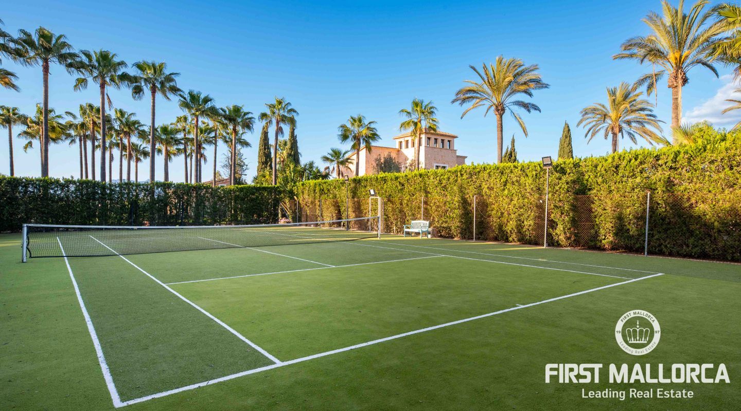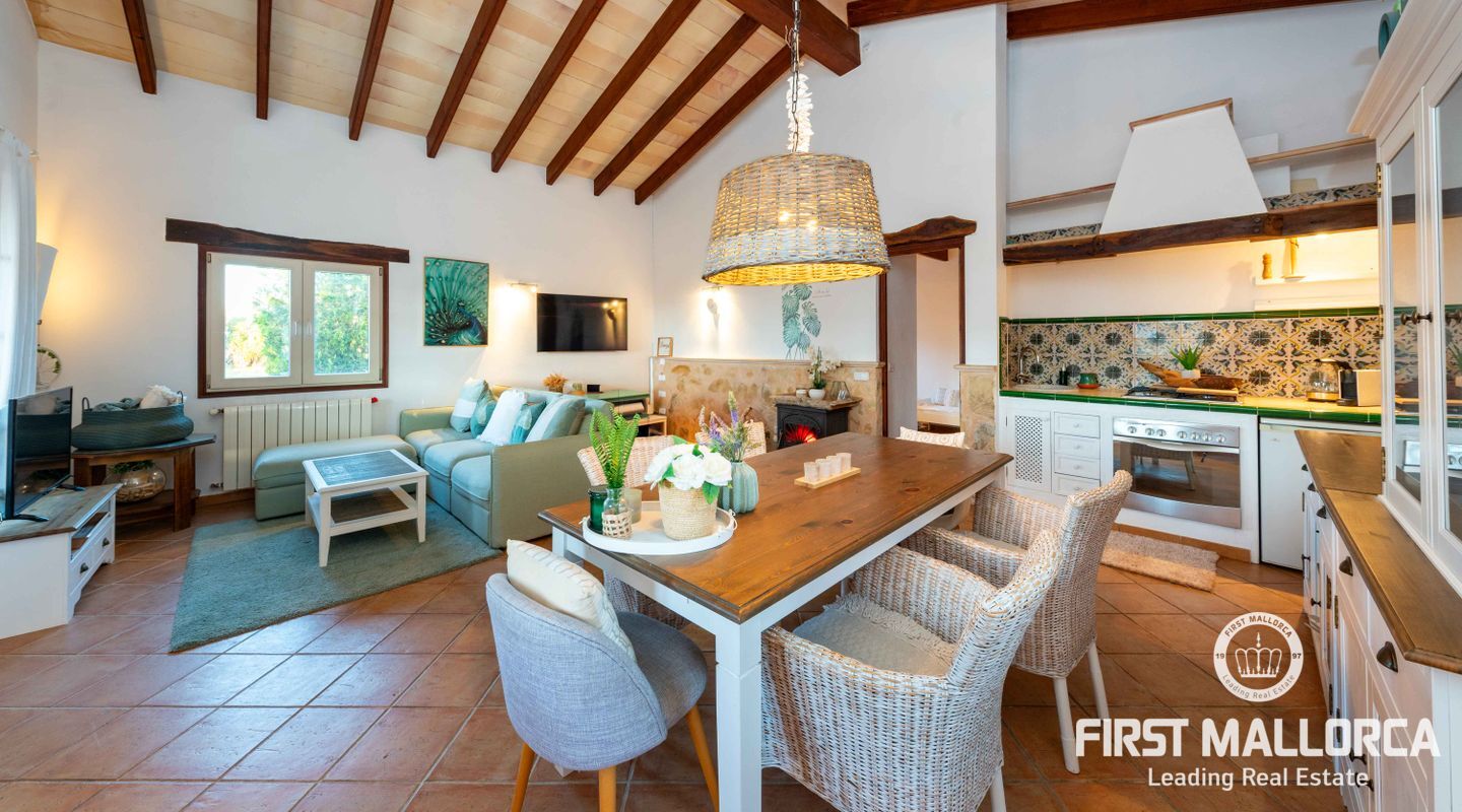 En vacker, bred väg kantad med palmer leder till huvudbyggnaden samt tre eleganta gästhus, som harmoniskt kombinerar traditionell mallorkinsk arkitektur med modern komfort. Med totalt åtta sovrum och sex badrum erbjuder denna fastighet generöst med utrymme för familj och gäster.