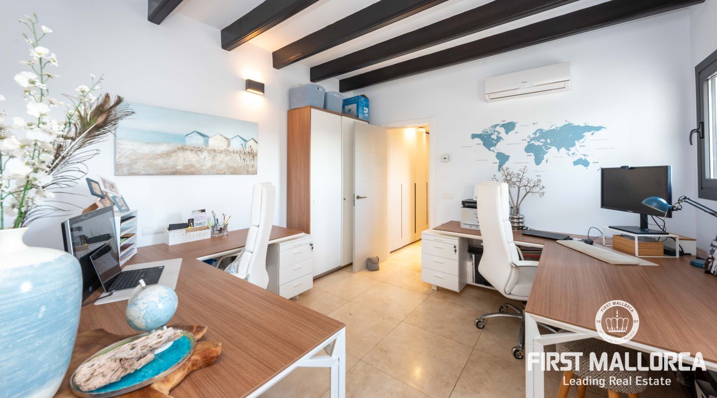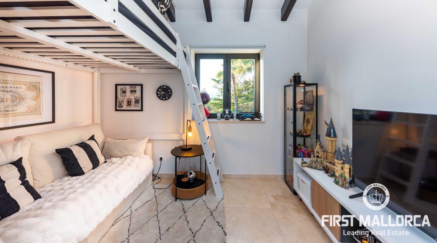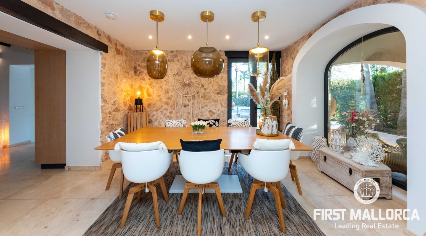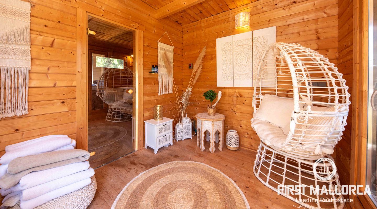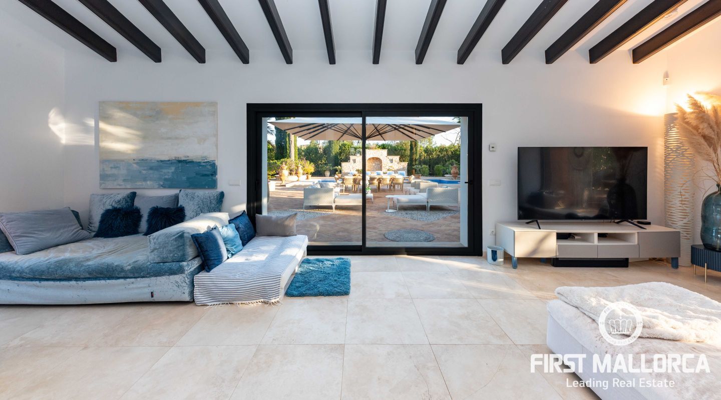 En vacker, bred väg kantad med palmer leder till huvudbyggnaden samt tre eleganta gästhus, som harmoniskt kombinerar traditionell mallorkinsk arkitektur med modern komfort. Med totalt åtta sovrum och sex badrum erbjuder denna fastighet generöst med utrymme för familj och gäster.
