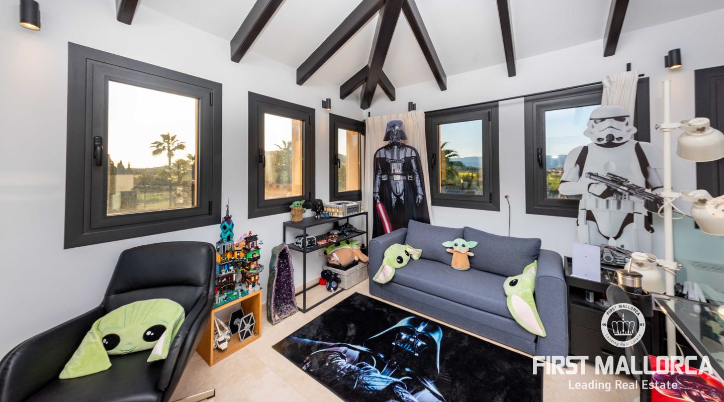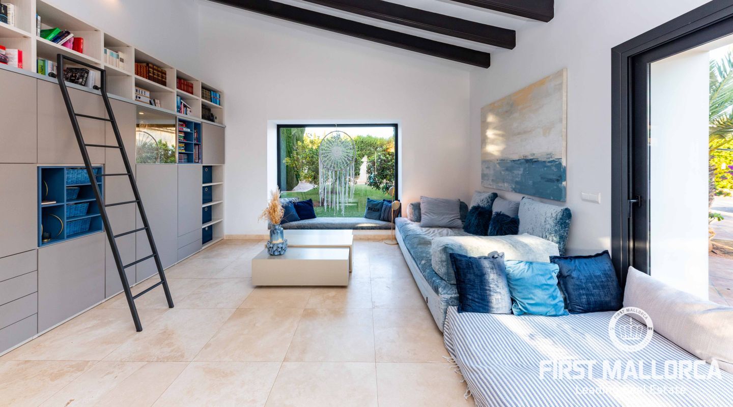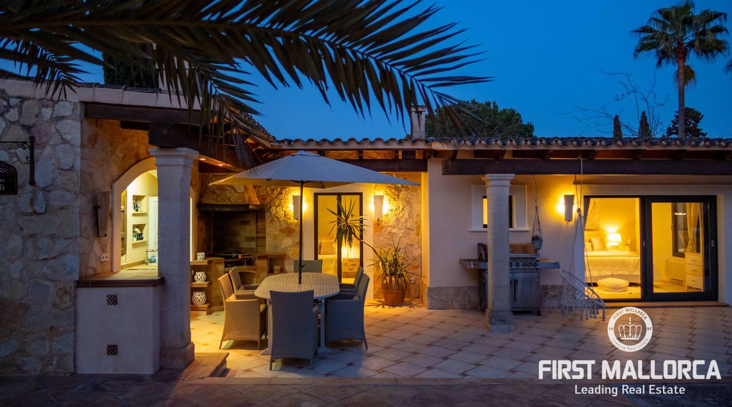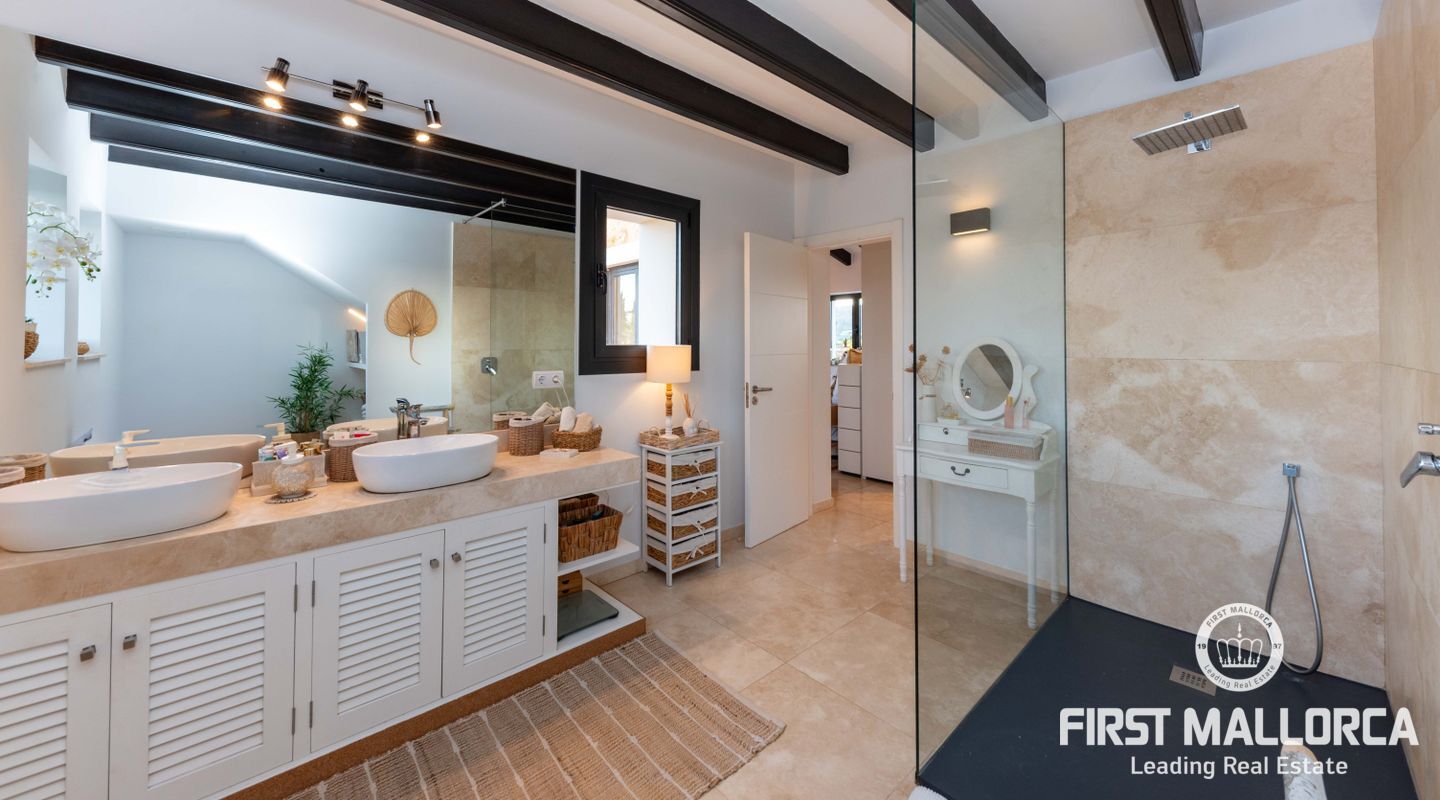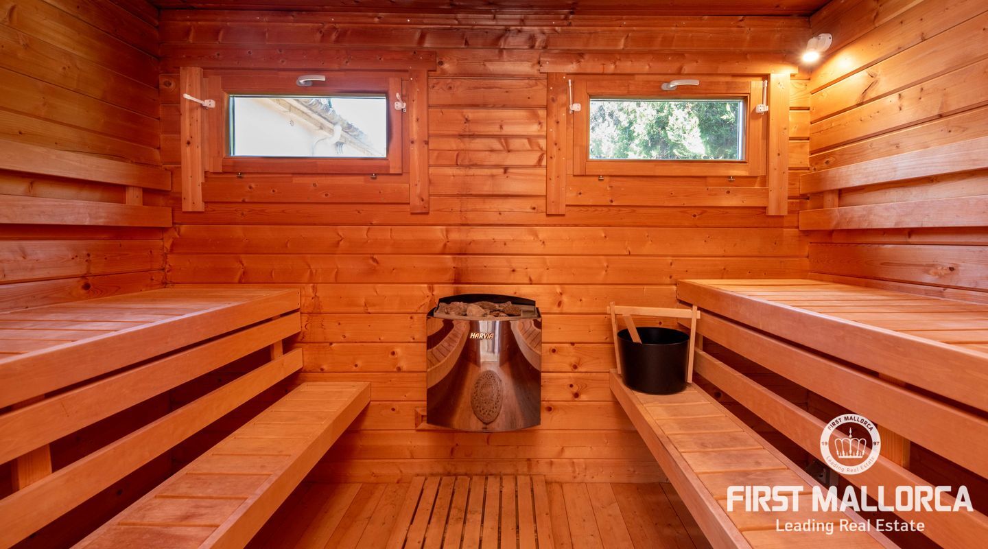 En vacker, bred väg kantad med palmer leder till huvudbyggnaden samt tre eleganta gästhus, som harmoniskt kombinerar traditionell mallorkinsk arkitektur med modern komfort. Med totalt åtta sovrum och sex badrum erbjuder denna fastighet generöst med utrymme för familj och gäster.