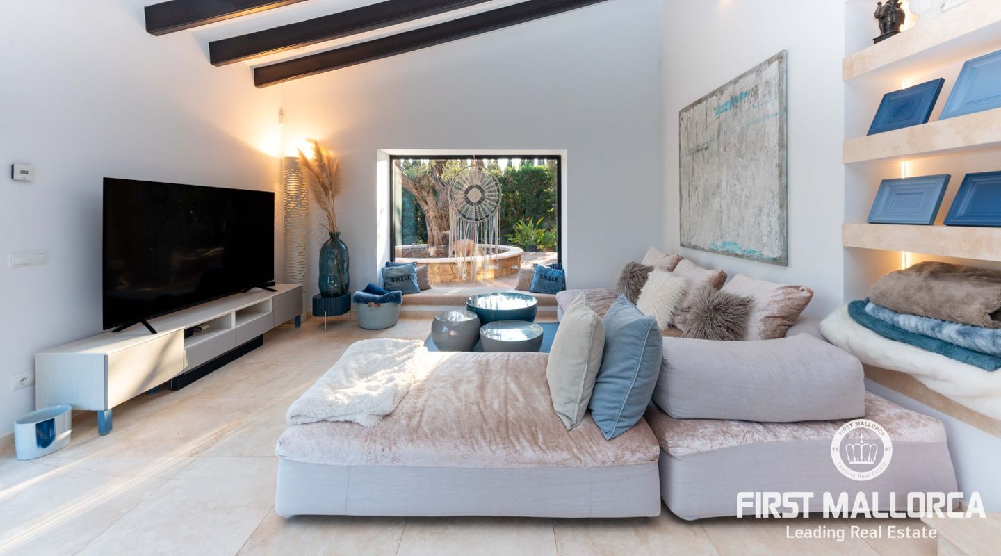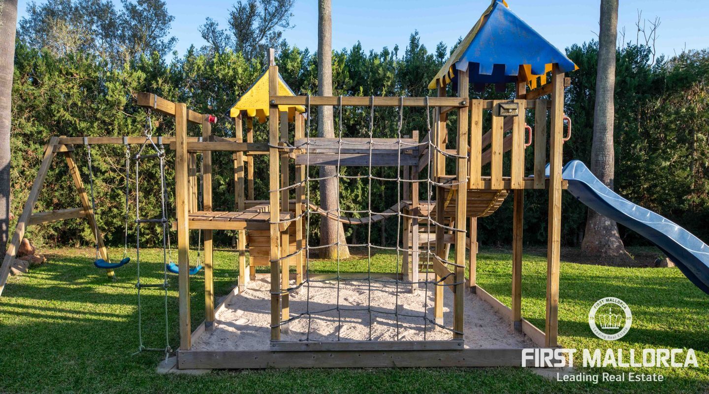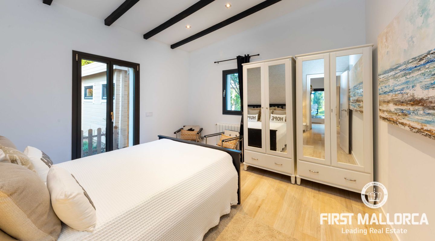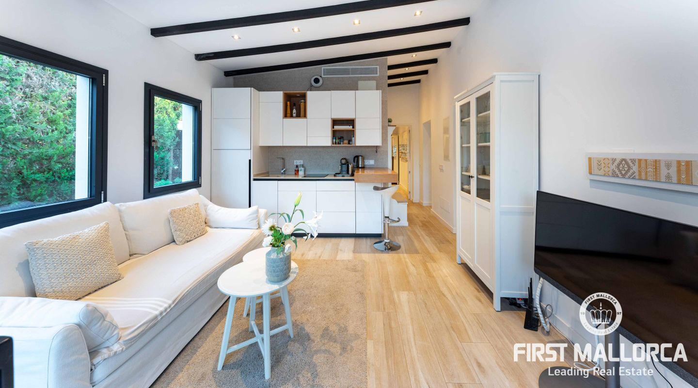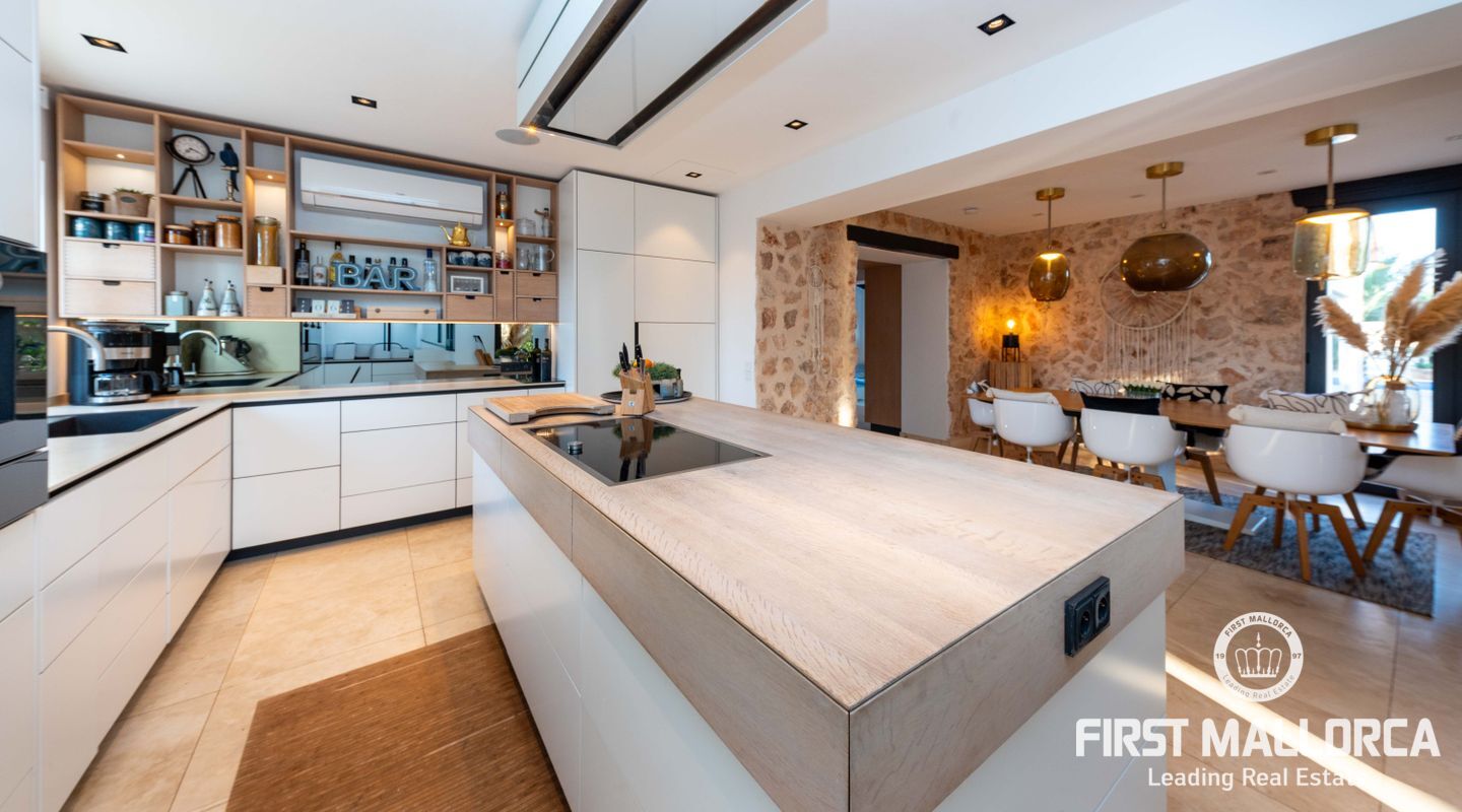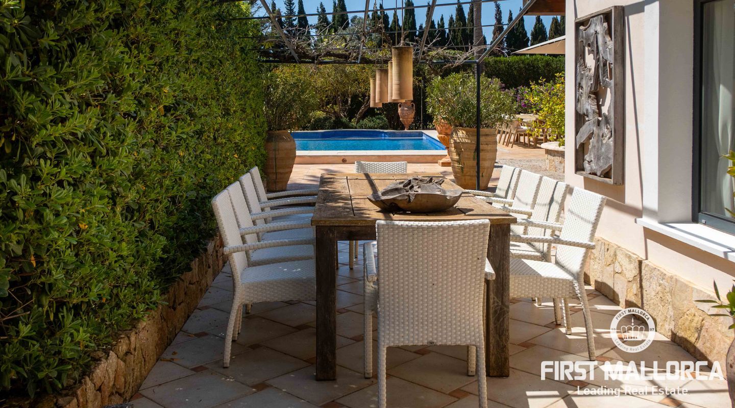 En vacker, bred väg kantad med palmer leder till huvudbyggnaden samt tre eleganta gästhus, som harmoniskt kombinerar traditionell mallorkinsk arkitektur med modern komfort. Med totalt åtta sovrum och sex badrum erbjuder denna fastighet generöst med utrymme för familj och gäster.