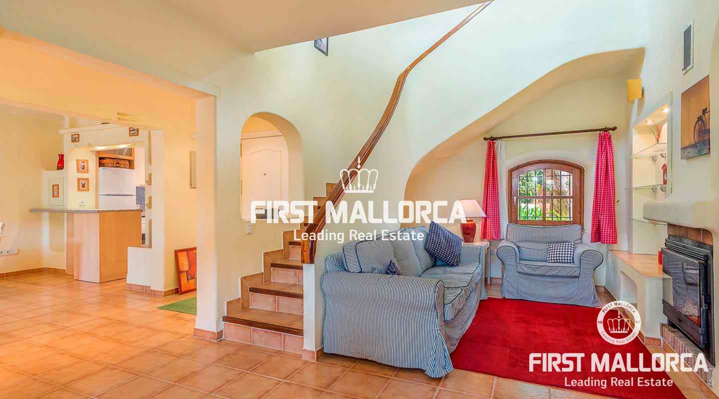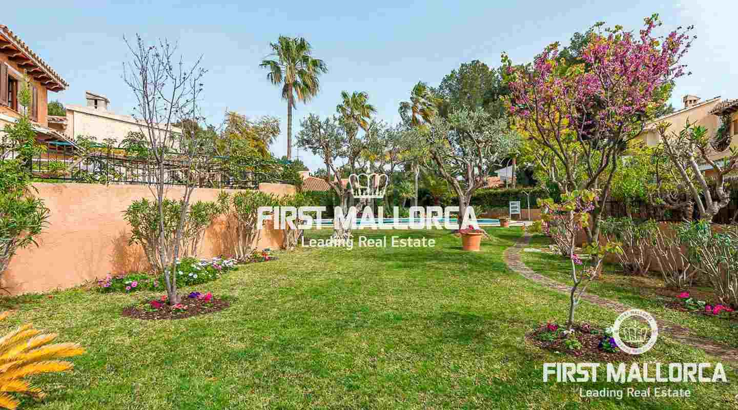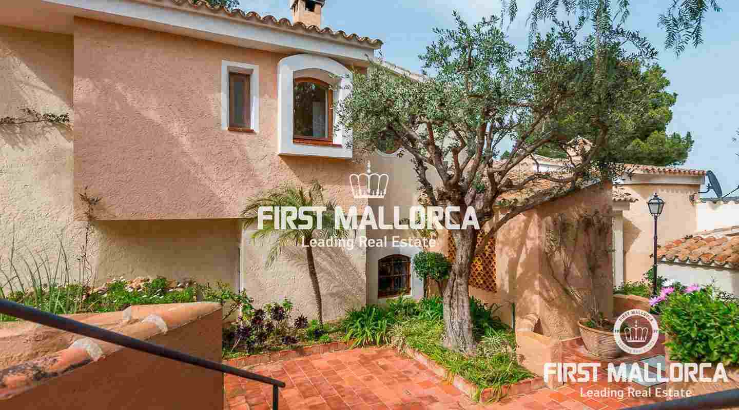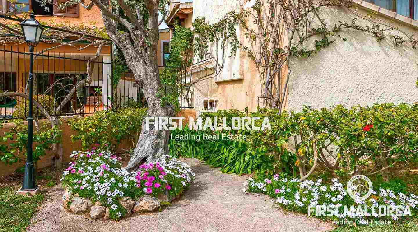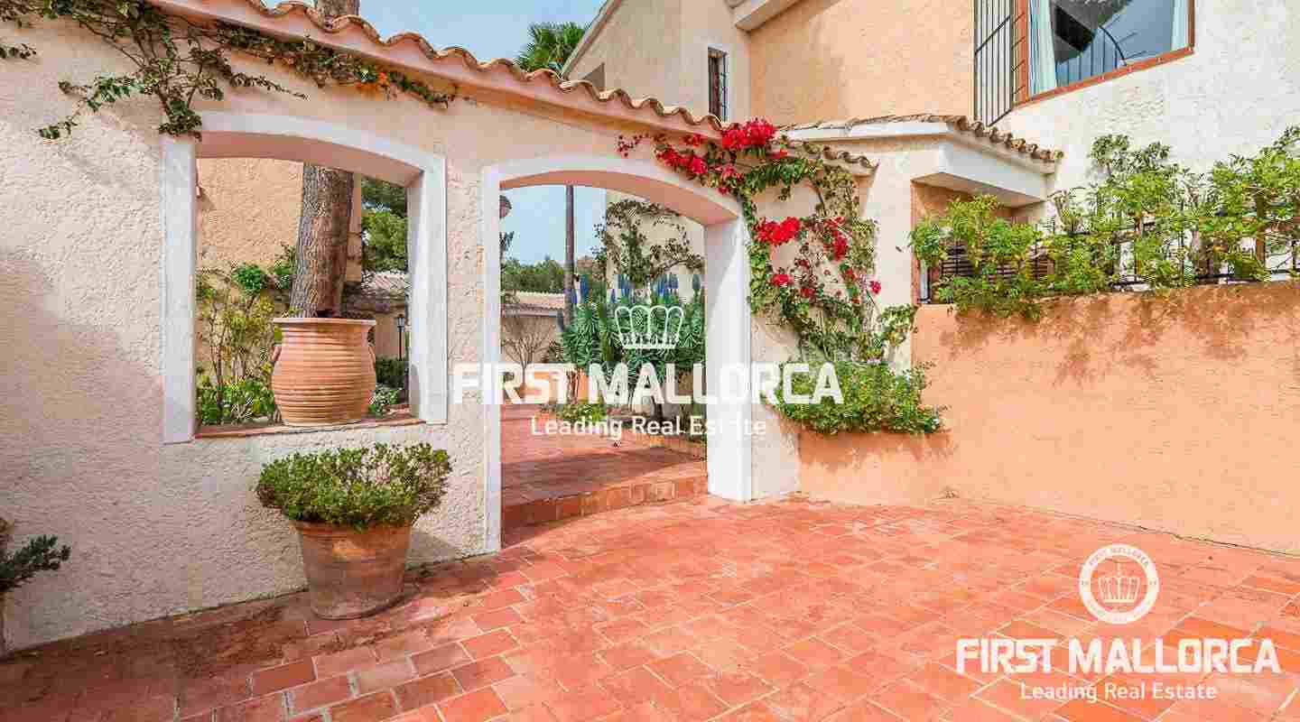 Denna villa i lantlig stil ligger i en trevlig och lugn gated community i det eftertraktade området Bendinat, bara 3 minuters promenad från Royal Golf Course. Den attraktiva fastigheten på Mallorca har en privat terrasserad trädgård, perfekt att dröja kvar och njuta av det fantastiska medelhavsvädret.