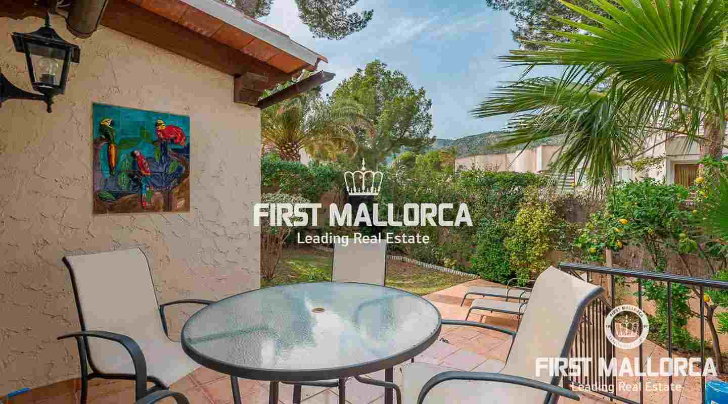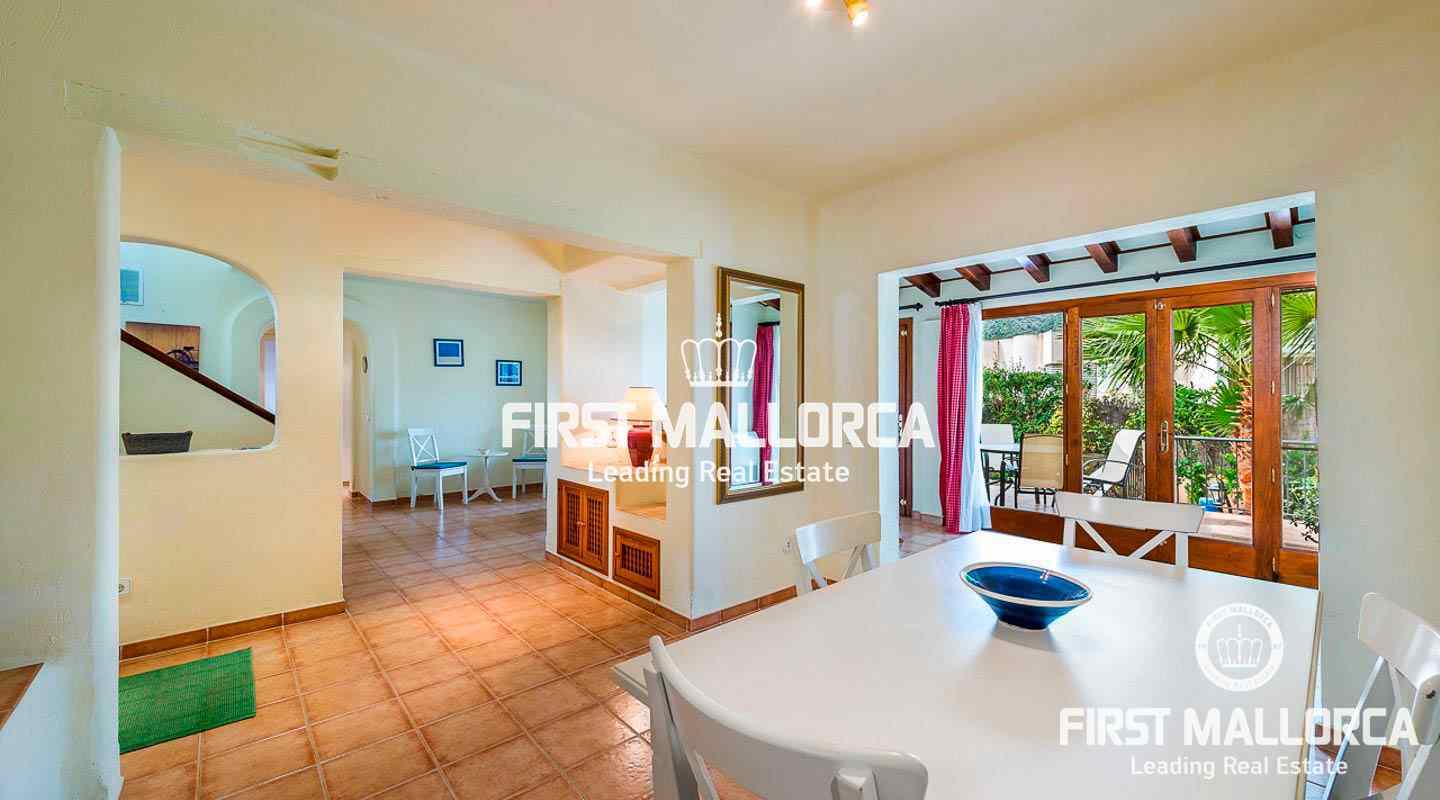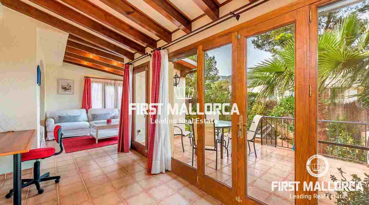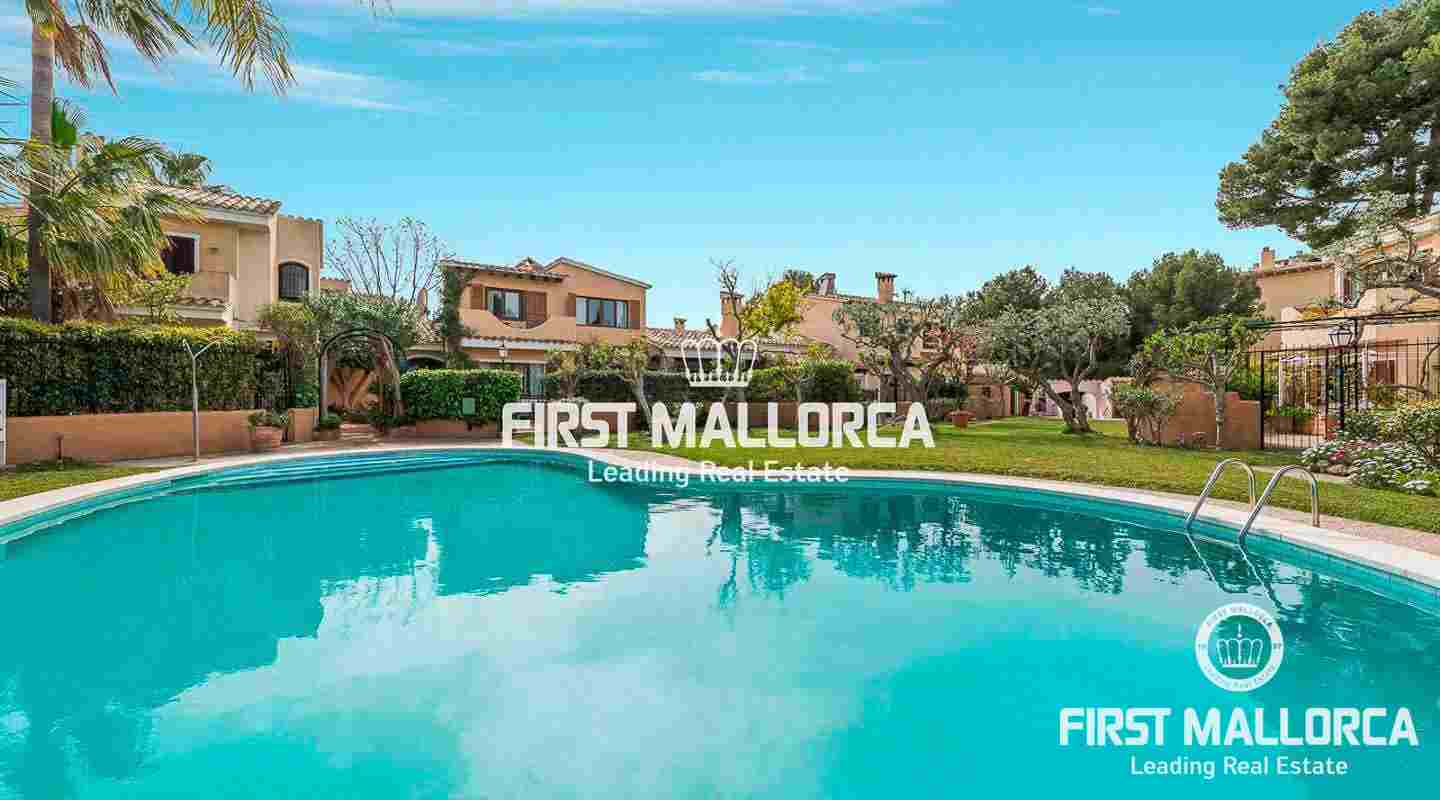 Denna villa i lantlig stil ligger i en trevlig och lugn gated community i det eftertraktade området Bendinat, bara 3 minuters promenad från Royal Golf Course. Den attraktiva fastigheten på Mallorca har en privat terrasserad trädgård, perfekt att dröja kvar och njuta av det fantastiska medelhavsvädret.