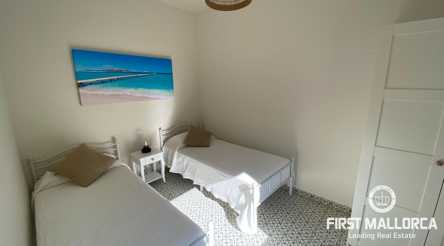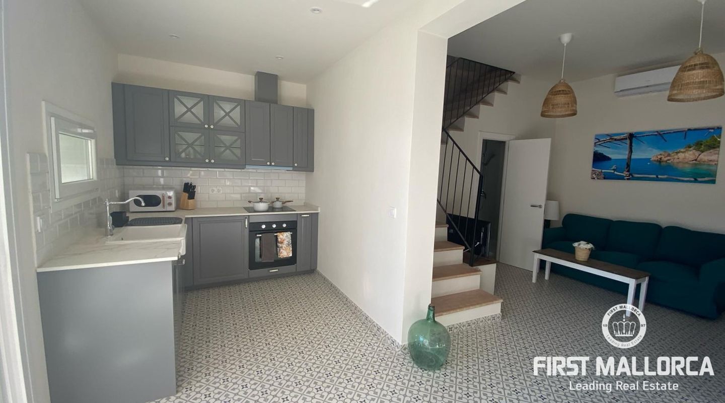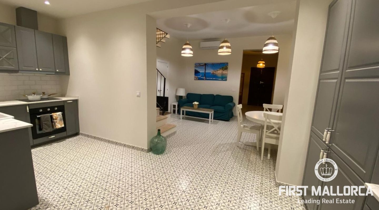Med 129 m² bostadsyta fördelat på två våningar, erbjuder hemmet ljusa, rymliga interiörer och högkvalitativa ytbehandlingar överallt. På bottenvåningen finns ett välkomnande vardagsrum med matplats och kök i öppen planlösning, ett sovrum, ett komplett badrum och direkt tillgång till en charmig veranda och en solig terrass med en privat pool - perfekt för att njuta av Mallorcas utomhusliv.