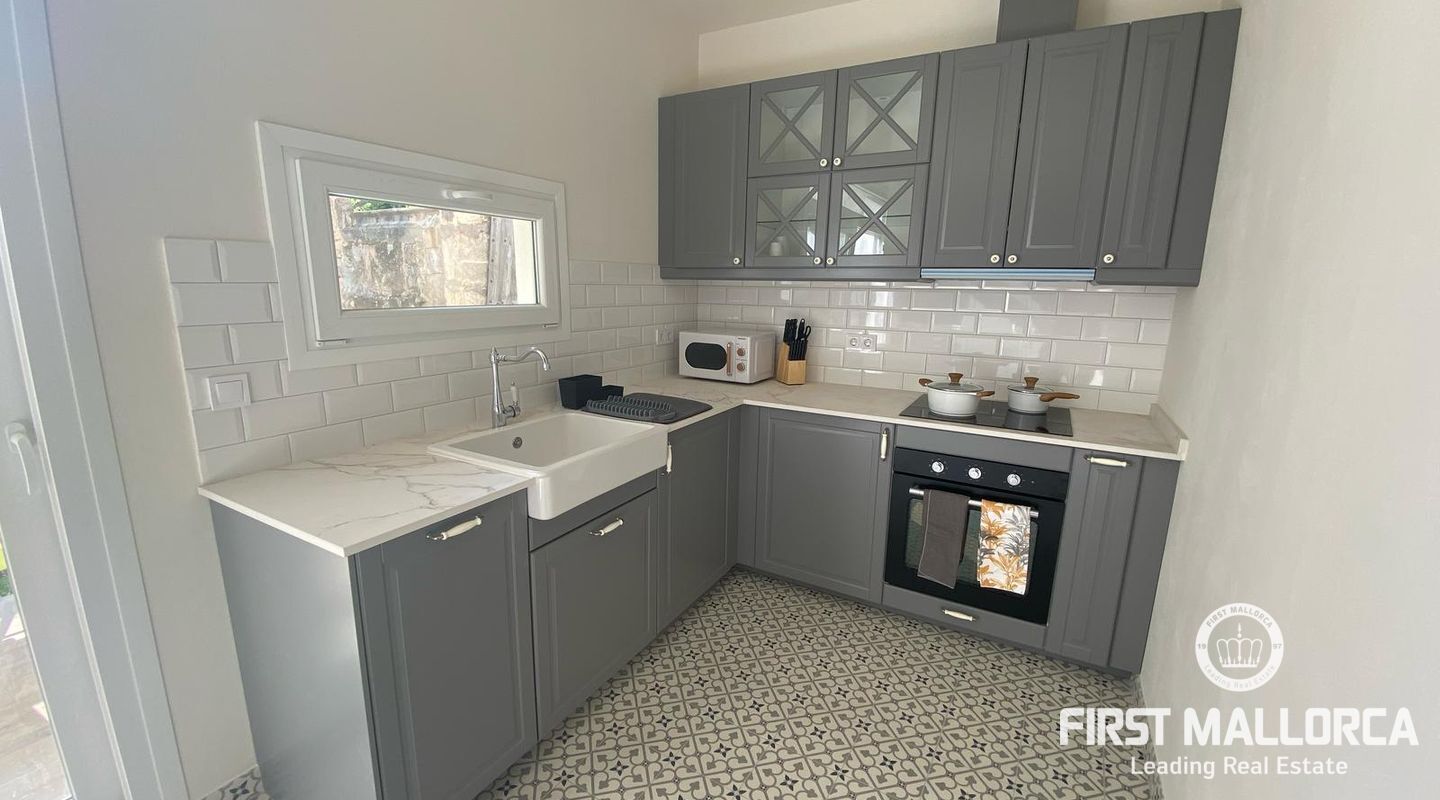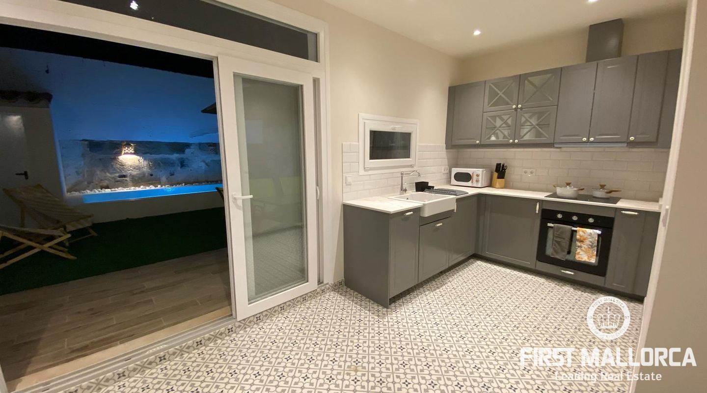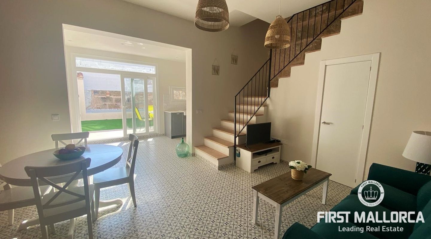 Med 129 m² bostadsyta fördelat på två våningar, erbjuder hemmet ljusa, rymliga interiörer och högkvalitativa ytbehandlingar överallt. På bottenvåningen finns ett välkomnande vardagsrum med matplats och kök i öppen planlösning, ett sovrum, ett komplett badrum och direkt tillgång till en charmig veranda och en solig terrass med en privat pool - perfekt för att njuta av Mallorcas utomhusliv.