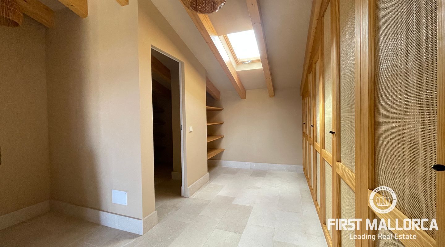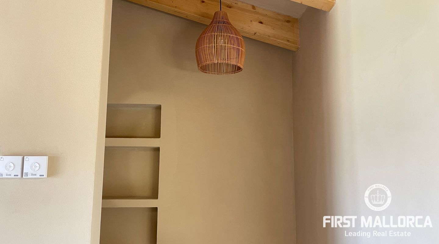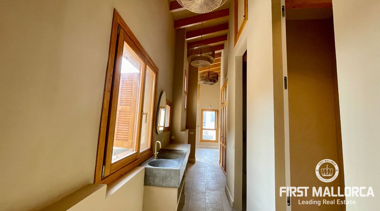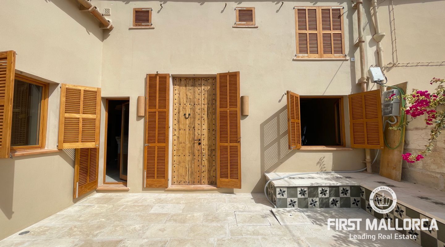Imponerande radhus, helt renoverat i den gamla staden Muro. Huset ligger på en tomt på 480 m2 och består av 228 m2 fördelat på två våningar. Som framgår av 3D-renderingarna erbjuder huset en spektakulär utsikt över Tramuntanabergen och byn. Renoveringsprojektet är inriktat på att följa filosofin för passiva hus med fokus på energihushållbarhet tack vare användningen av aerotermisk energi samt ekologiska och hållbara material. På bottenvåningen finns ett dubbelrum med omklädningsrum, eget badrum och direkt tillgång till poolområdet. Det finns också en gästtoalett, ett stort vardagsrum/matsal och ett fullt utrustat kök med topputrustning. På första våningen finns de andra två dubbelrummen, med omklädningsrum och eget badrum. Byn Muro ligger 12 minuters bilresa från den närmaste stranden i Can Picafort.