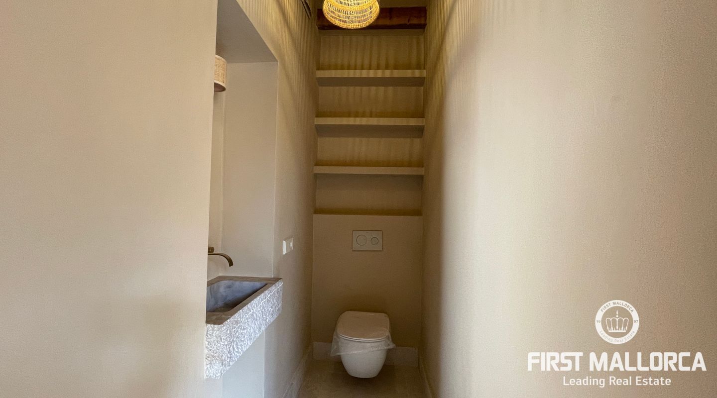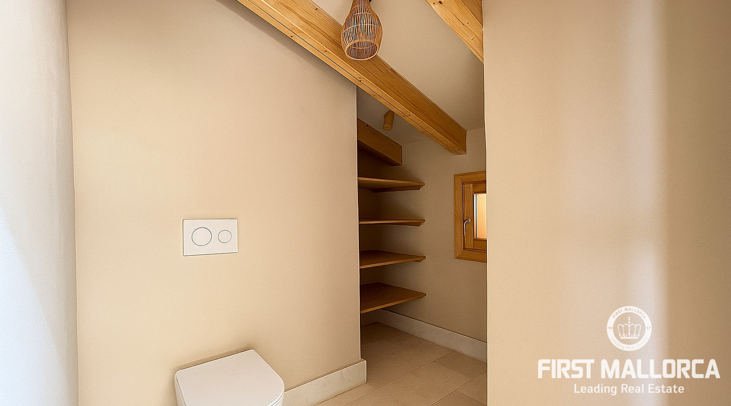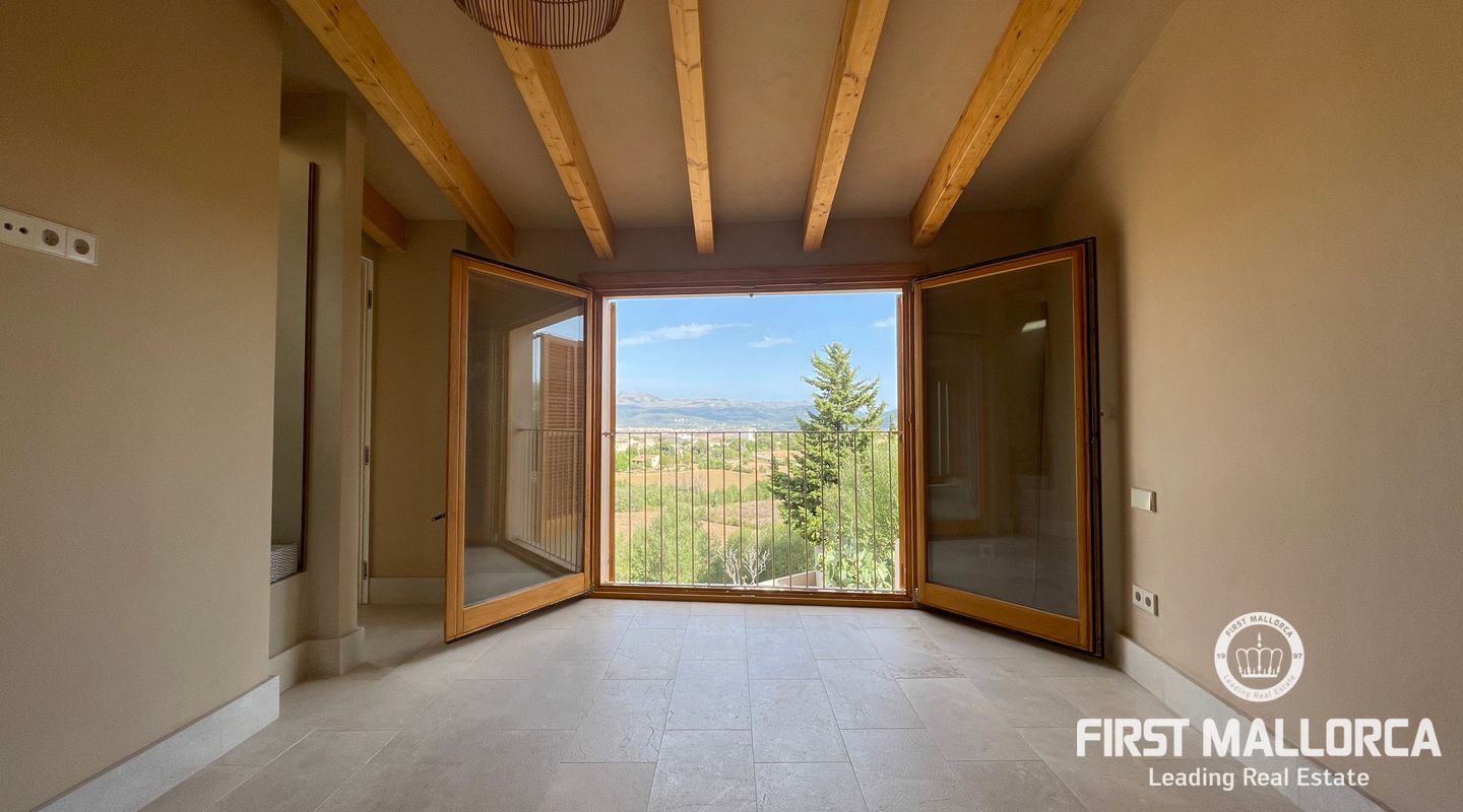 Imponerande radhus, helt renoverat i den gamla staden Muro. Huset ligger på en tomt på 480 m2 och består av 228 m2 fördelat på två våningar. Som framgår av 3D-renderingarna erbjuder huset en spektakulär utsikt över Tramuntanabergen och byn. Renoveringsprojektet är inriktat på att följa filosofin för passiva hus med fokus på energihushållbarhet tack vare användningen av aerotermisk energi samt ekologiska och hållbara material. På bottenvåningen finns ett dubbelrum med omklädningsrum, eget badrum och direkt tillgång till poolområdet. Det finns också en gästtoalett, ett stort vardagsrum/matsal och ett fullt utrustat kök med topputrustning. På första våningen finns de andra två dubbelrummen, med omklädningsrum och eget badrum. Byn Muro ligger 12 minuters bilresa från den närmaste stranden i Can Picafort.