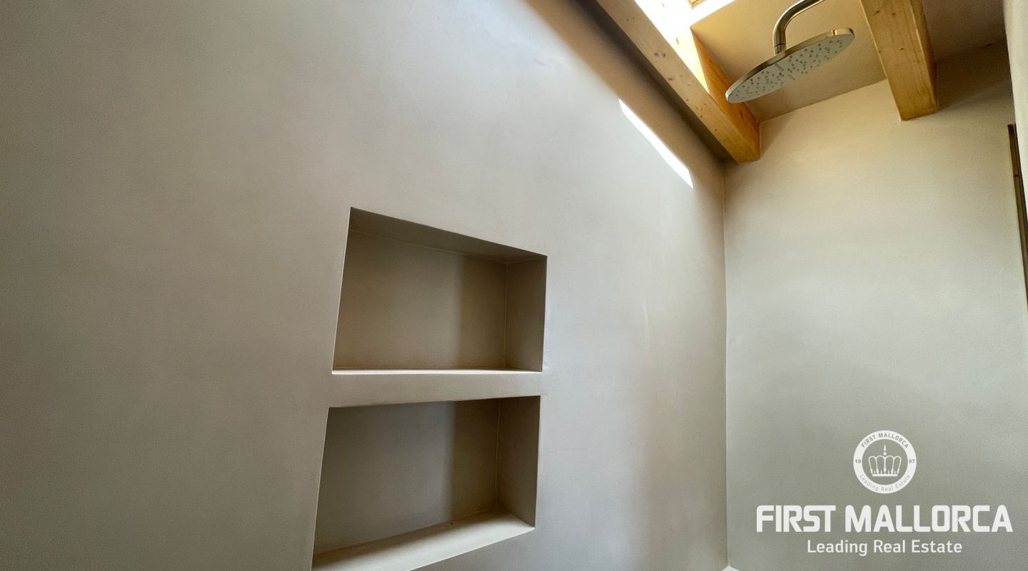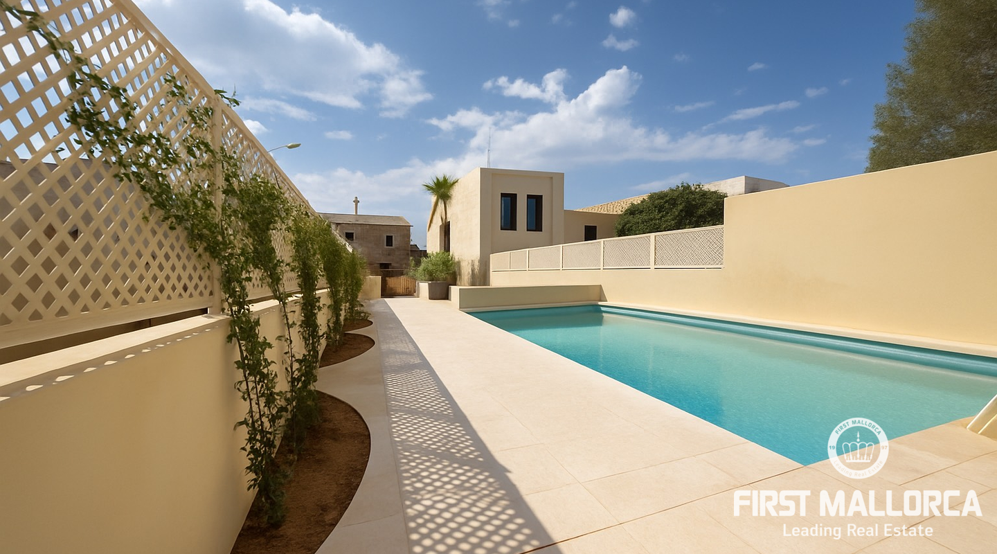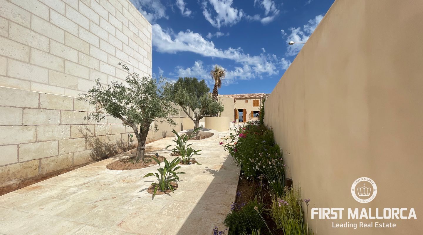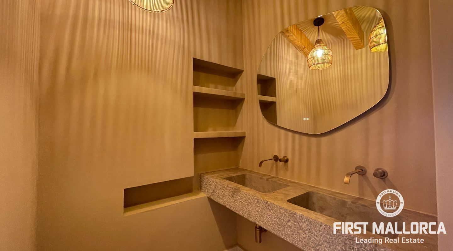 Imponerande radhus, helt renoverat i den gamla staden Muro. Huset ligger på en tomt på 480 m2 och består av 228 m2 fördelat på två våningar. Som framgår av 3D-renderingarna erbjuder huset en spektakulär utsikt över Tramuntanabergen och byn. Renoveringsprojektet är inriktat på att följa filosofin för passiva hus med fokus på energihushållbarhet tack vare användningen av aerotermisk energi samt ekologiska och hållbara material. På bottenvåningen finns ett dubbelrum med omklädningsrum, eget badrum och direkt tillgång till poolområdet. Det finns också en gästtoalett, ett stort vardagsrum/matsal och ett fullt utrustat kök med topputrustning. På första våningen finns de andra två dubbelrummen, med omklädningsrum och eget badrum. Byn Muro ligger 12 minuters bilresa från den närmaste stranden i Can Picafort.
