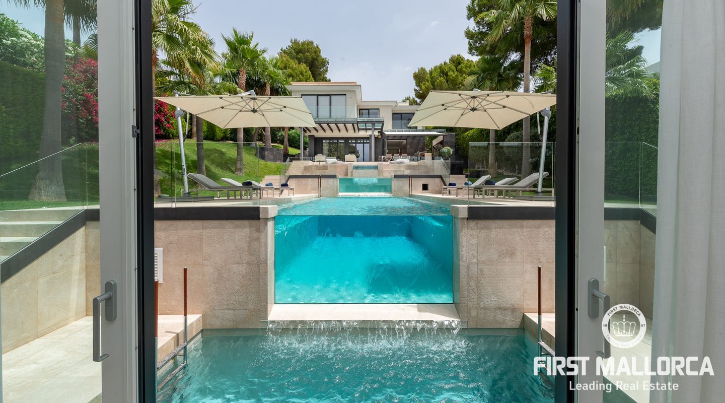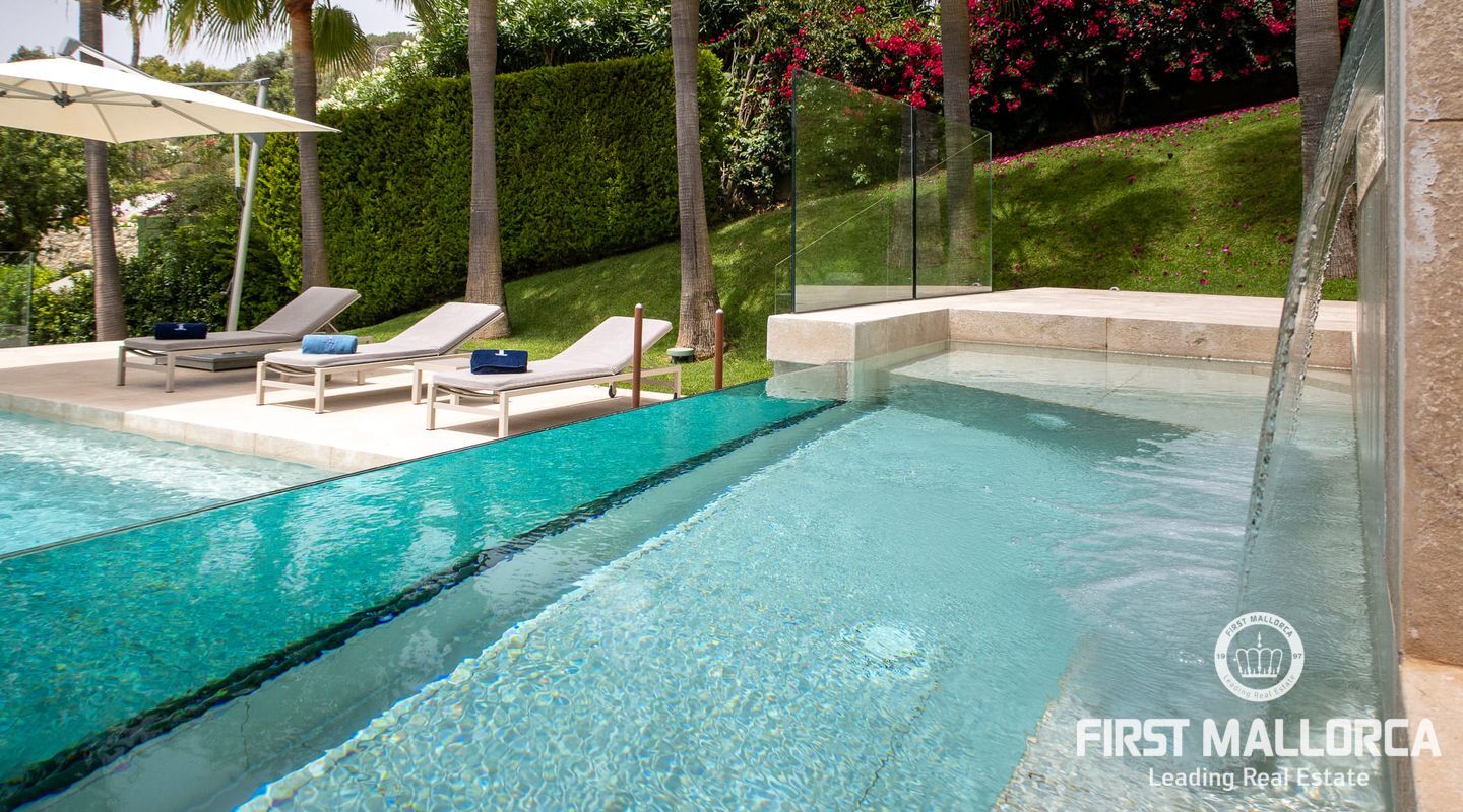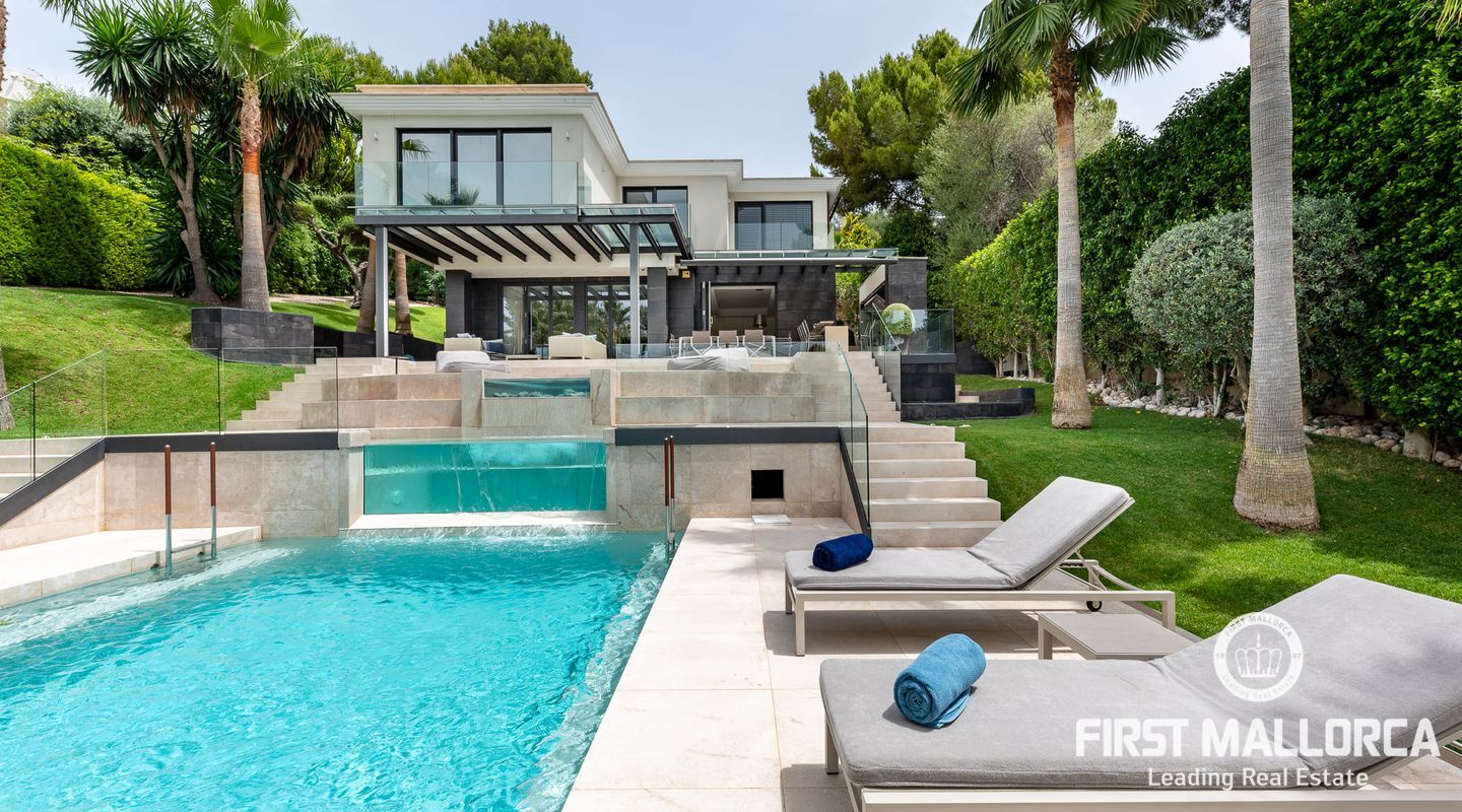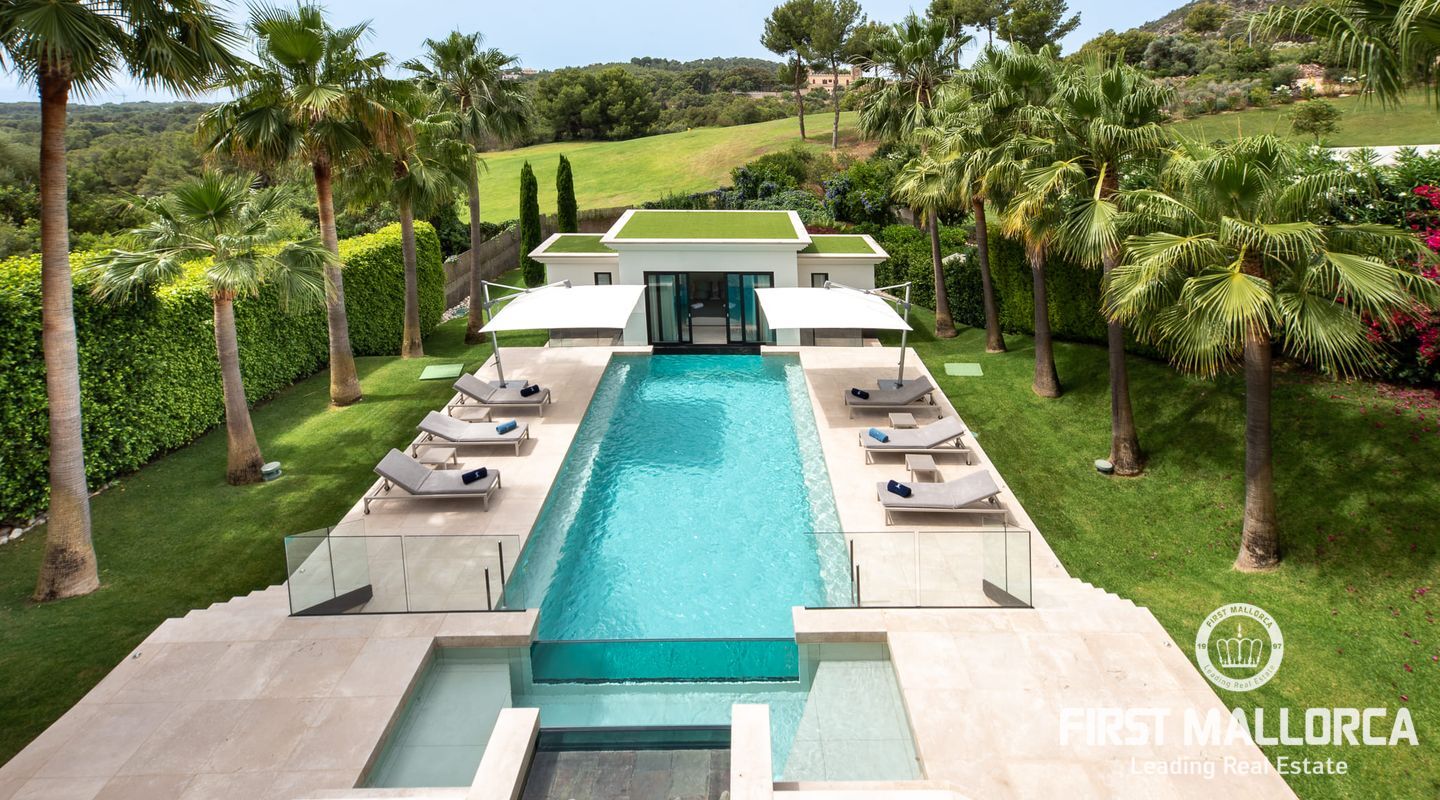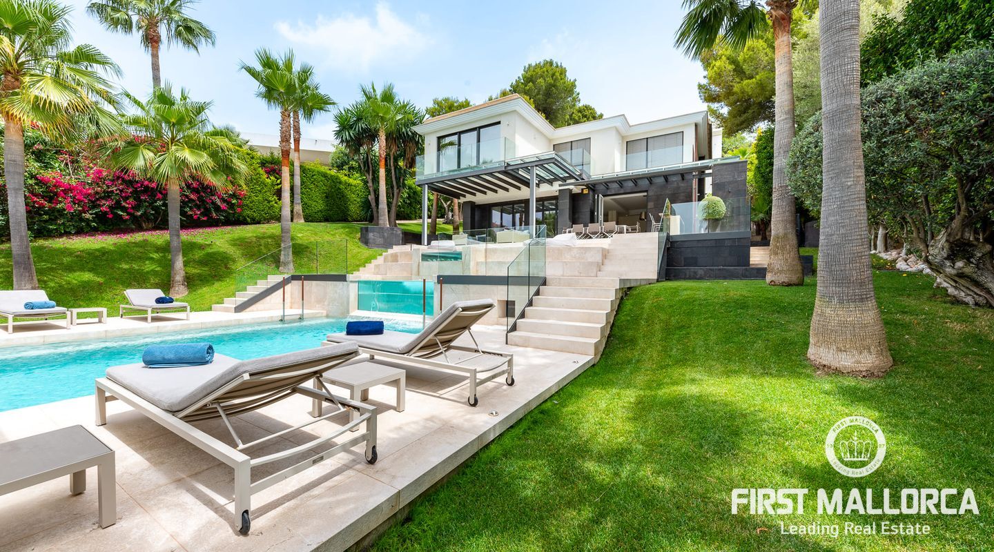 Vacker lyxvilla i eftertraktat Bendinat-läge byggd till mycket hög standard med den mest fantastiska poolen du någonsin har sett! Denna sydvästläge villa har sensationell panoramautsikt över Bendinat golf och över till havet. Villan har fullständig integritet med vackra trädgårdar, palmer och gräsmatta trädgårdsområden och ligger bara en kort bilresa till den enastående marinan i Portals Nous.