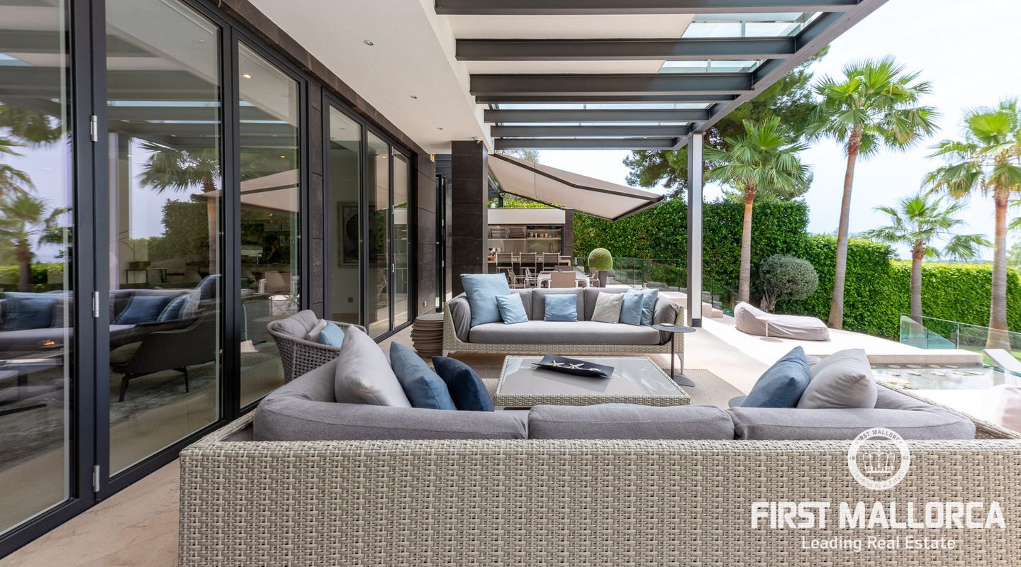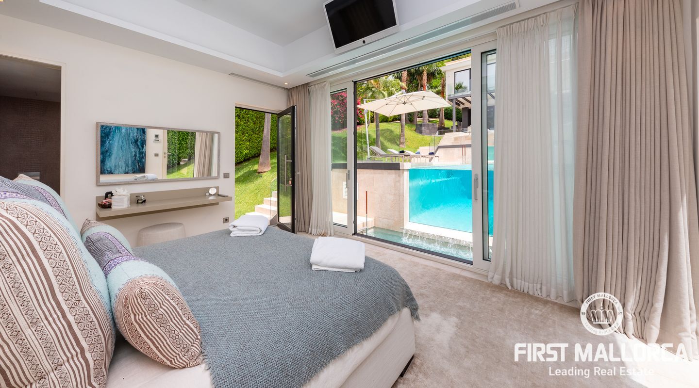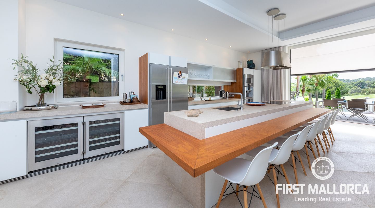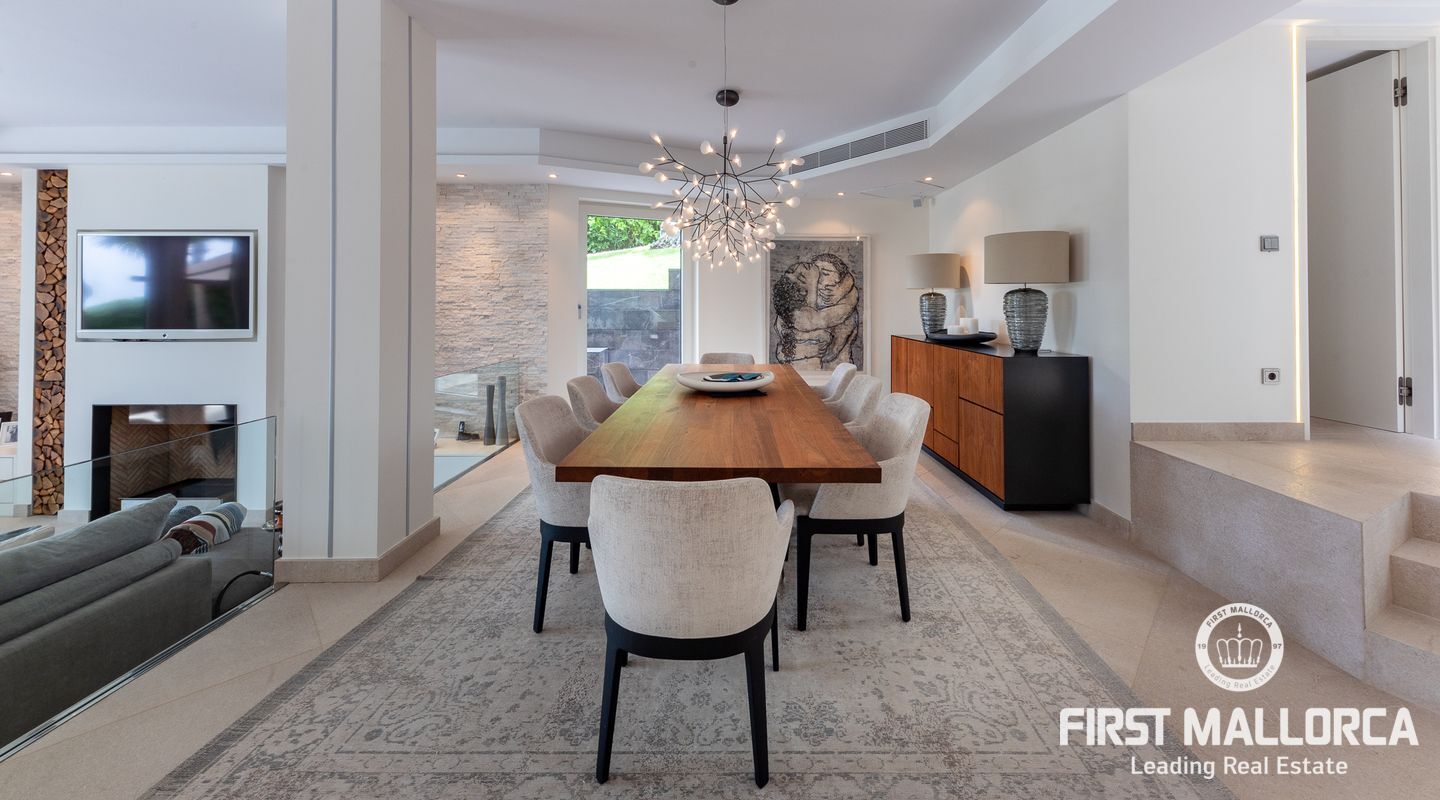 Vacker lyxvilla i eftertraktat Bendinat-läge byggd till mycket hög standard med den mest fantastiska poolen du någonsin har sett! Denna sydvästläge villa har sensationell panoramautsikt över Bendinat golf och över till havet. Villan har fullständig integritet med vackra trädgårdar, palmer och gräsmatta trädgårdsområden och ligger bara en kort bilresa till den enastående marinan i Portals Nous.