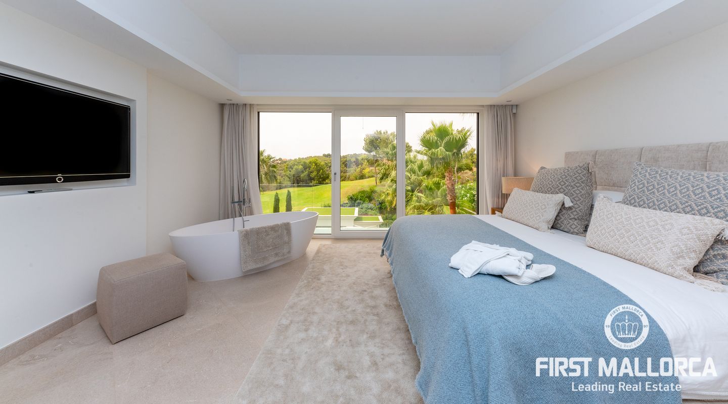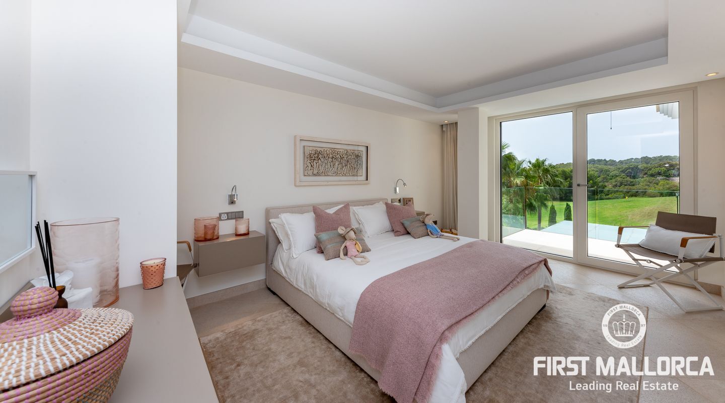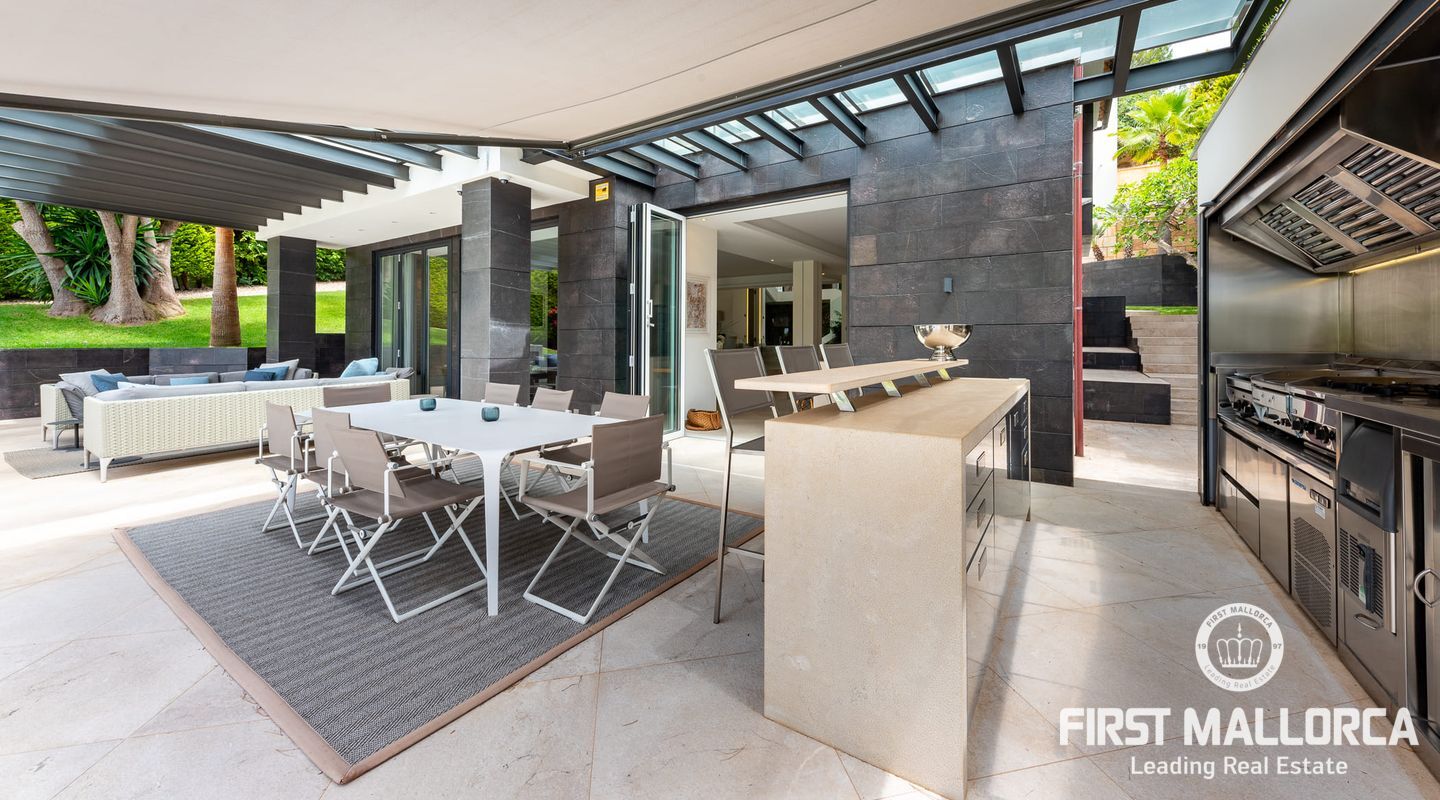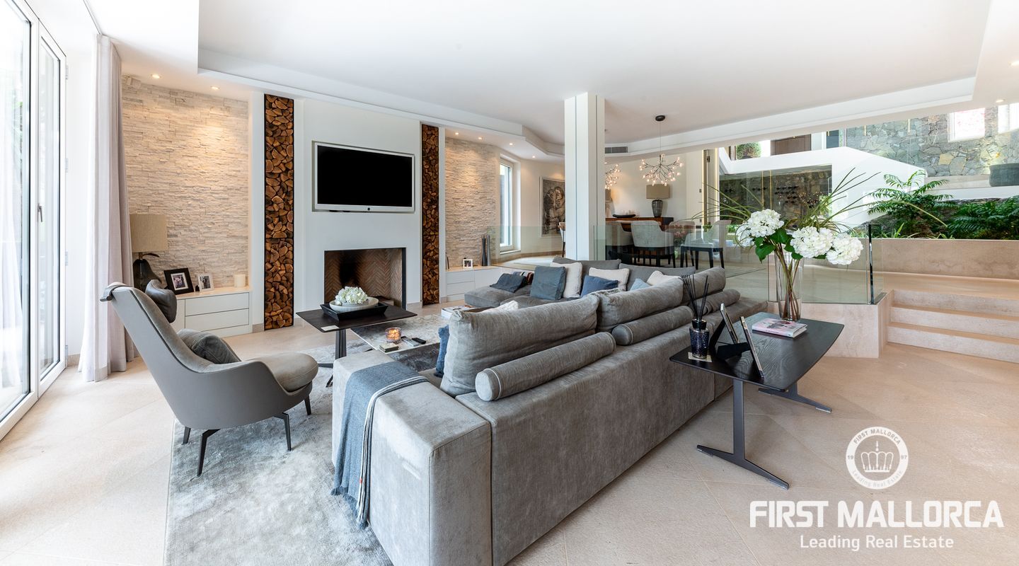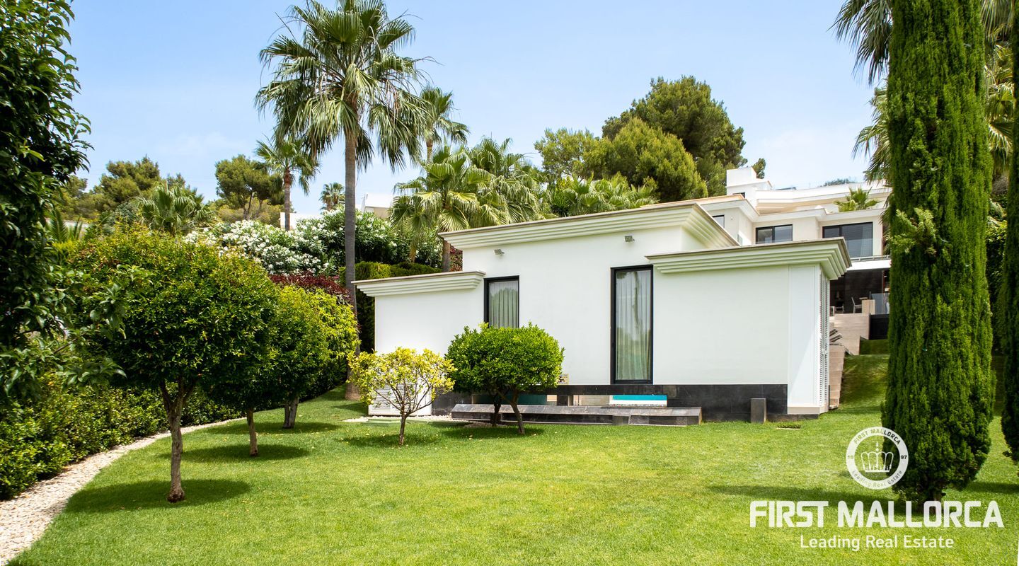 Vacker lyxvilla i eftertraktat Bendinat-läge byggd till mycket hög standard med den mest fantastiska poolen du någonsin har sett! Denna sydvästläge villa har sensationell panoramautsikt över Bendinat golf och över till havet. Villan har fullständig integritet med vackra trädgårdar, palmer och gräsmatta trädgårdsområden och ligger bara en kort bilresa till den enastående marinan i Portals Nous.