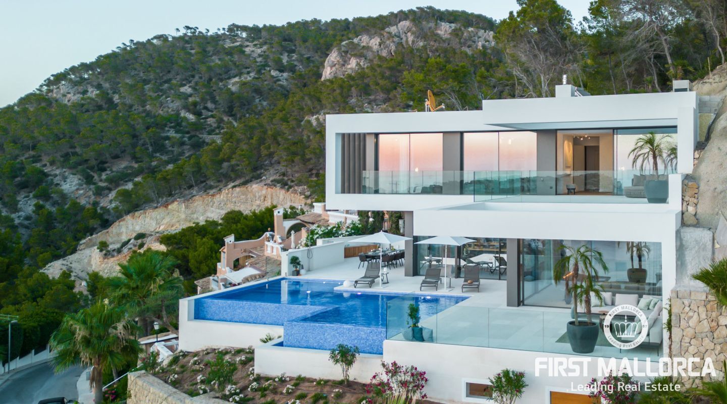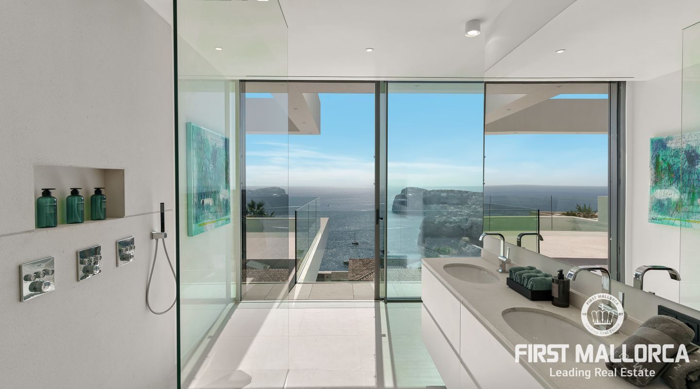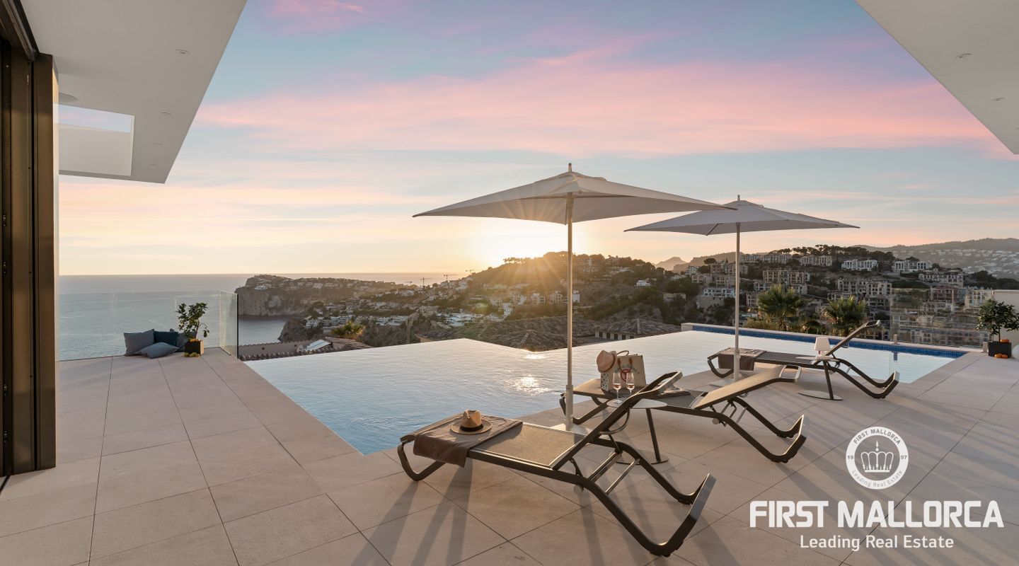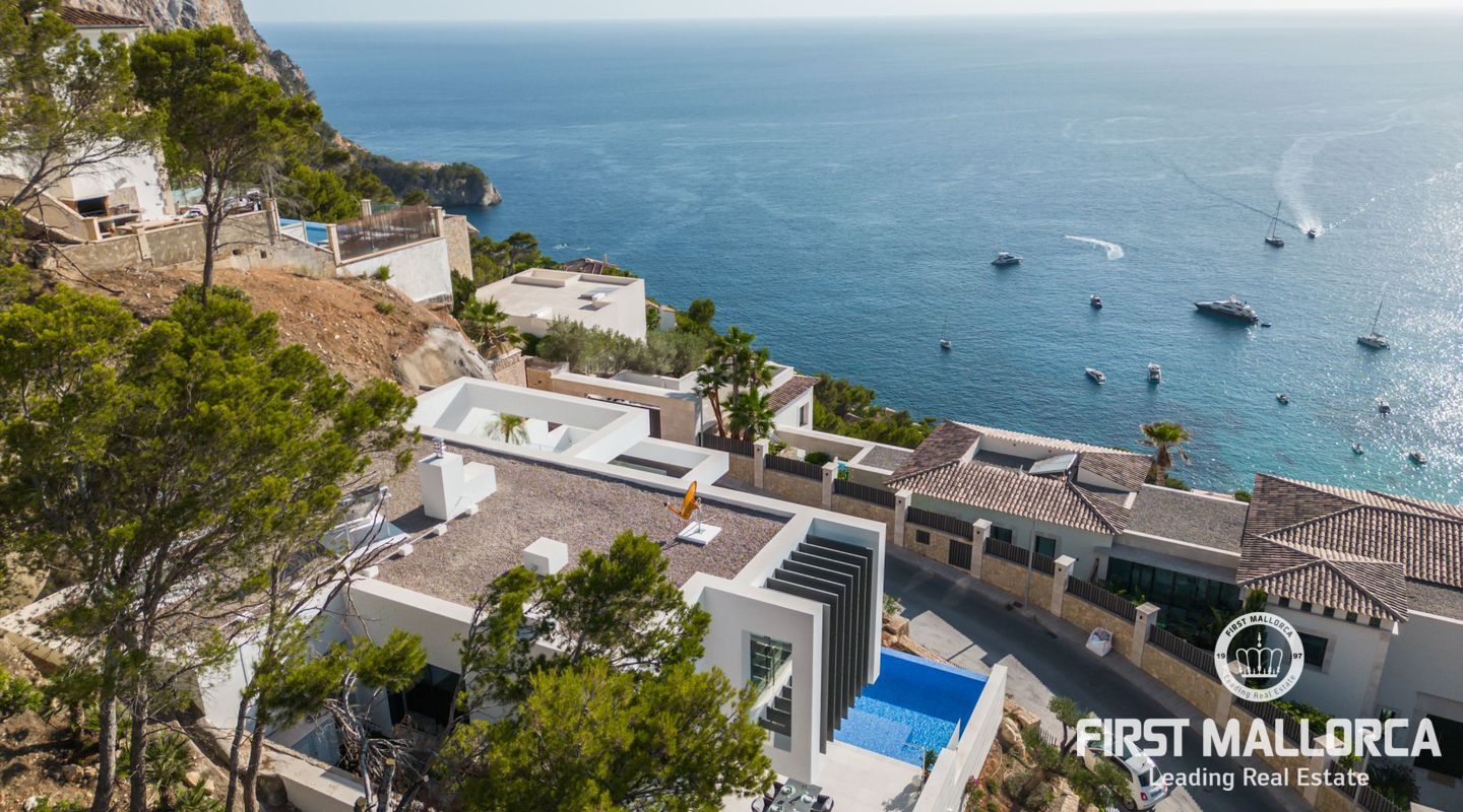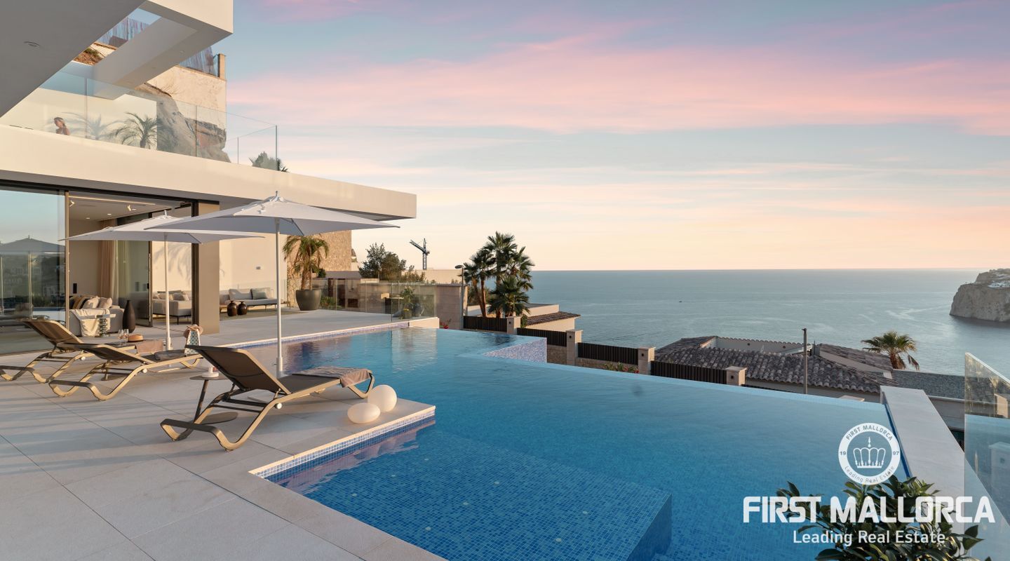 Denna moderna, fullt möblerade villa ligger i en av de vackraste vikarna i Puerto Andratx, Cala Llamp. Förutom bearbetningen av de finaste materialen är den absoluta höjdpunkten den spektakulära havsutsikten med solnedgångsgaranti. Fastigheten erbjuder en imponerande uppfart med vändskiva för din bil, en entréhall med central trappa och hiss till alla våningar. Upp till sex generösa sovrum med eget badrum och inbyggda garderober finns tillgängliga för ägaren och hans gäster. Vardagsrummet / matsalen med rymligt ultramodernt kök och de senaste Gaggenau-elektriska apparaterna, ansluter sömlöst till det stora terrassområdet med infinitypool och fri havsutsikt. Naturstengolv i stort format på terrasserna och i vardagsrummet, samt parkettgolv i sovrummen understryker den eleganta karaktären hos denna fantastiska villa. Funktionerna inkluderar: Underjordisk parkering för upp till 6 bilar, lyxiga badrum med inredning av Dornbracht och Hansgrohe, hemautomation, golvvärme, individuellt styrd luftkonditionering, vattenmjuknings- och reningssystem, en gasväggspis och en helt planterad och upplyst trädgård med automatiskt bevattningssystem. Kontakta oss gärna när som helst för mer information.