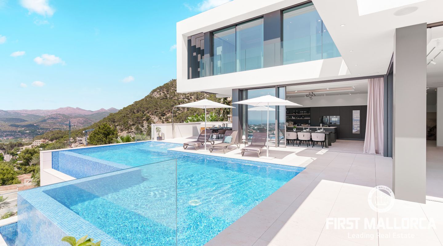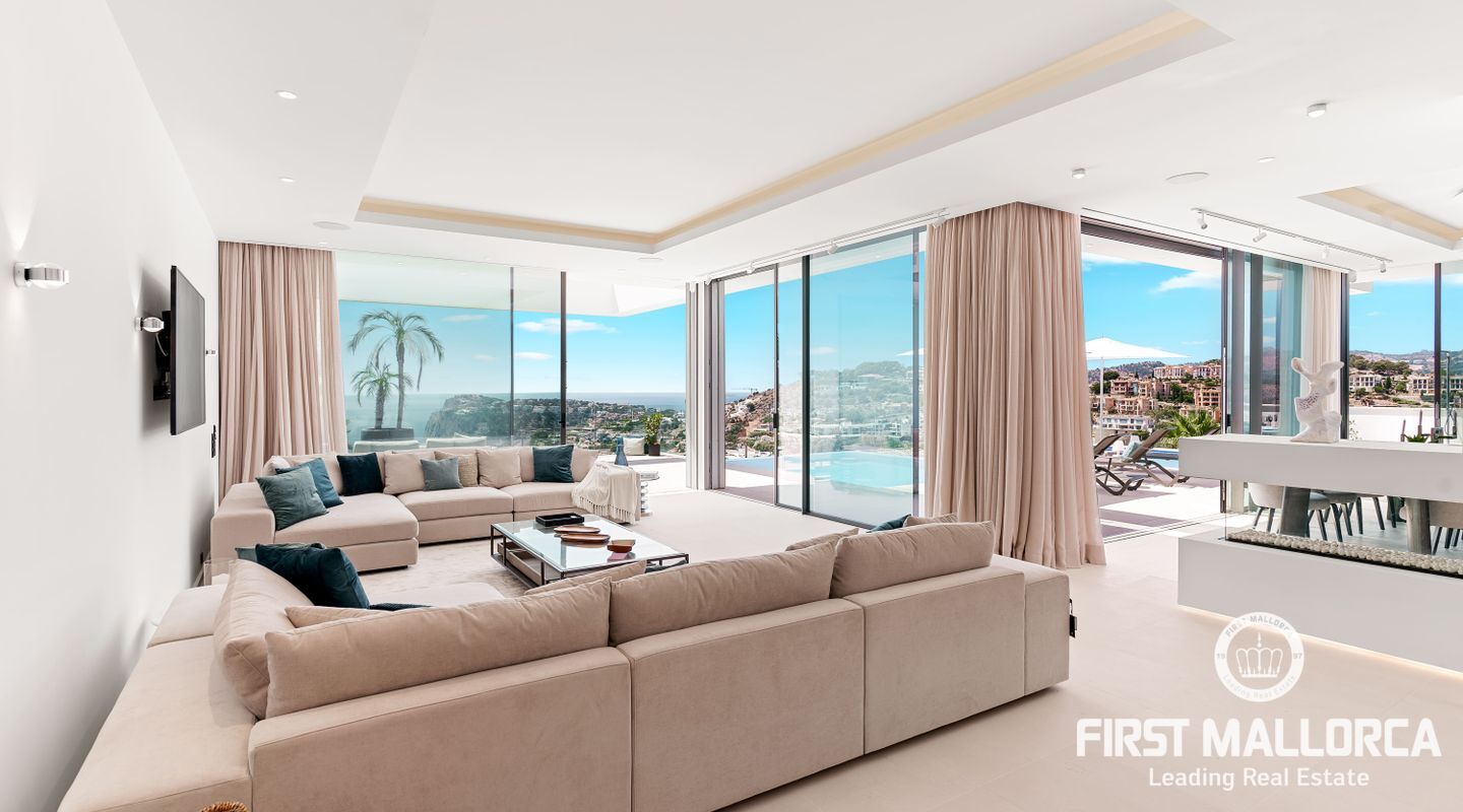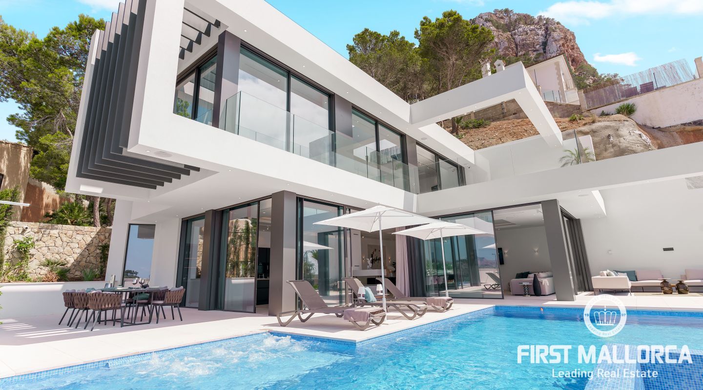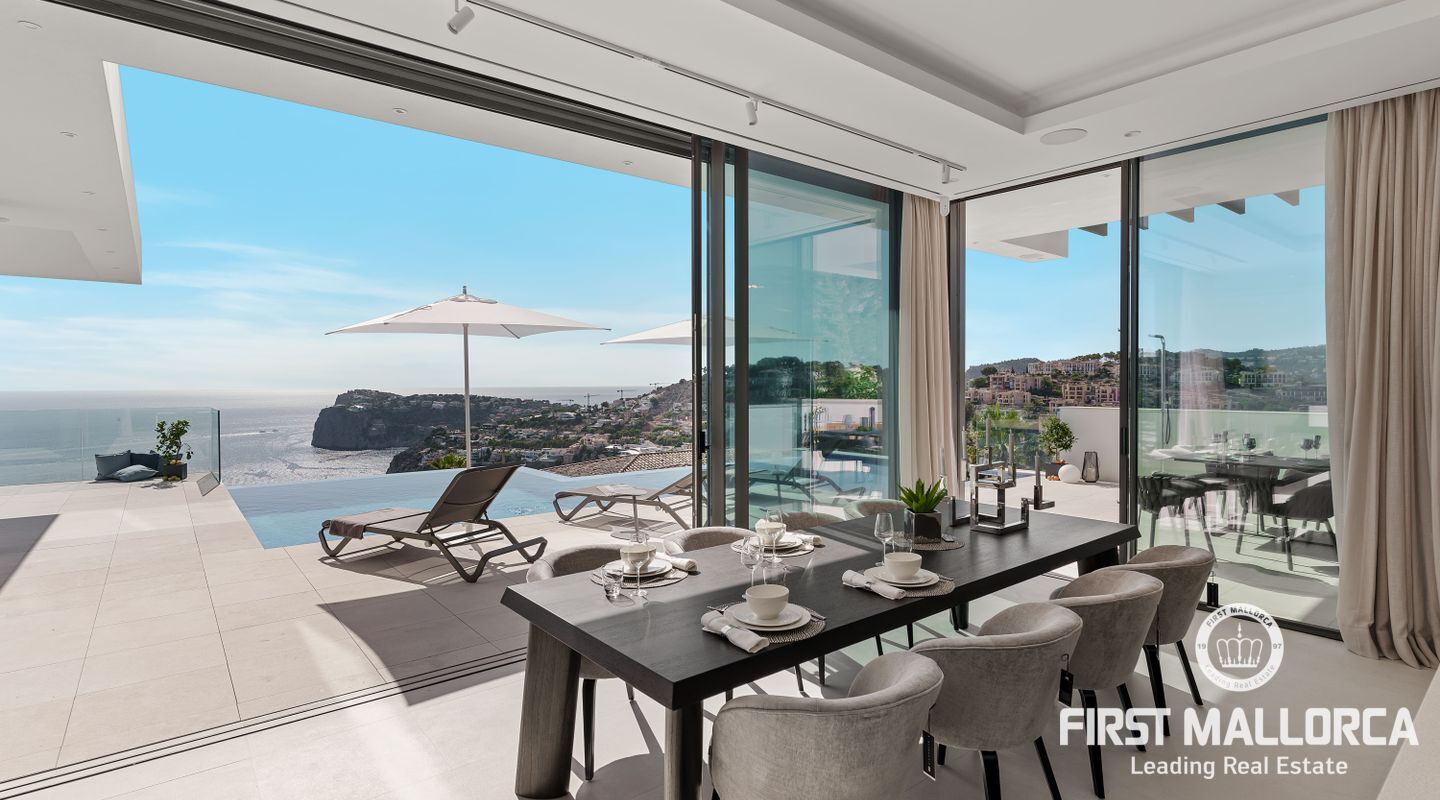 Denna moderna, fullt möblerade villa ligger i en av de vackraste vikarna i Puerto Andratx, Cala Llamp. Förutom bearbetningen av de finaste materialen är den absoluta höjdpunkten den spektakulära havsutsikten med solnedgångsgaranti. Fastigheten erbjuder en imponerande uppfart med vändskiva för din bil, en entréhall med central trappa och hiss till alla våningar. Upp till sex generösa sovrum med eget badrum och inbyggda garderober finns tillgängliga för ägaren och hans gäster. Vardagsrummet / matsalen med rymligt ultramodernt kök och de senaste Gaggenau-elektriska apparaterna, ansluter sömlöst till det stora terrassområdet med infinitypool och fri havsutsikt. Naturstengolv i stort format på terrasserna och i vardagsrummet, samt parkettgolv i sovrummen understryker den eleganta karaktären hos denna fantastiska villa. Funktionerna inkluderar: Underjordisk parkering för upp till 6 bilar, lyxiga badrum med inredning av Dornbracht och Hansgrohe, hemautomation, golvvärme, individuellt styrd luftkonditionering, vattenmjuknings- och reningssystem, en gasväggspis och en helt planterad och upplyst trädgård med automatiskt bevattningssystem. Kontakta oss gärna när som helst för mer information.