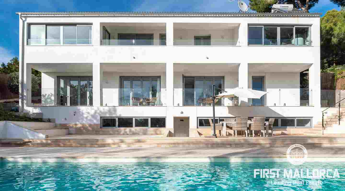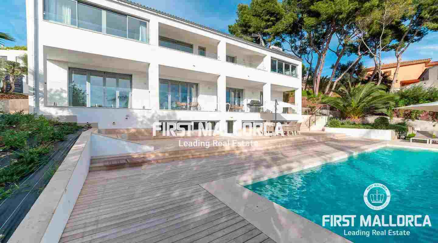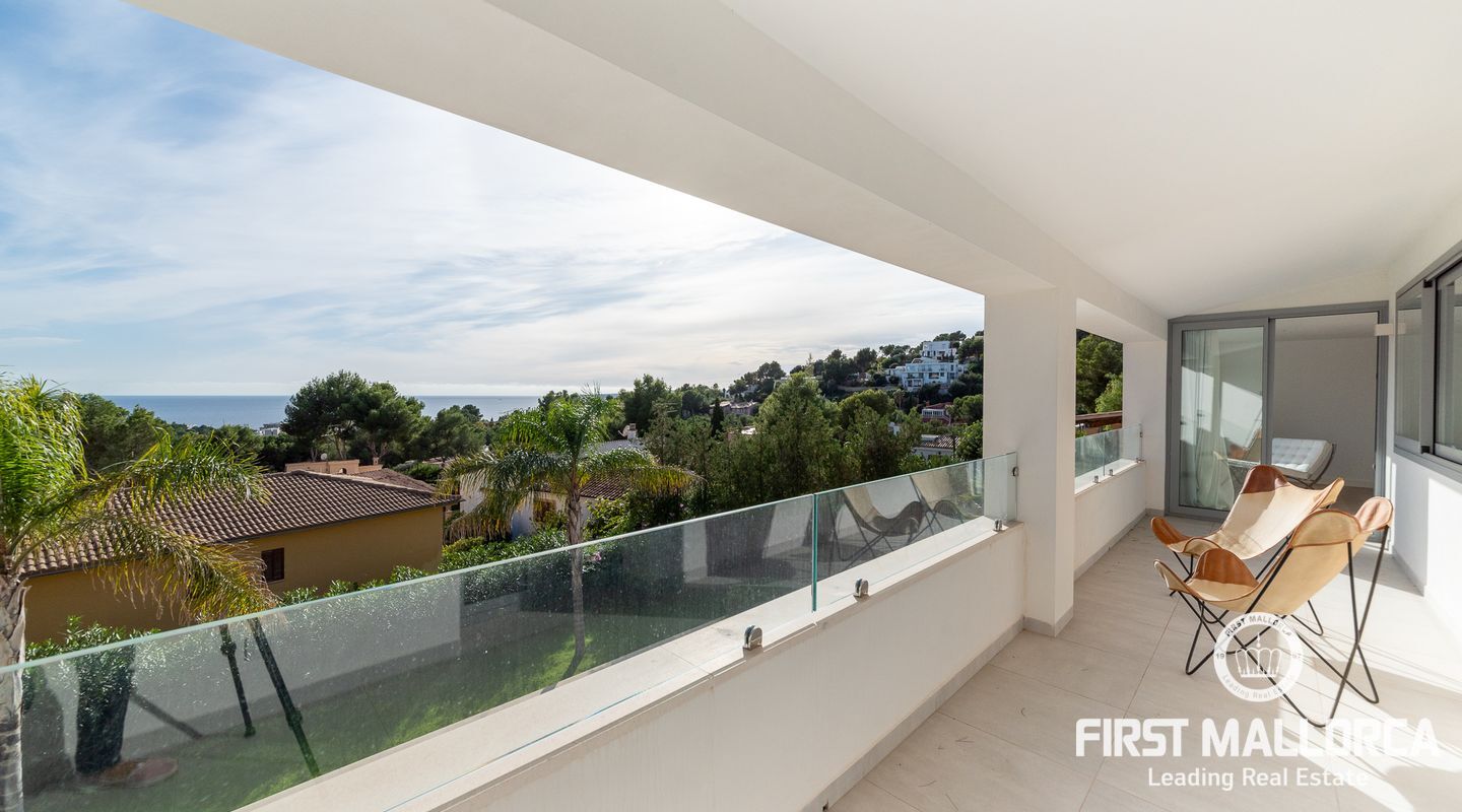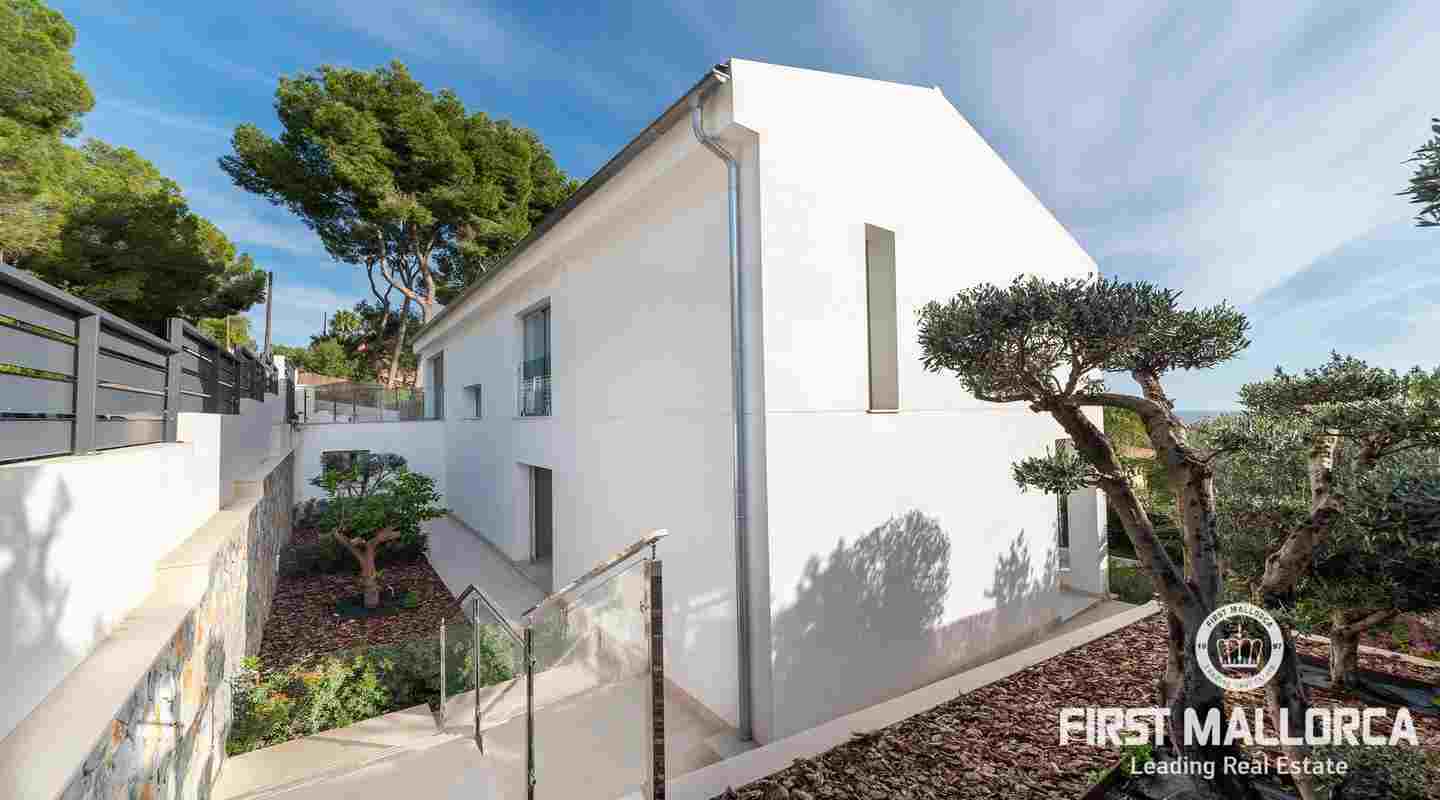 Denna eleganta villa med havsutsikt i Costa d'en Blanes har nyligen moderniserats helt och hållet enligt nya byggnormer och imponerar nu med sin moderna och fräscha design. Fastigheten som vetter mot söder har ett stort, platt utomhusområde med pool och gräsmattor, vilket gör den särskilt lämplig för familjer, men också för alla som älskar utomhuslivet och vill njuta av den mallorcanska solen. På bottenvåningen i den ljusa villan finns det öppna vardagsrummet och matplatsen med ett öppet kök samt ett sovrum och ett badrum. De övriga 3 sovrummen och badrummen ligger på övervåningen och är kopplade till en täckt terrass från vilken du har en underbar utsikt över Medelhavet. Fastigheten har en högkvalitativ interiör och är utrustad med luftkonditionering, centralvärme, vattenfilter, utrustat kök med Neff-apparater och ett garage. Dessutom finns det tillräckligt med förvaringsutrymme i källaren, en vinkällare och ytterligare ett stort rum som skulle kunna användas som till exempel ett gym.