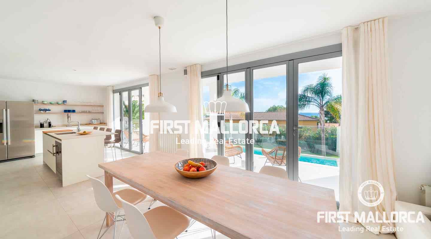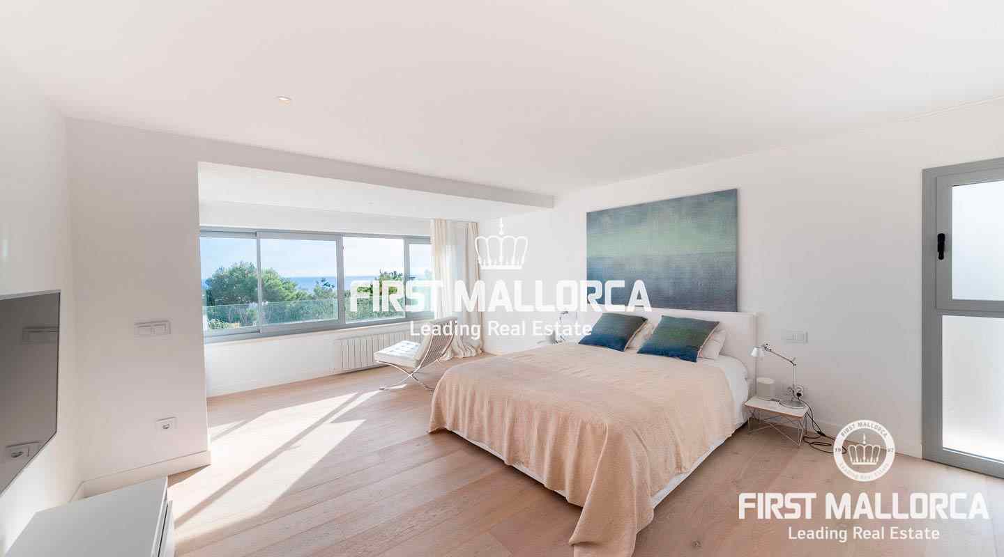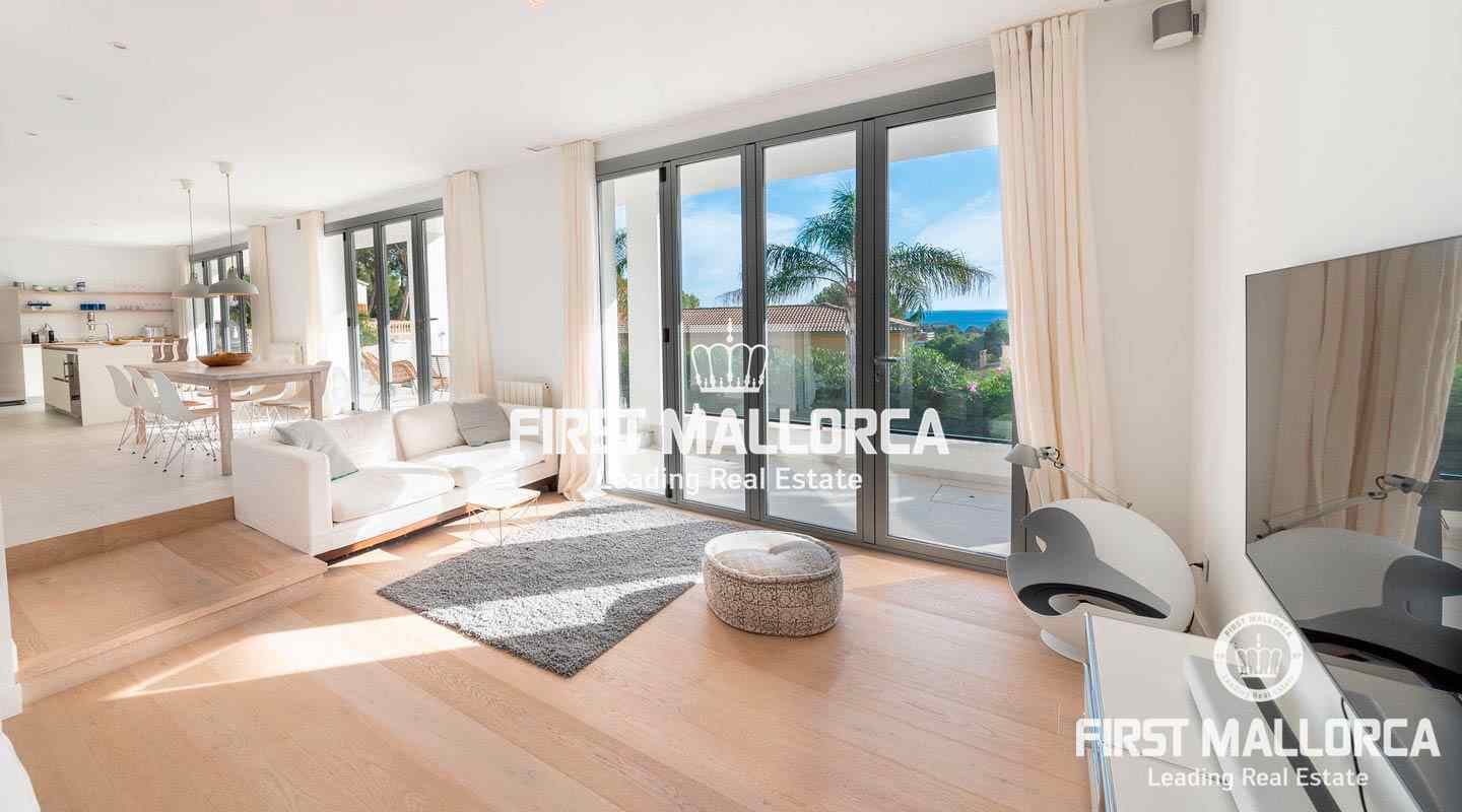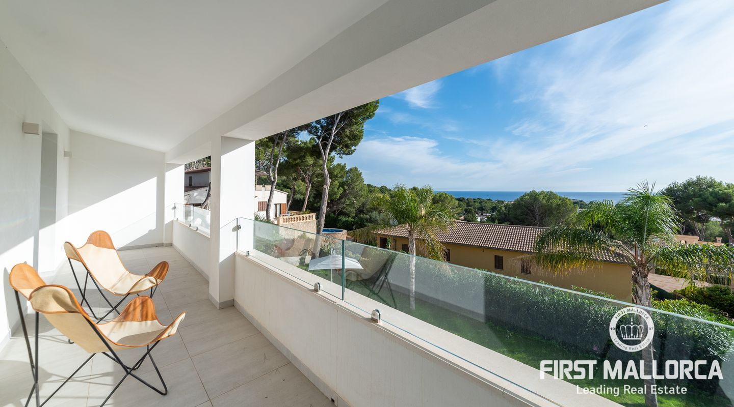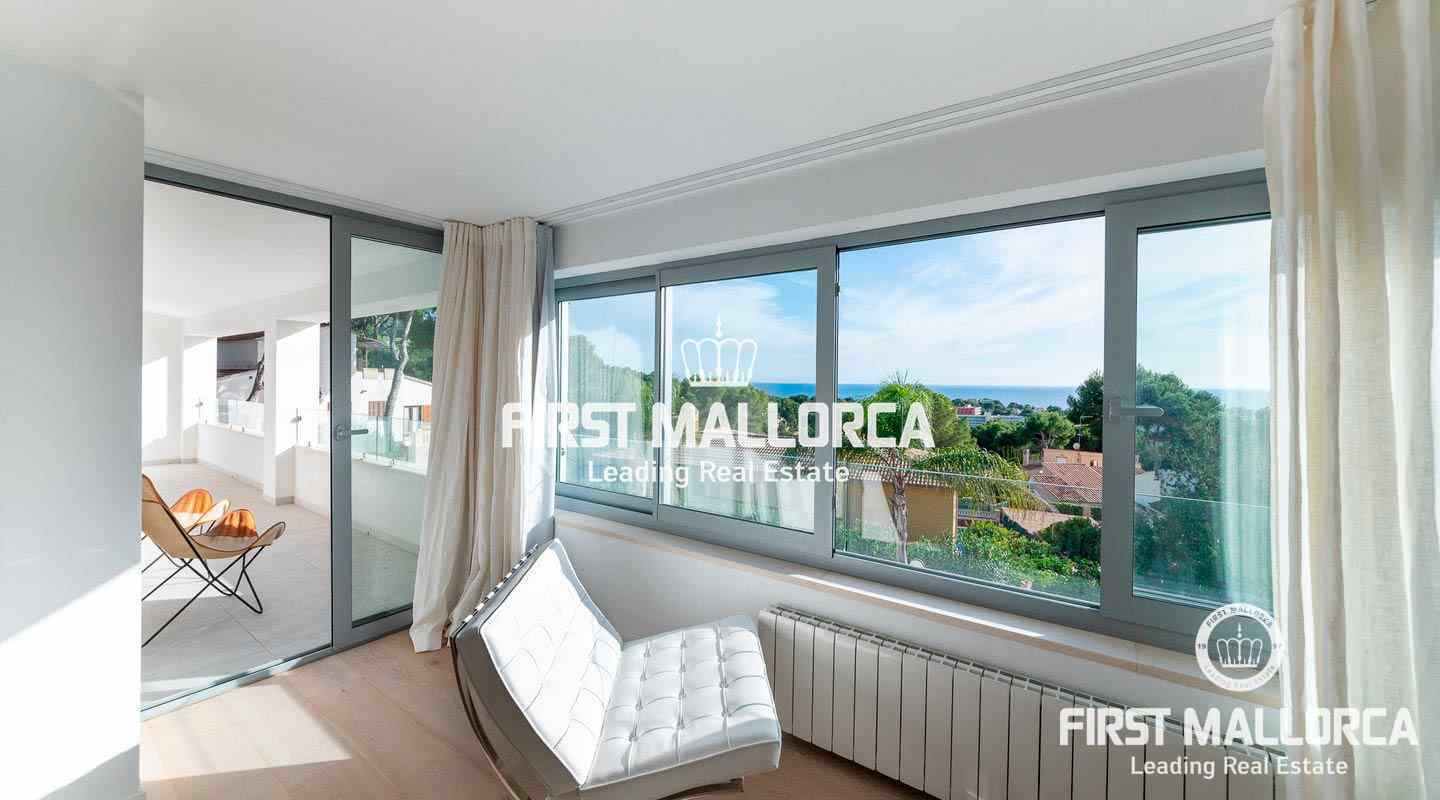 Denna eleganta villa med havsutsikt i Costa d'en Blanes har nyligen moderniserats helt och hållet enligt nya byggnormer och imponerar nu med sin moderna och fräscha design. Fastigheten som vetter mot söder har ett stort, platt utomhusområde med pool och gräsmattor, vilket gör den särskilt lämplig för familjer, men också för alla som älskar utomhuslivet och vill njuta av den mallorcanska solen. På bottenvåningen i den ljusa villan finns det öppna vardagsrummet och matplatsen med ett öppet kök samt ett sovrum och ett badrum. De övriga 3 sovrummen och badrummen ligger på övervåningen och är kopplade till en täckt terrass från vilken du har en underbar utsikt över Medelhavet. Fastigheten har en högkvalitativ interiör och är utrustad med luftkonditionering, centralvärme, vattenfilter, utrustat kök med Neff-apparater och ett garage. Dessutom finns det tillräckligt med förvaringsutrymme i källaren, en vinkällare och ytterligare ett stort rum som skulle kunna användas som till exempel ett gym.