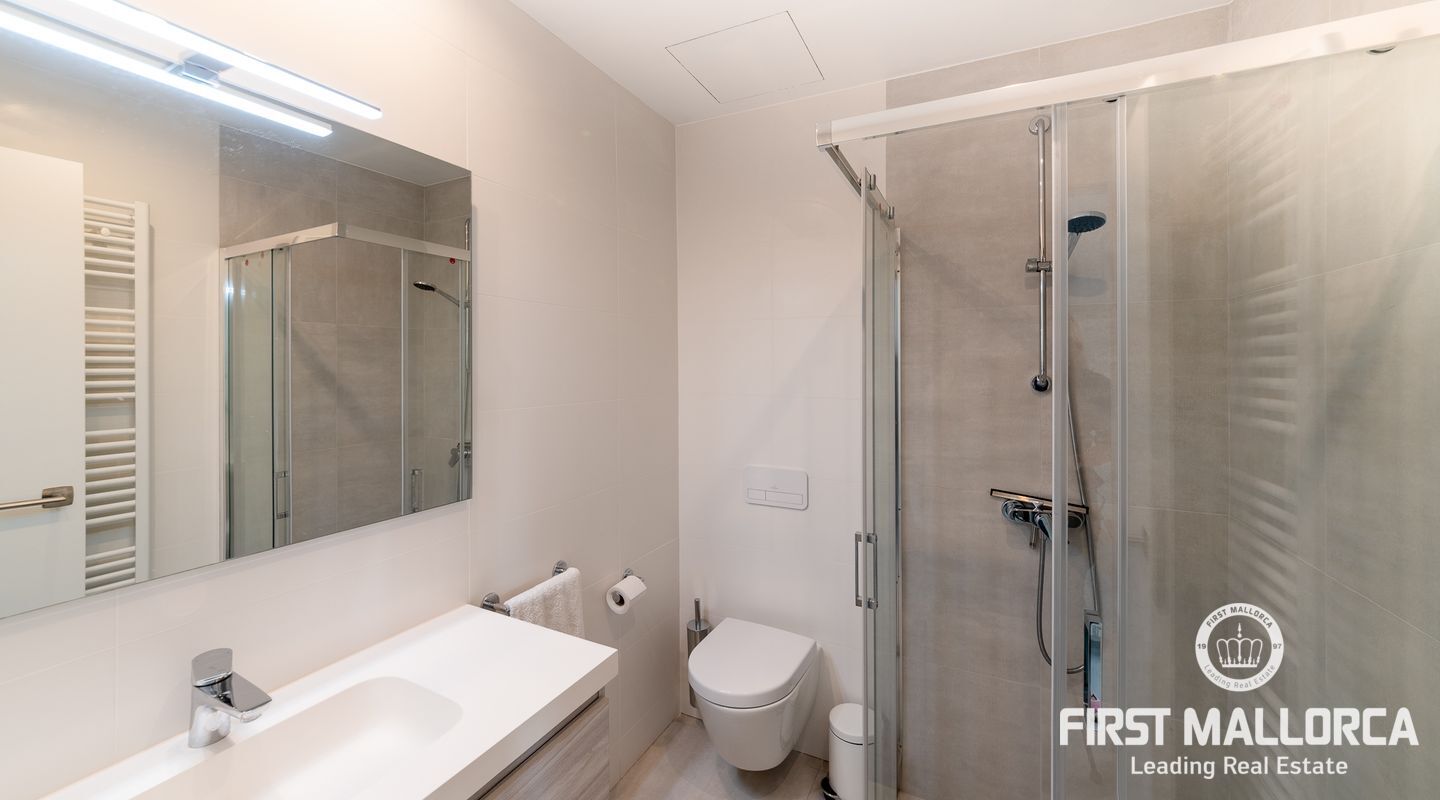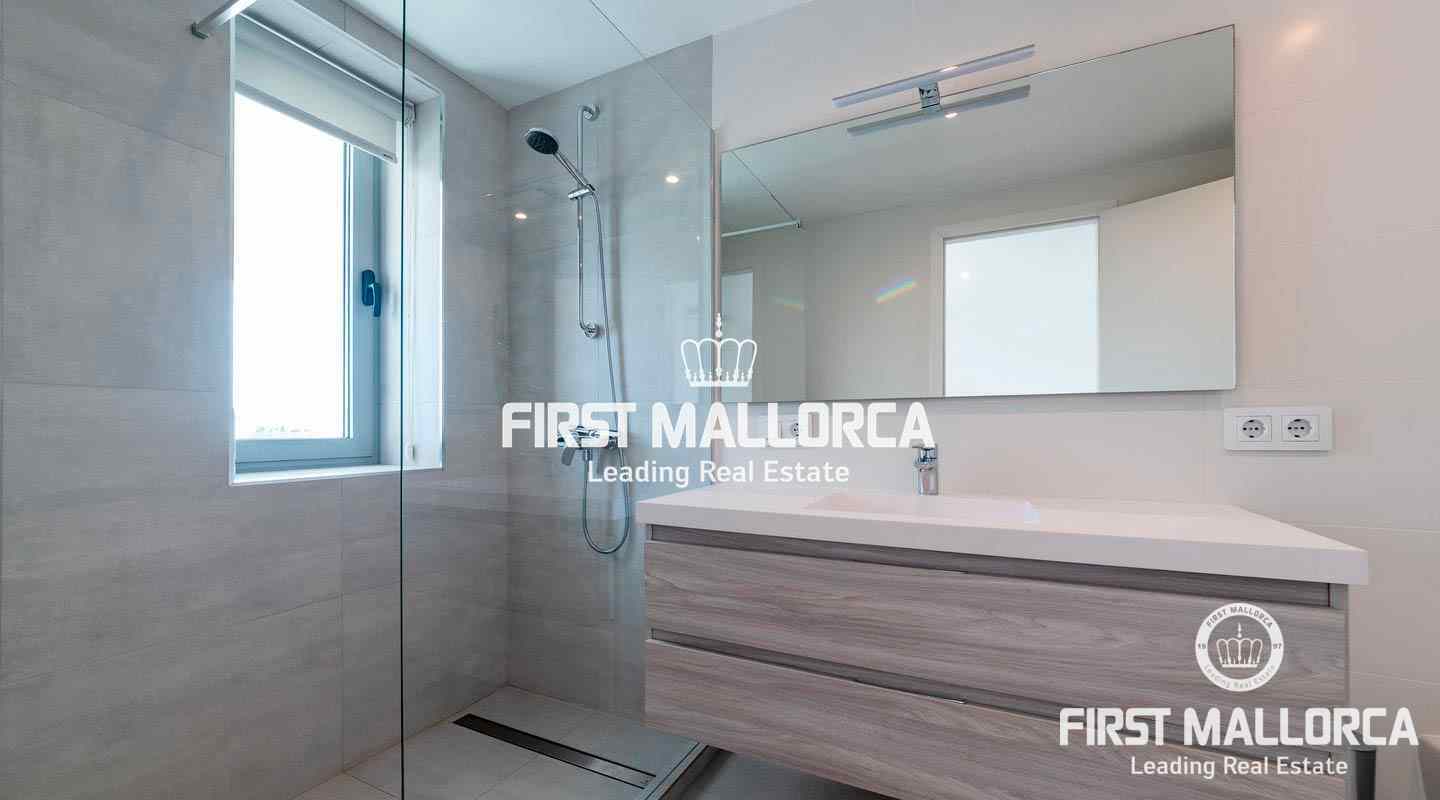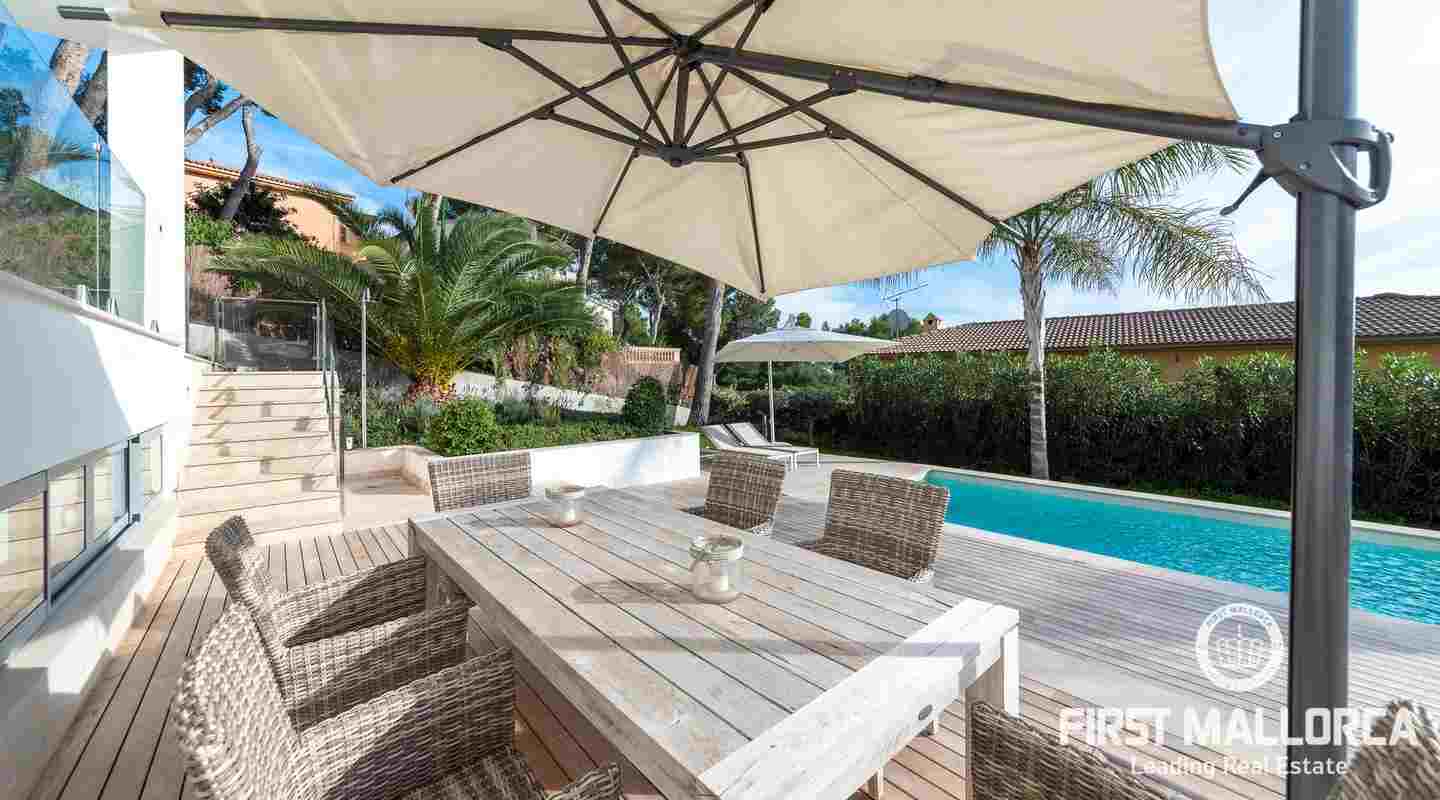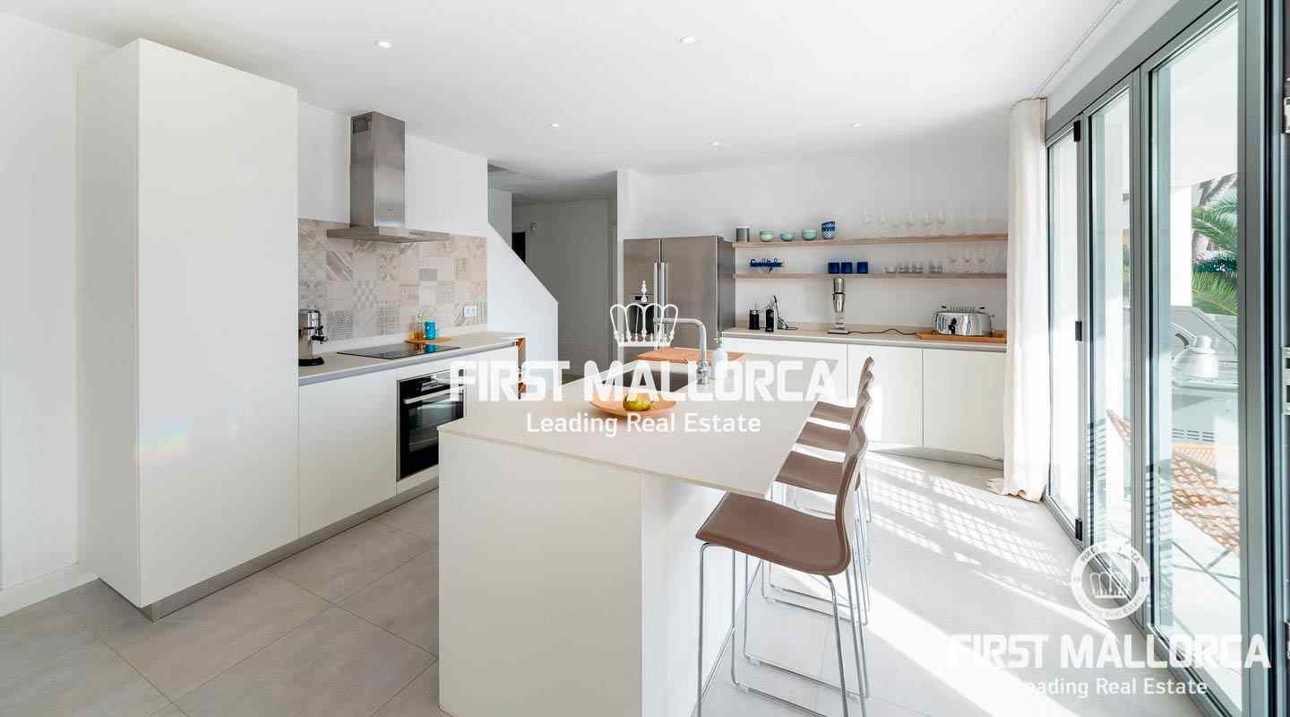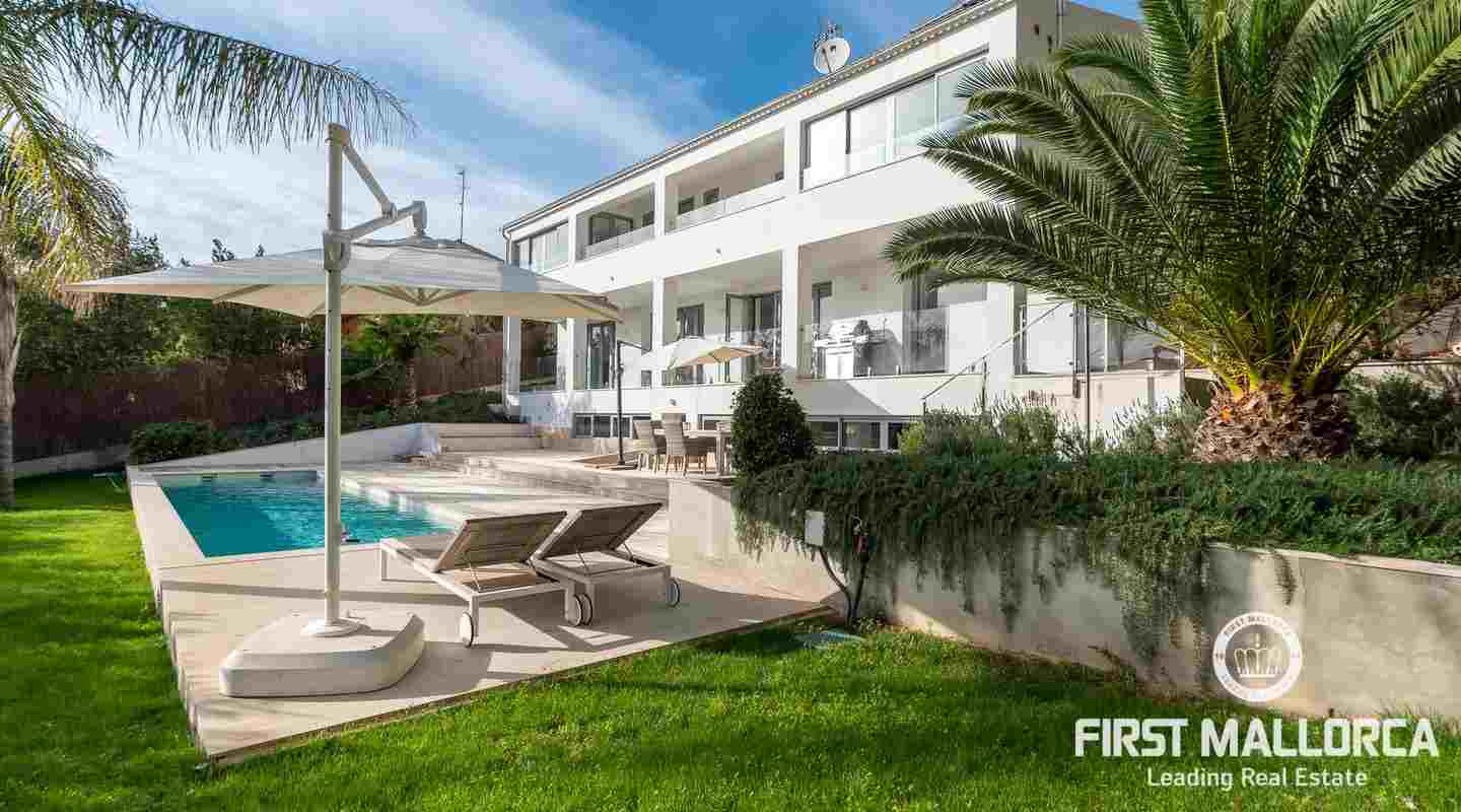 Denna eleganta villa med havsutsikt i Costa d'en Blanes har nyligen moderniserats helt och hållet enligt nya byggnormer och imponerar nu med sin moderna och fräscha design. Fastigheten som vetter mot söder har ett stort, platt utomhusområde med pool och gräsmattor, vilket gör den särskilt lämplig för familjer, men också för alla som älskar utomhuslivet och vill njuta av den mallorcanska solen. På bottenvåningen i den ljusa villan finns det öppna vardagsrummet och matplatsen med ett öppet kök samt ett sovrum och ett badrum. De övriga 3 sovrummen och badrummen ligger på övervåningen och är kopplade till en täckt terrass från vilken du har en underbar utsikt över Medelhavet. Fastigheten har en högkvalitativ interiör och är utrustad med luftkonditionering, centralvärme, vattenfilter, utrustat kök med Neff-apparater och ett garage. Dessutom finns det tillräckligt med förvaringsutrymme i källaren, en vinkällare och ytterligare ett stort rum som skulle kunna användas som till exempel ett gym.